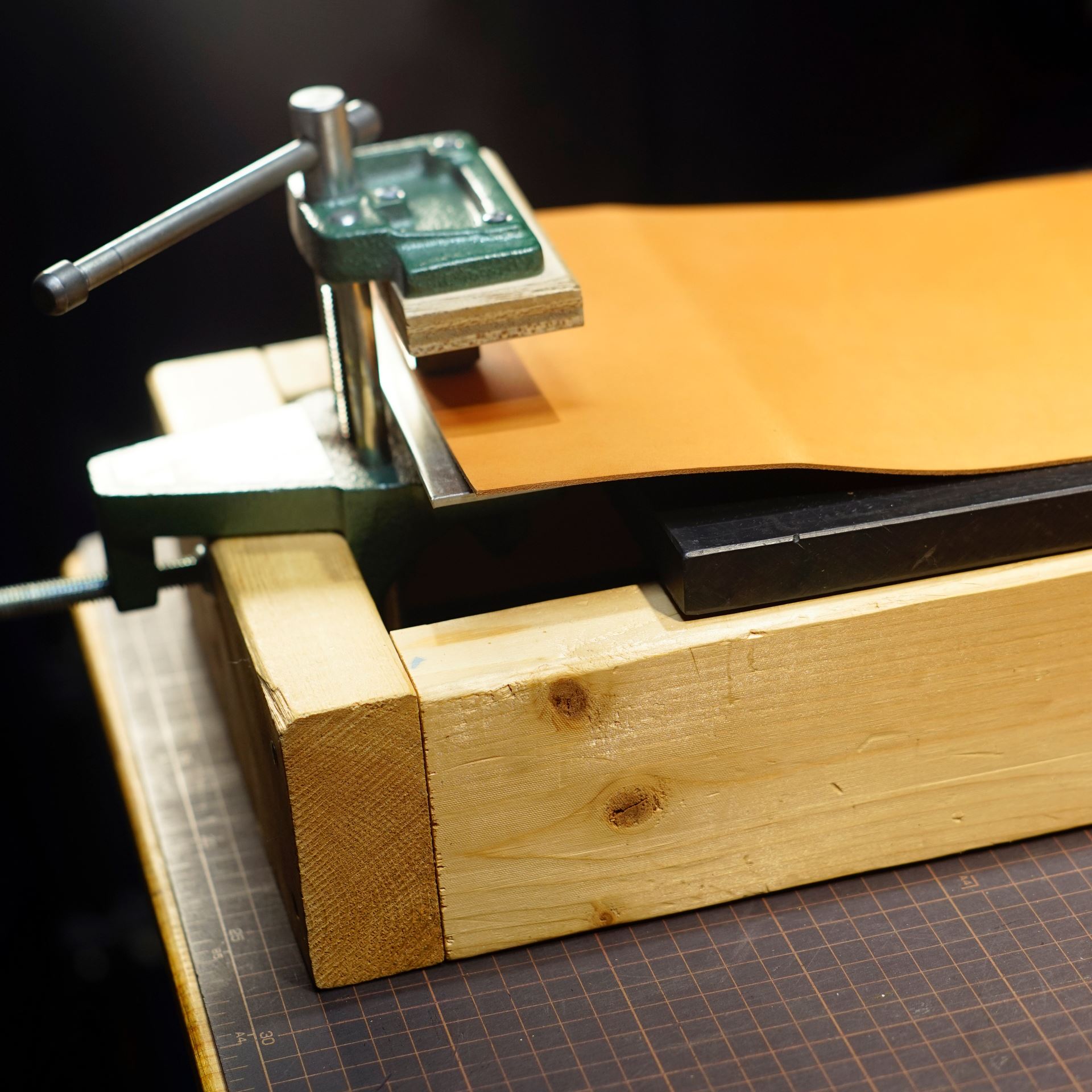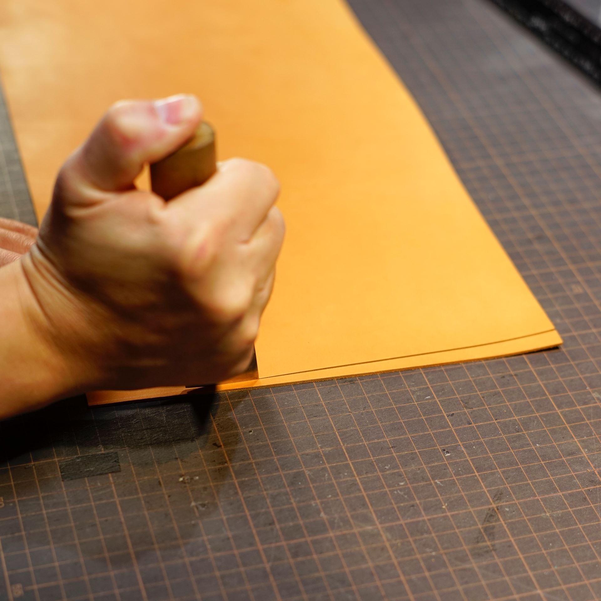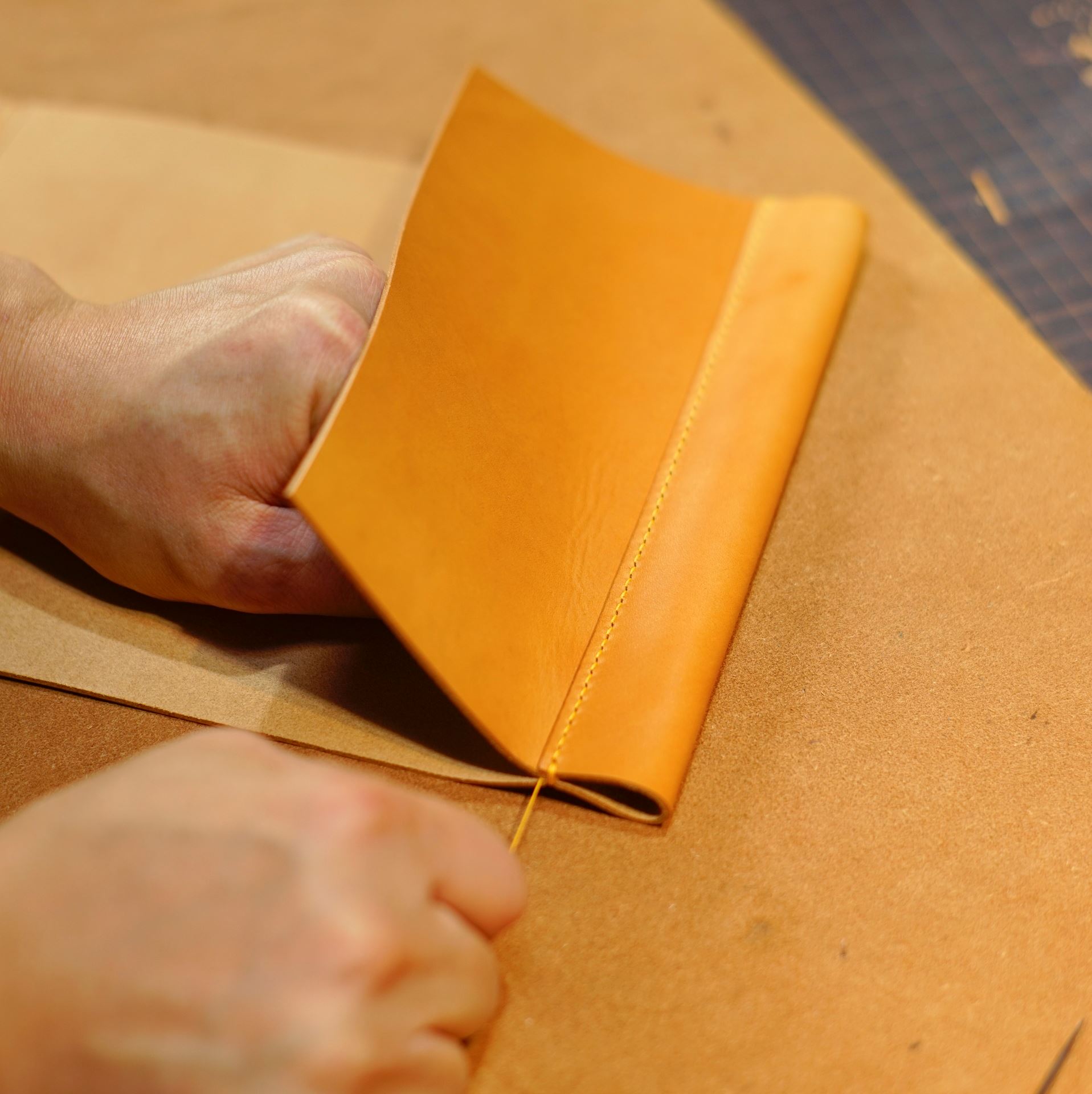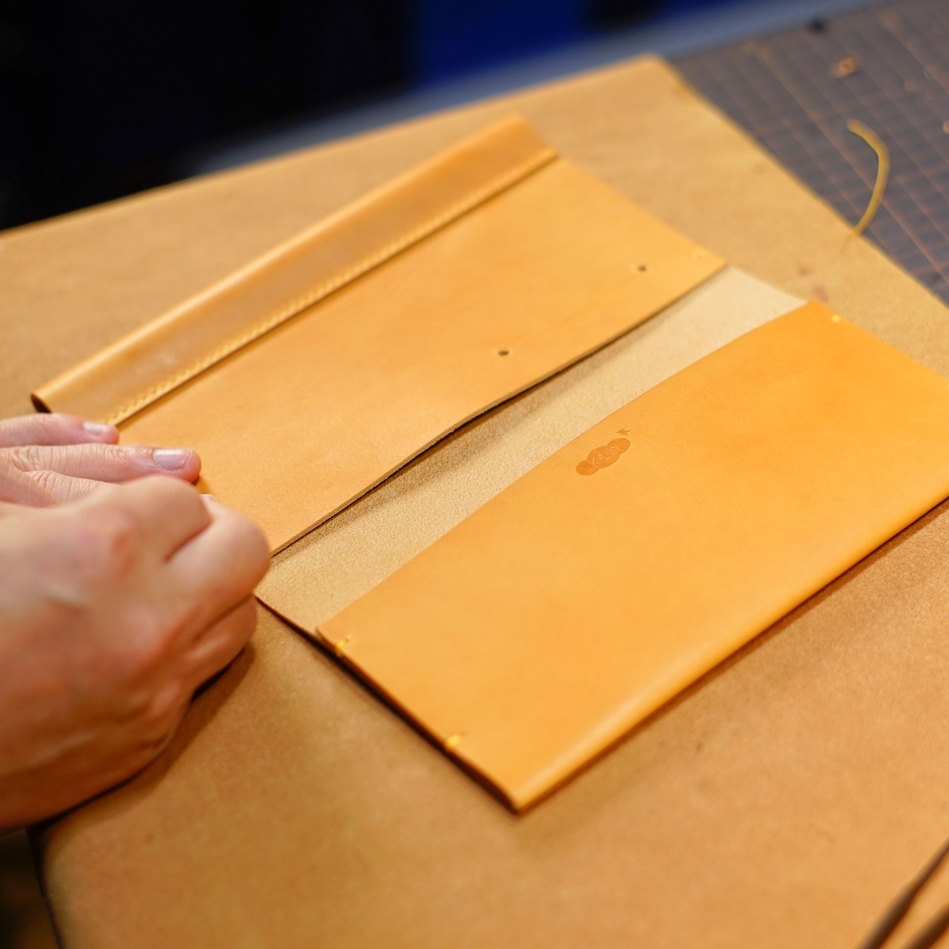 イタリアンソフトの生成りヴィンテージを切り出して目打ち、刻印を入れて手縫いの下準備です。