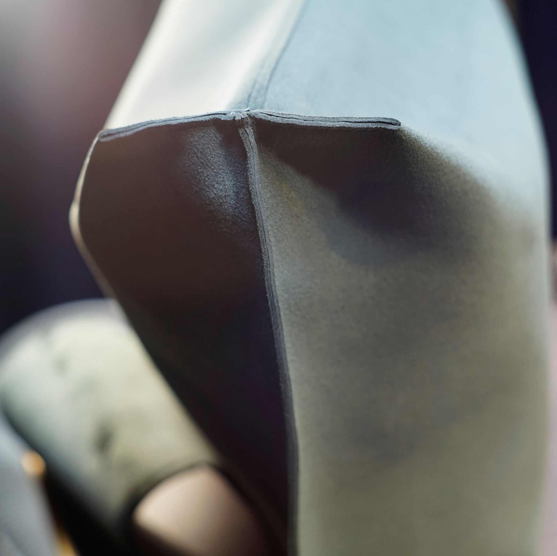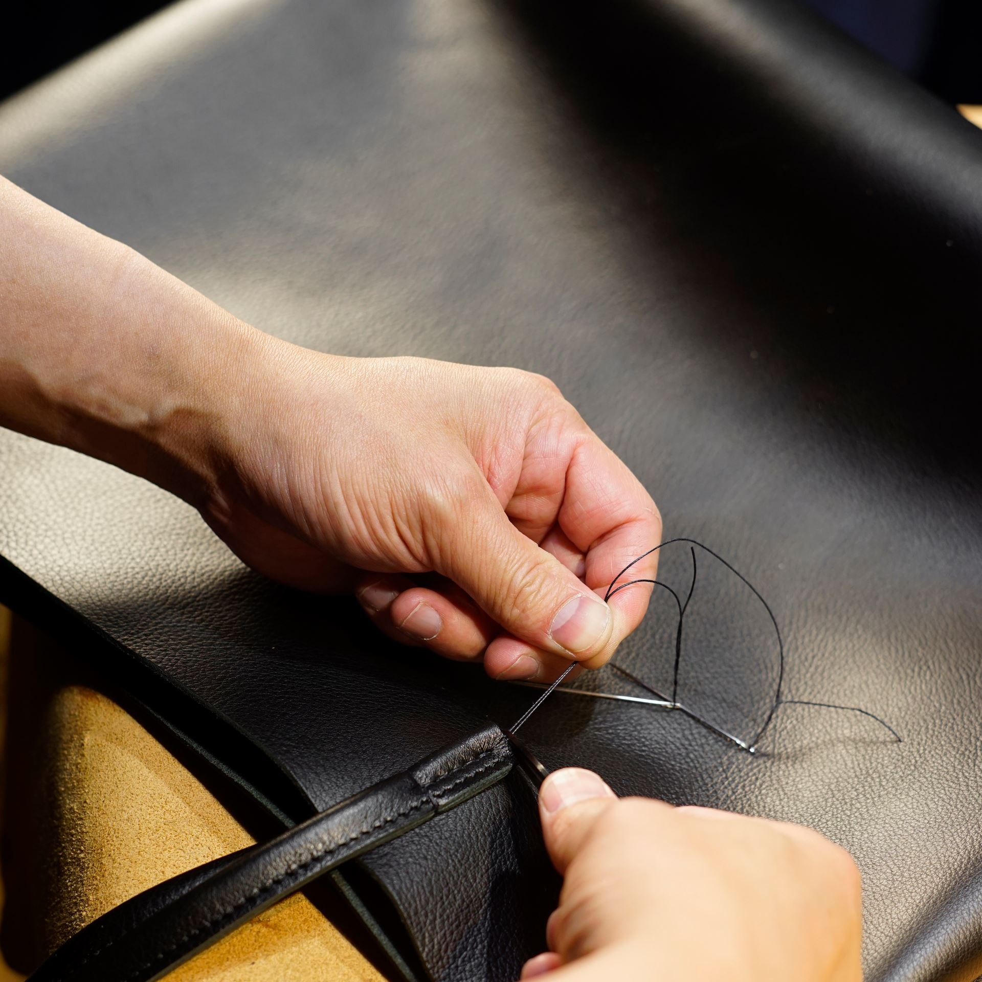 マチとカバンの縁、持ち手の付け根をリネン糸で手縫いします。縫いあがったらひっくり返して持ち手を縫います。