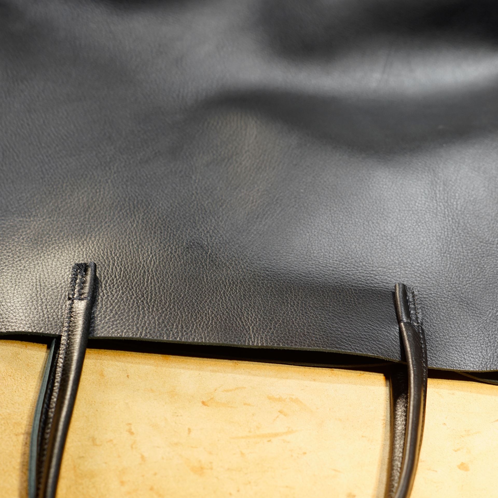 黒いシボ革からパーツを切り出します。本体、持ち手、内ポケットを揃えてサイズを整えます。