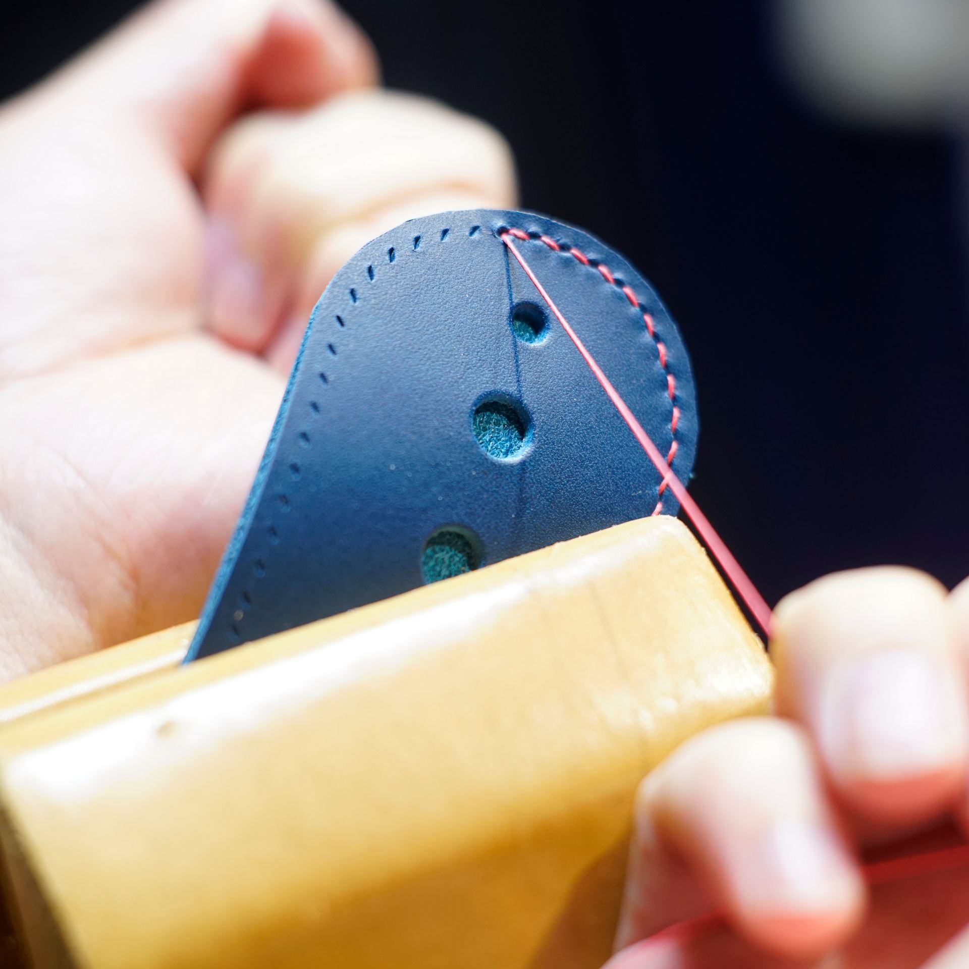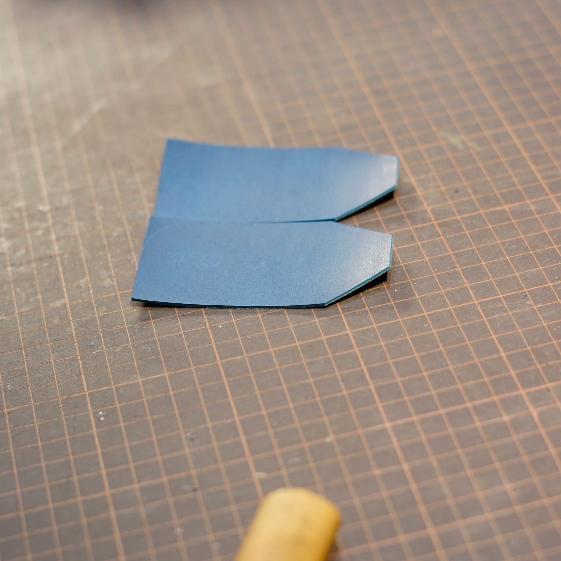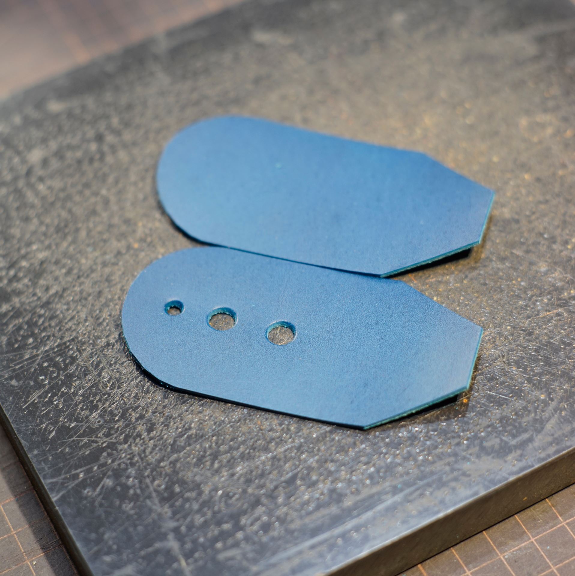 今回はイタリアンハードの青革で制作します。革をカットしてから目打ちと穴あけをします。
