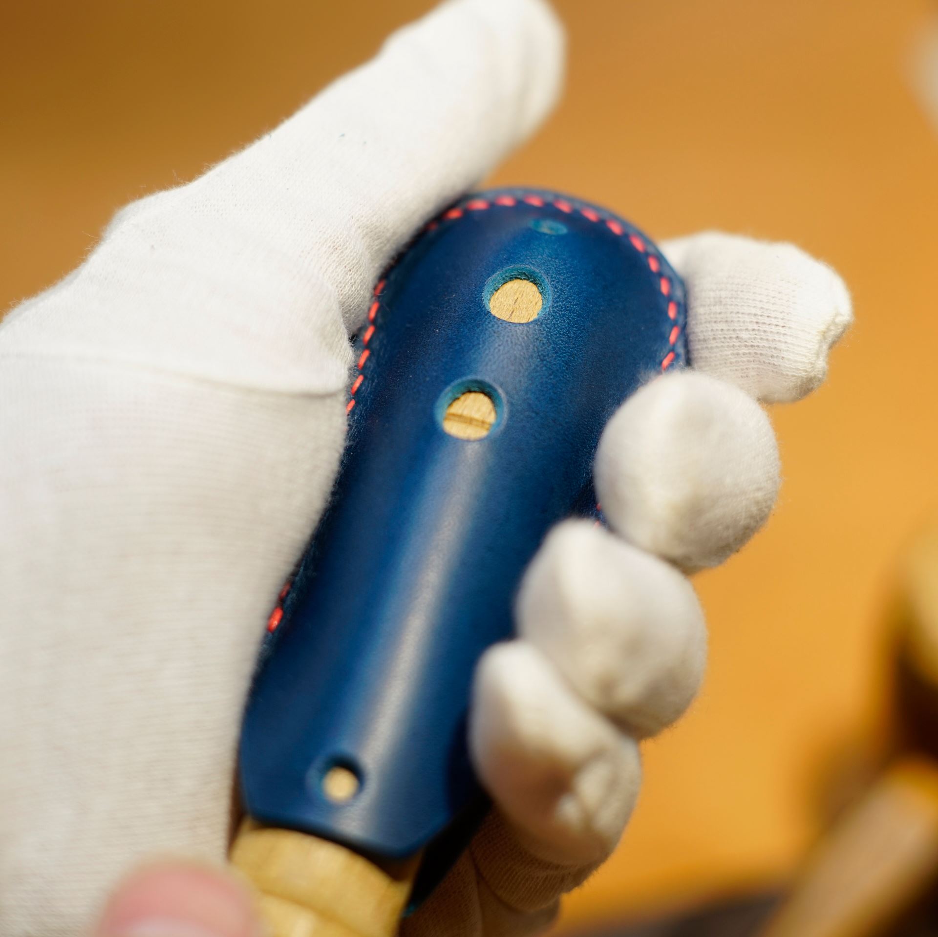 木の棒をしっかりと差し込んで、厚みのあるリモコンの癖をつけてコバを磨きで完成となります。