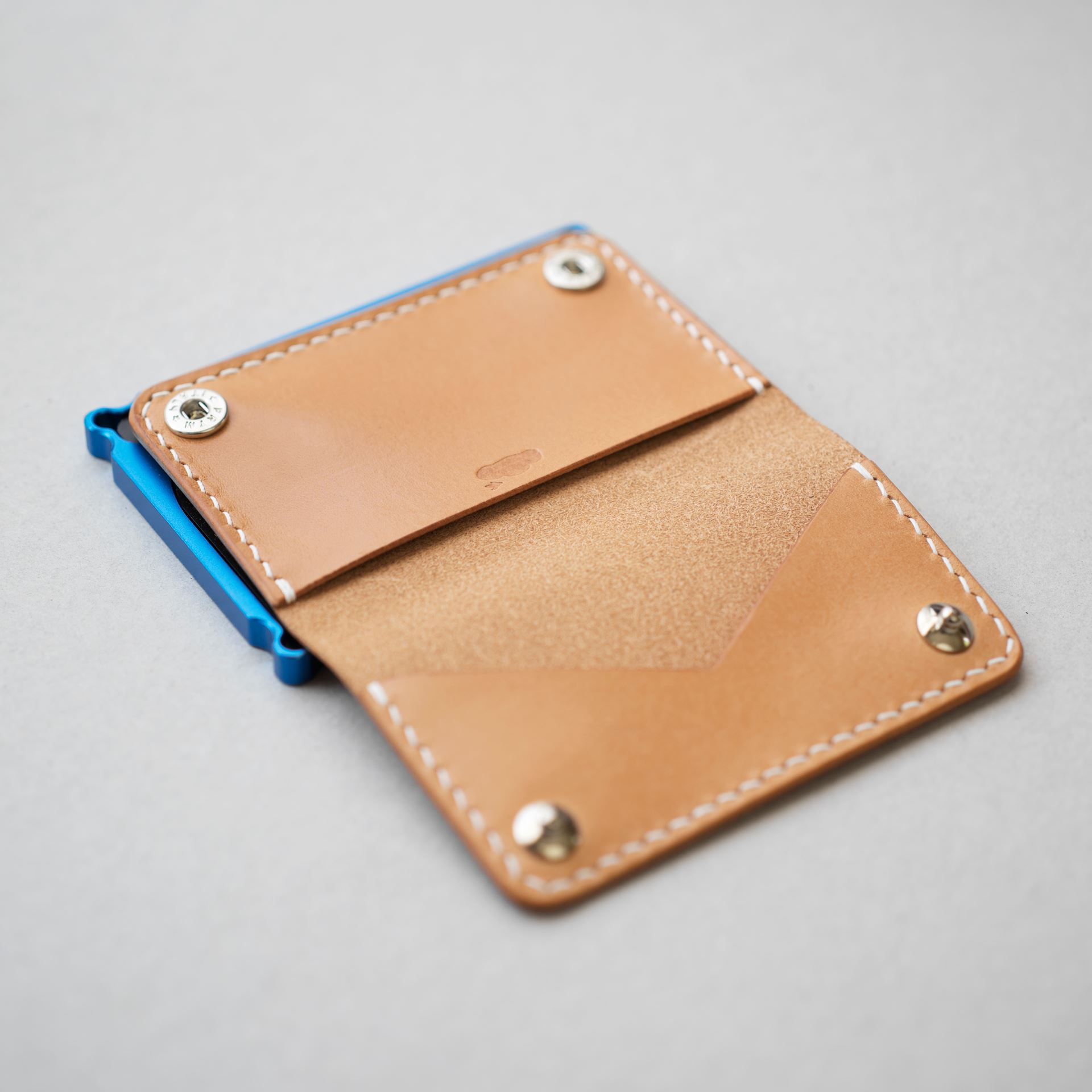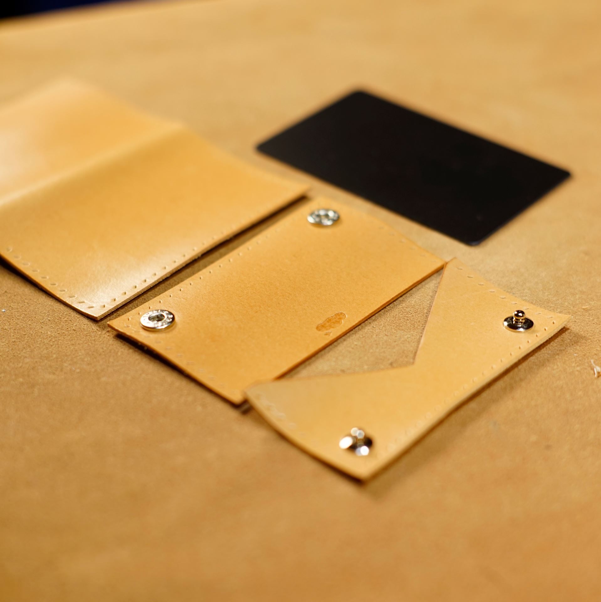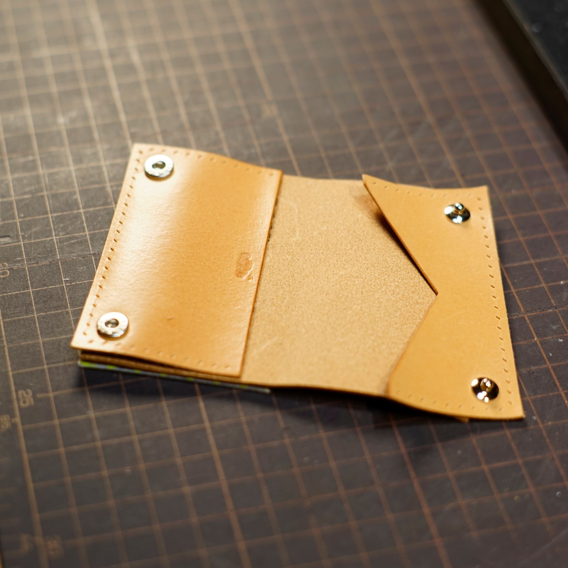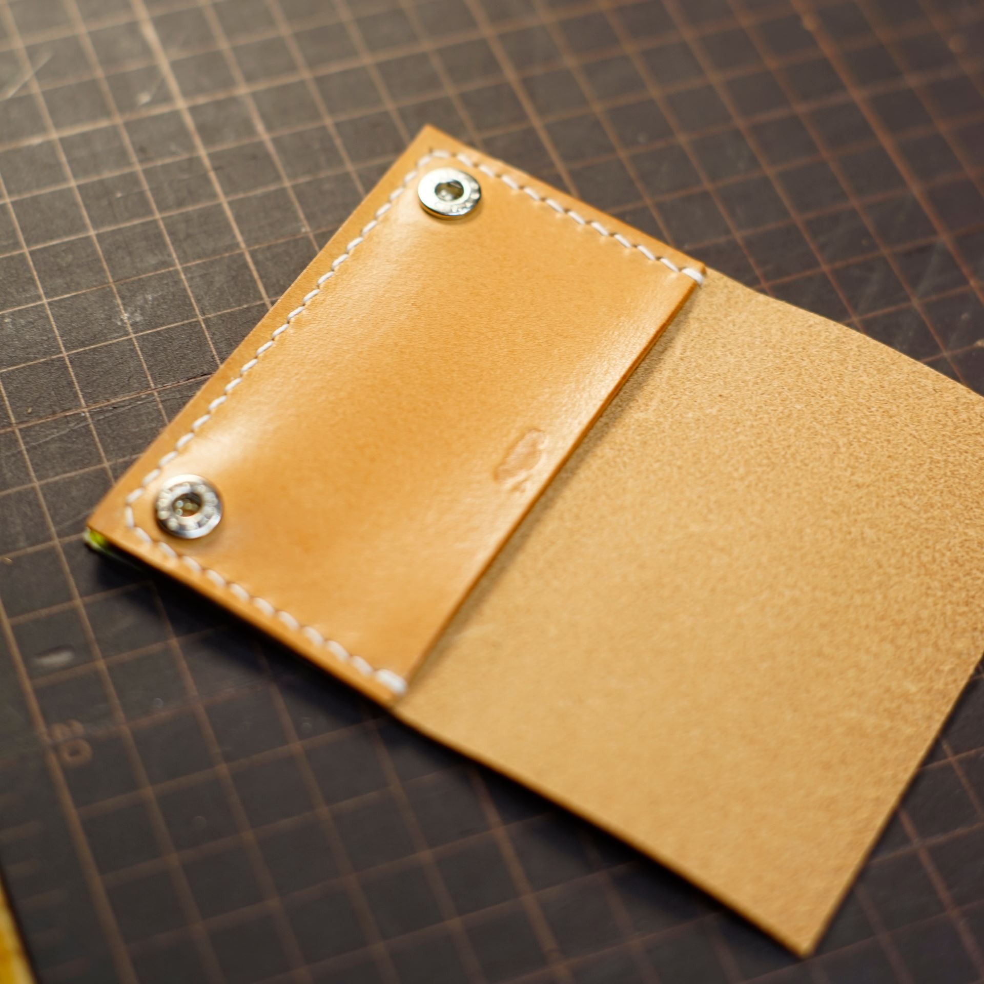 今回制作するのは生成りヴィンテージを使用したミニマリスト財布です。パーツ切出しと目打ち、打刻、プリムホックの取り付けを終えております。