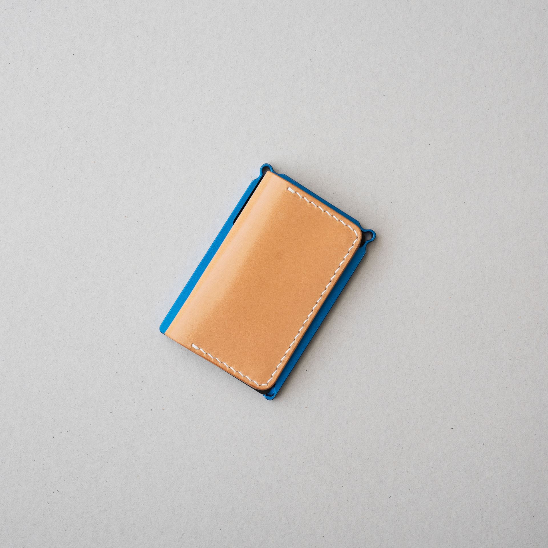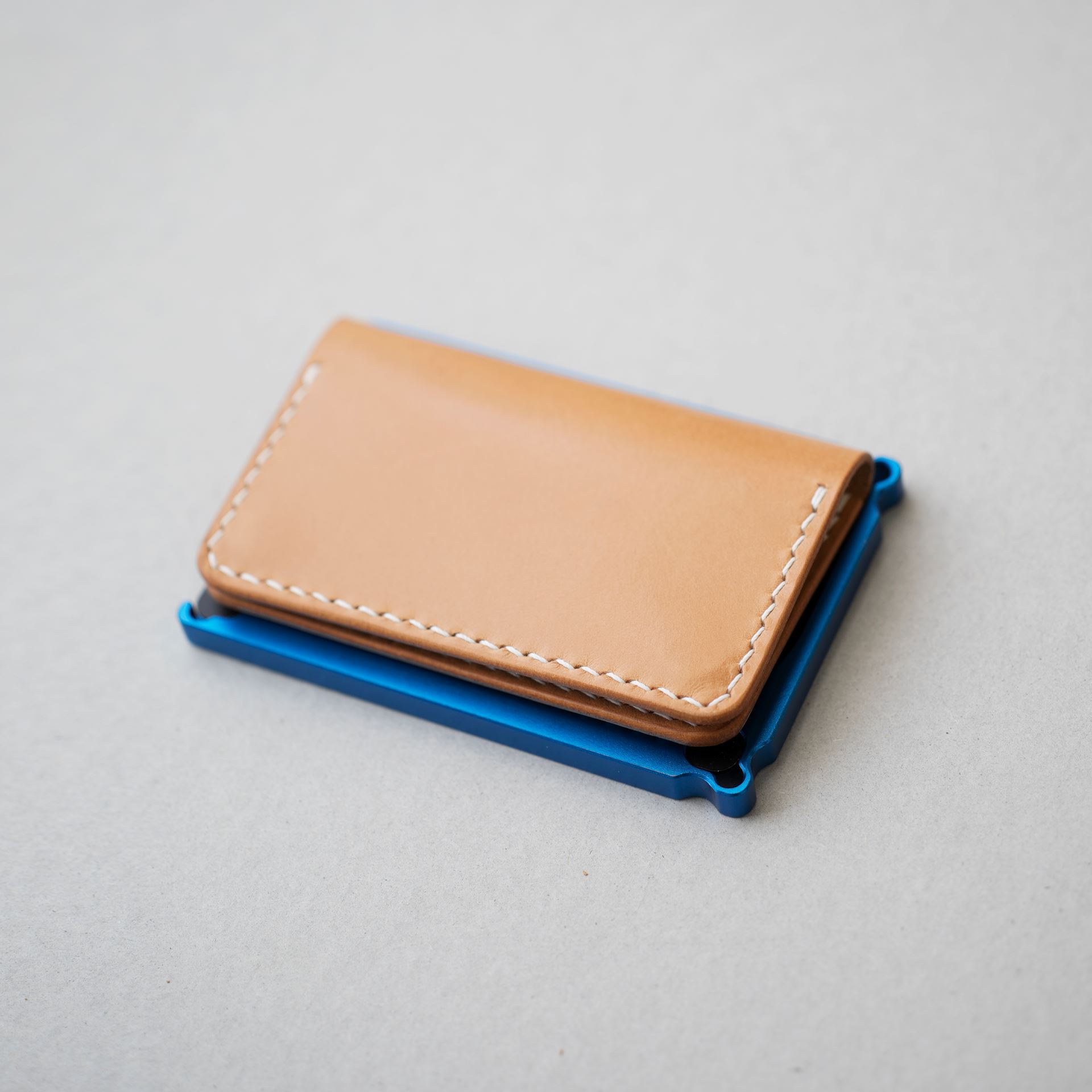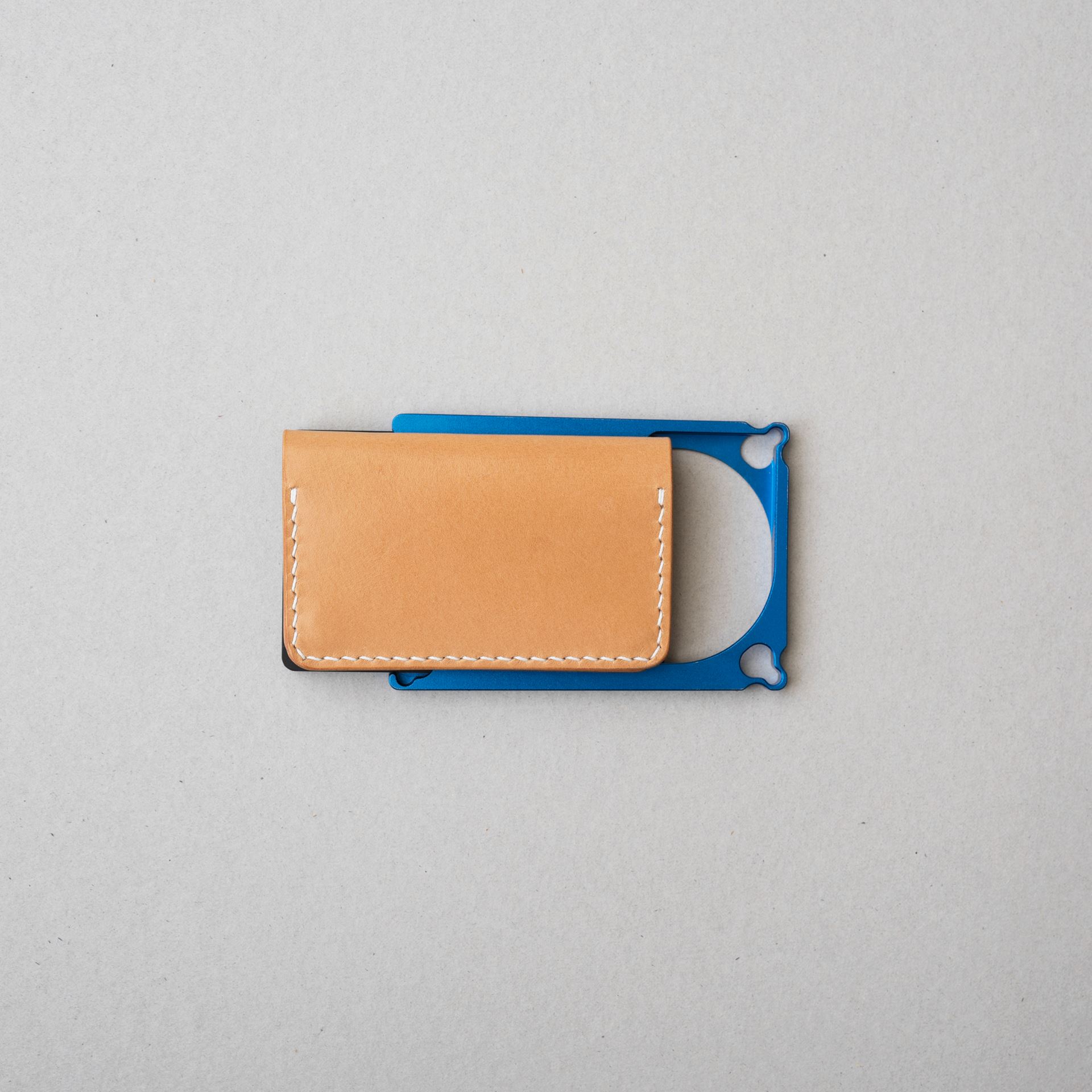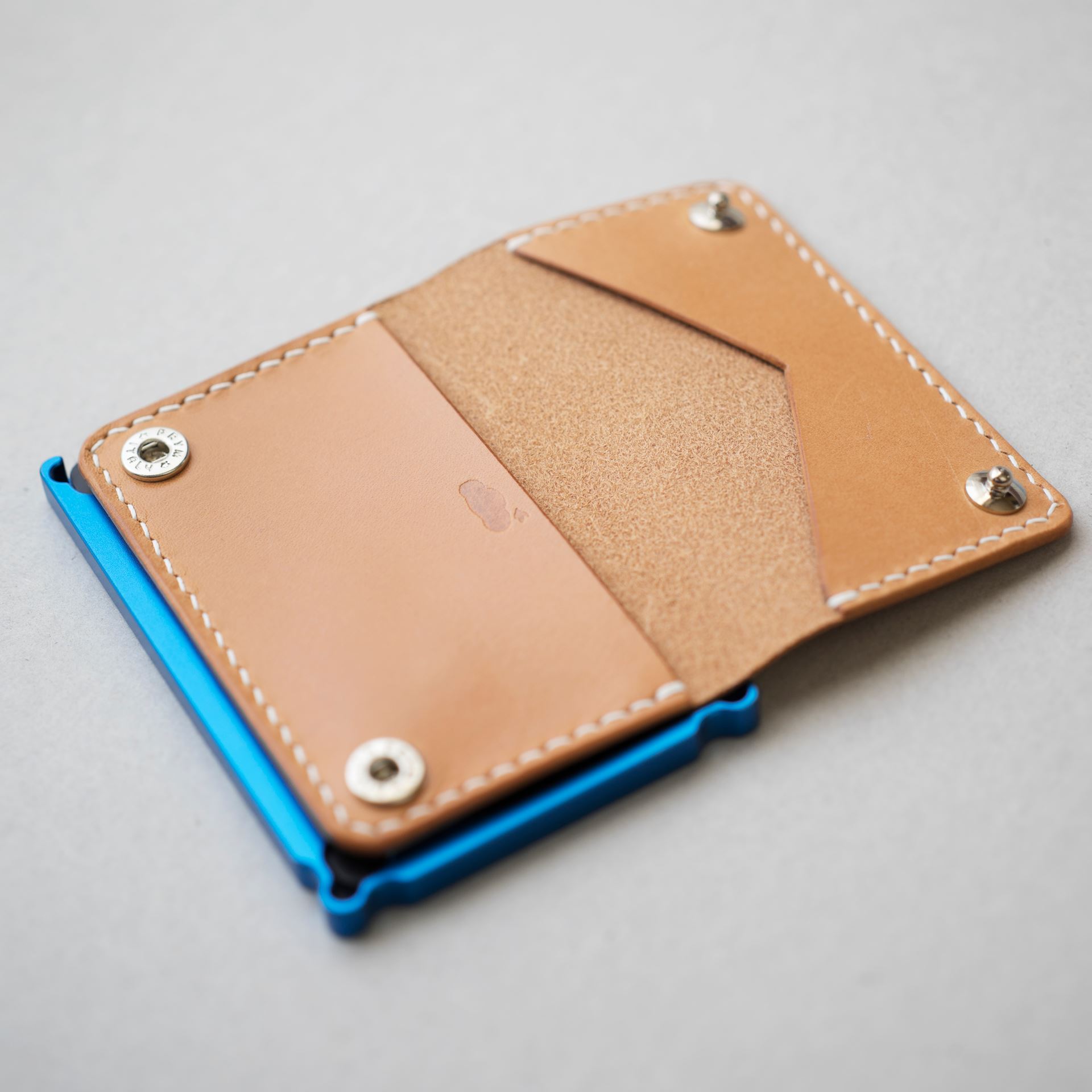 今回制作するのは生成りヴィンテージを使用したミニマリスト財布です。パーツ切出しと目打ち、打刻、プリムホックの取り付けを終えております。