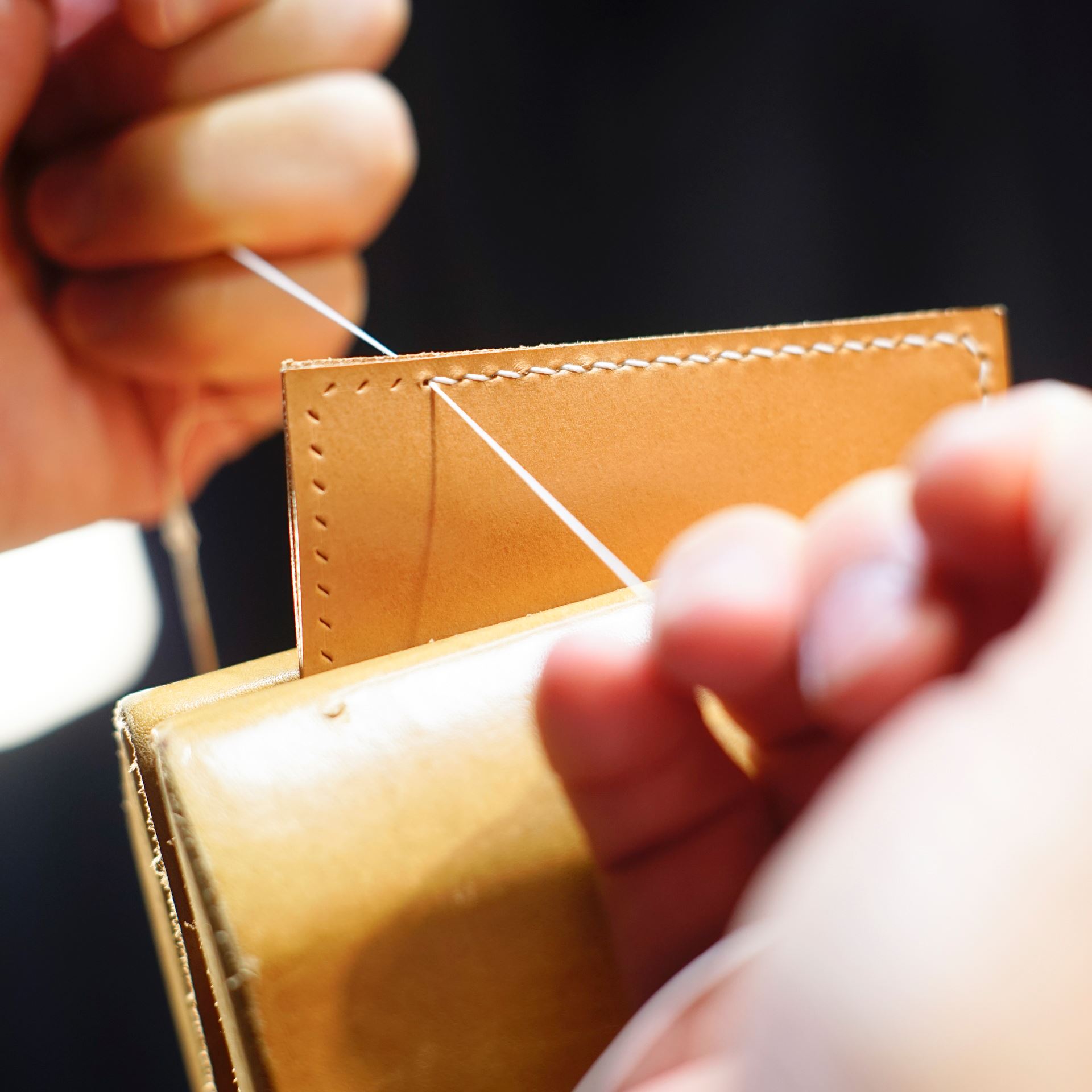 本体パーツにカードを縫い付けてから各ポケットを組み上げていきます。ロウビキ済みの六花リネン糸07番『白』で手縫いします。
