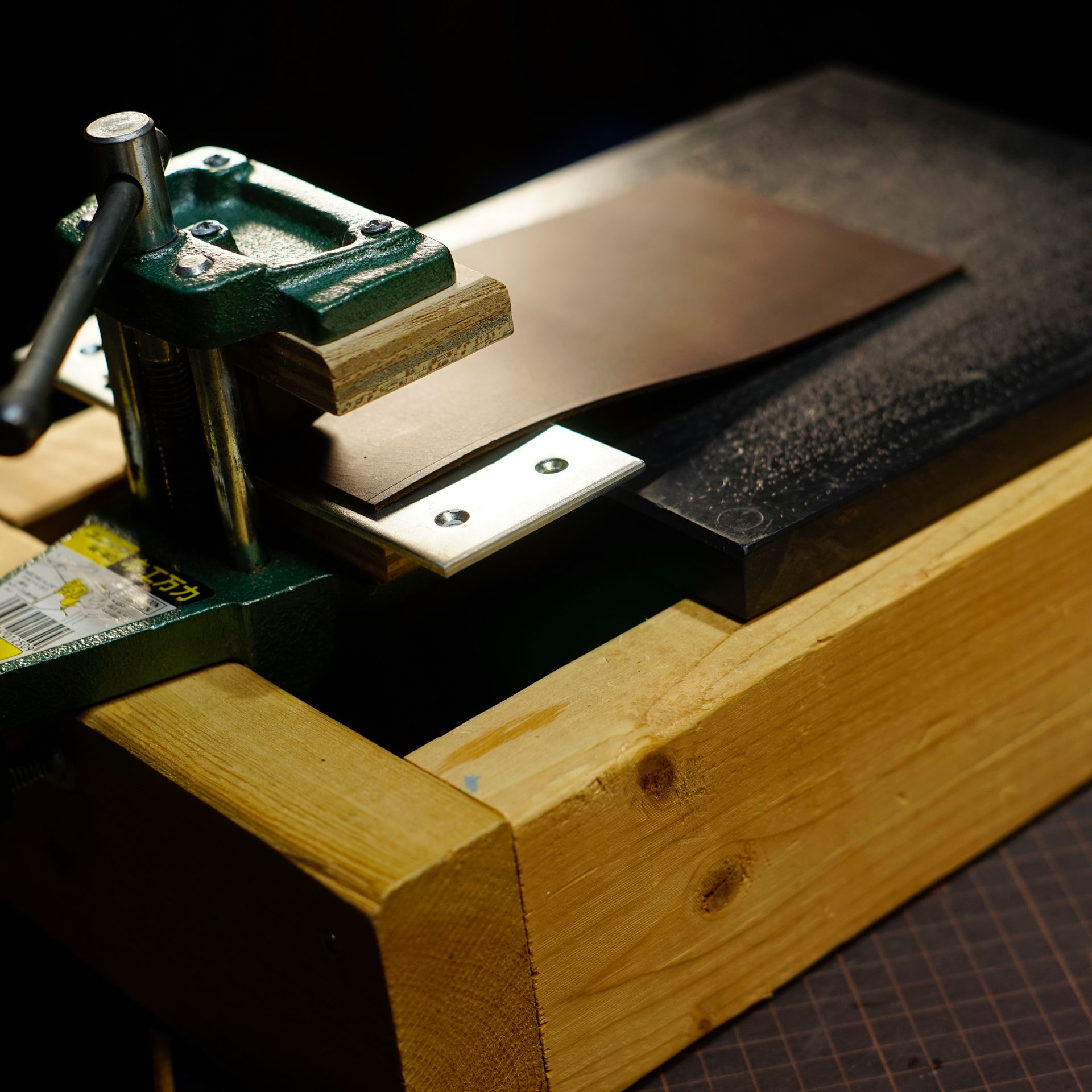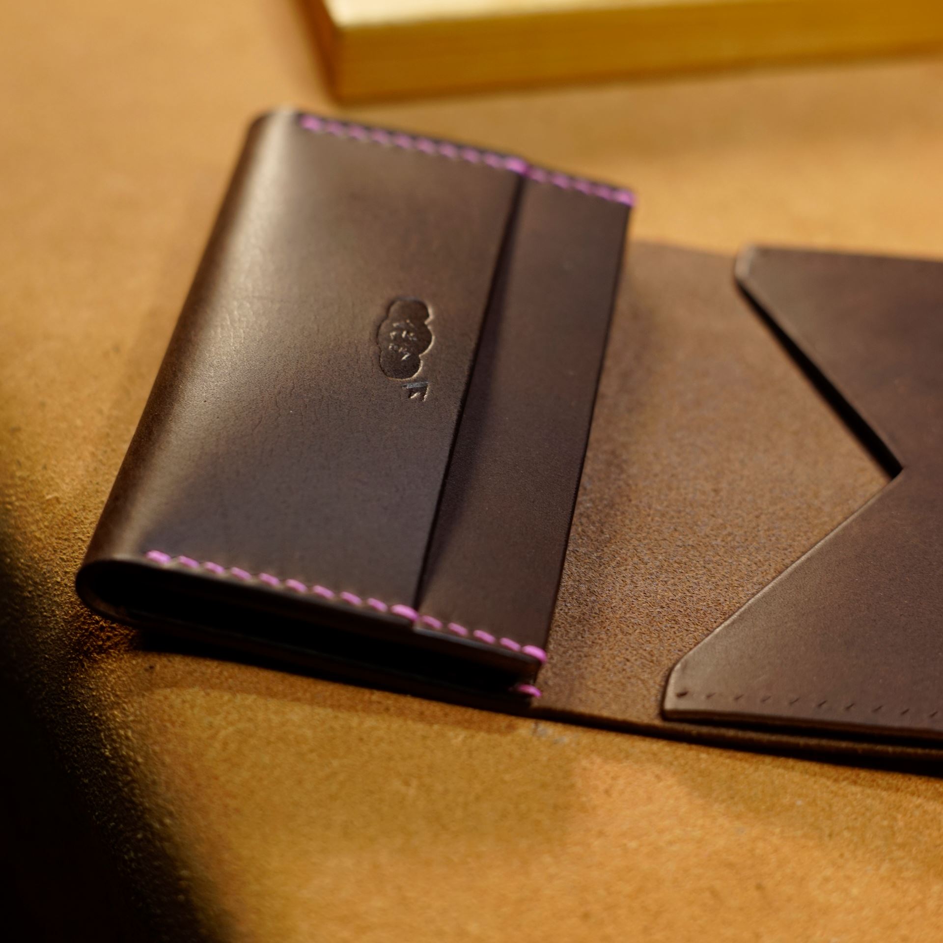 今回ご指定の革はイタリアンソフトのカスターニョになります。革をカットして刻印を打刻します。磨けるコバは先に磨いておきましょう。今回使用する糸は六花リネン糸の京紫です。