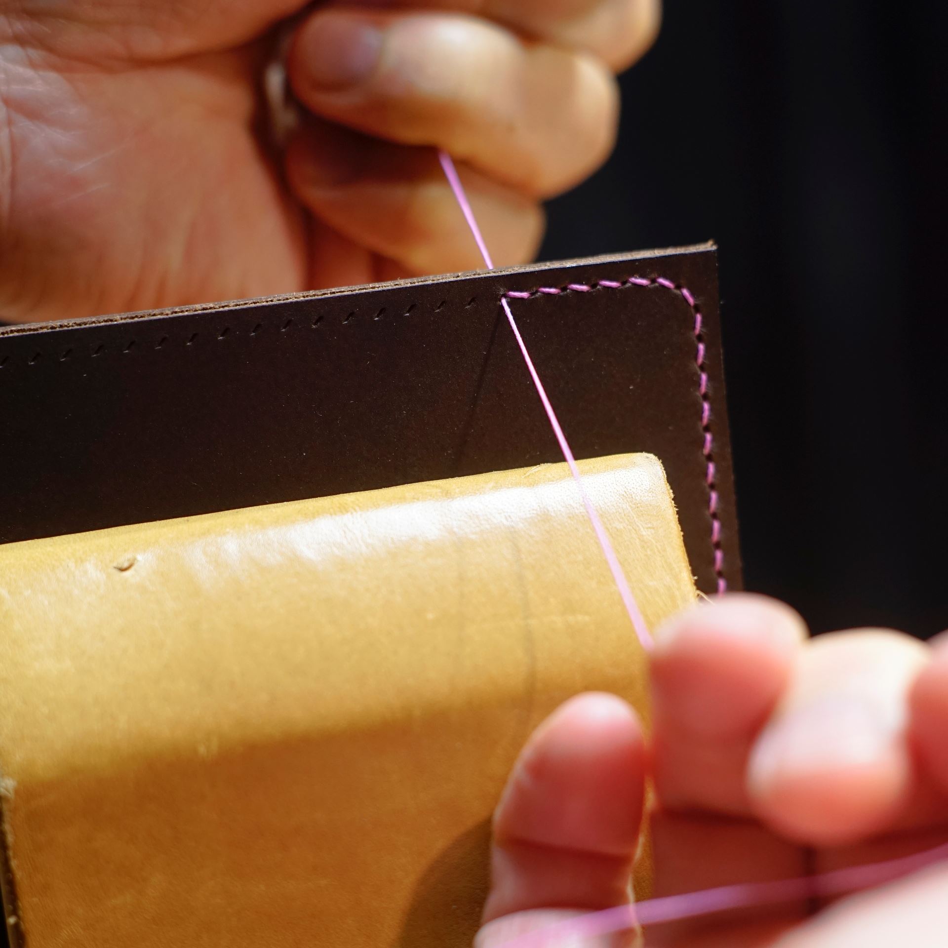 全てのステッチが終了しましたので、最後にコバ(革の断面)磨きで仕上げれば完成となります。
