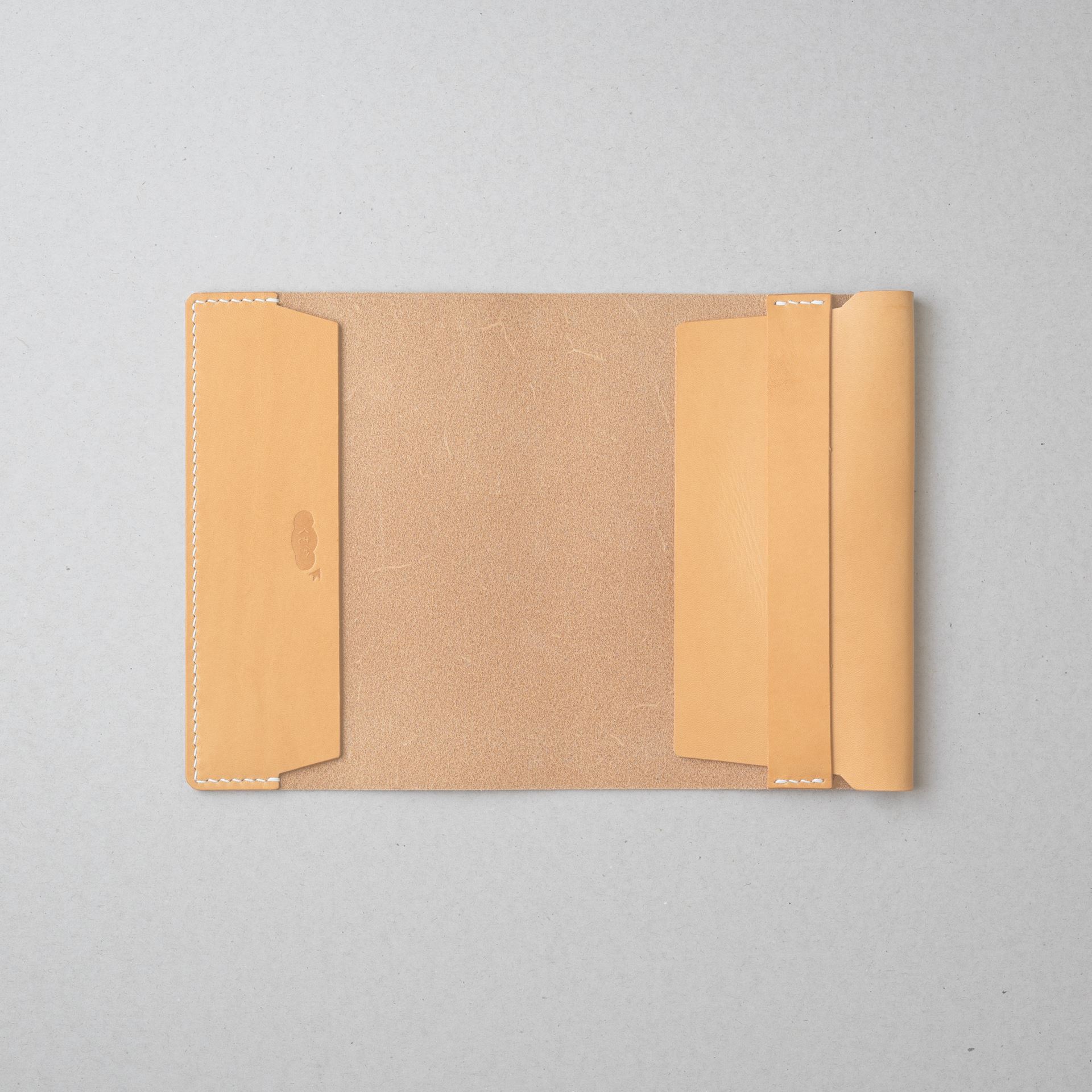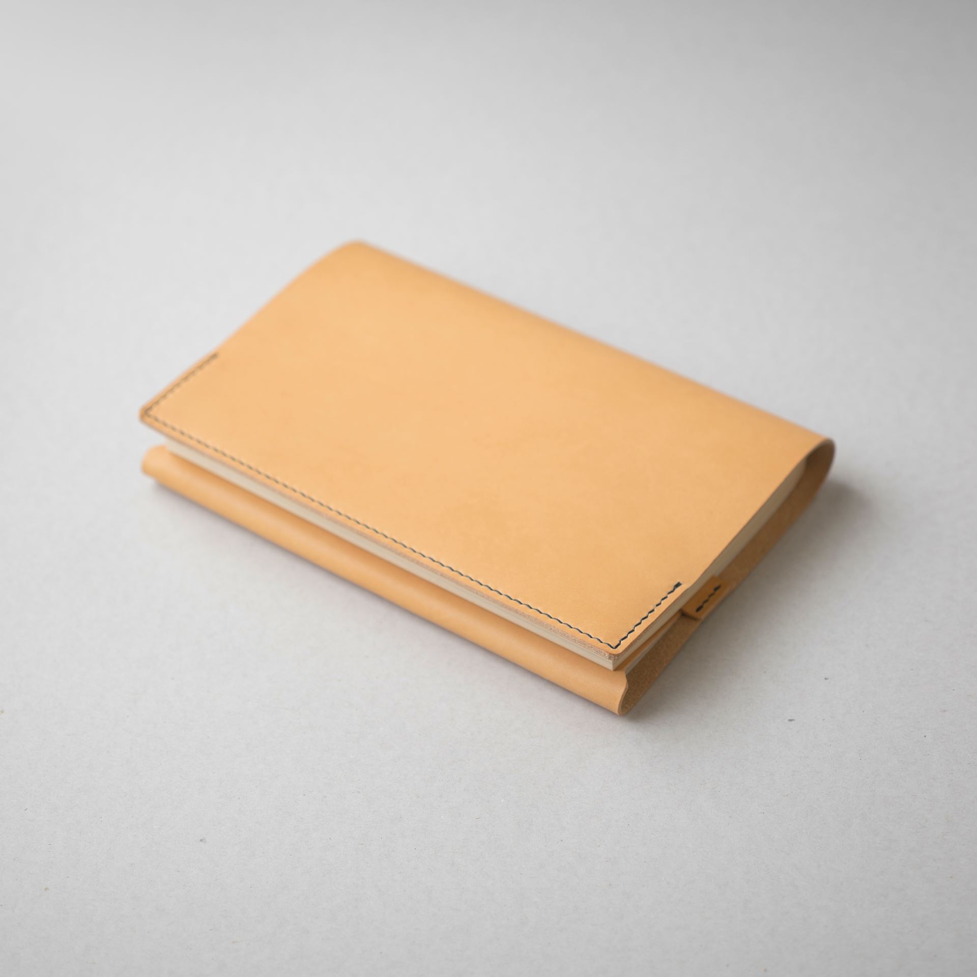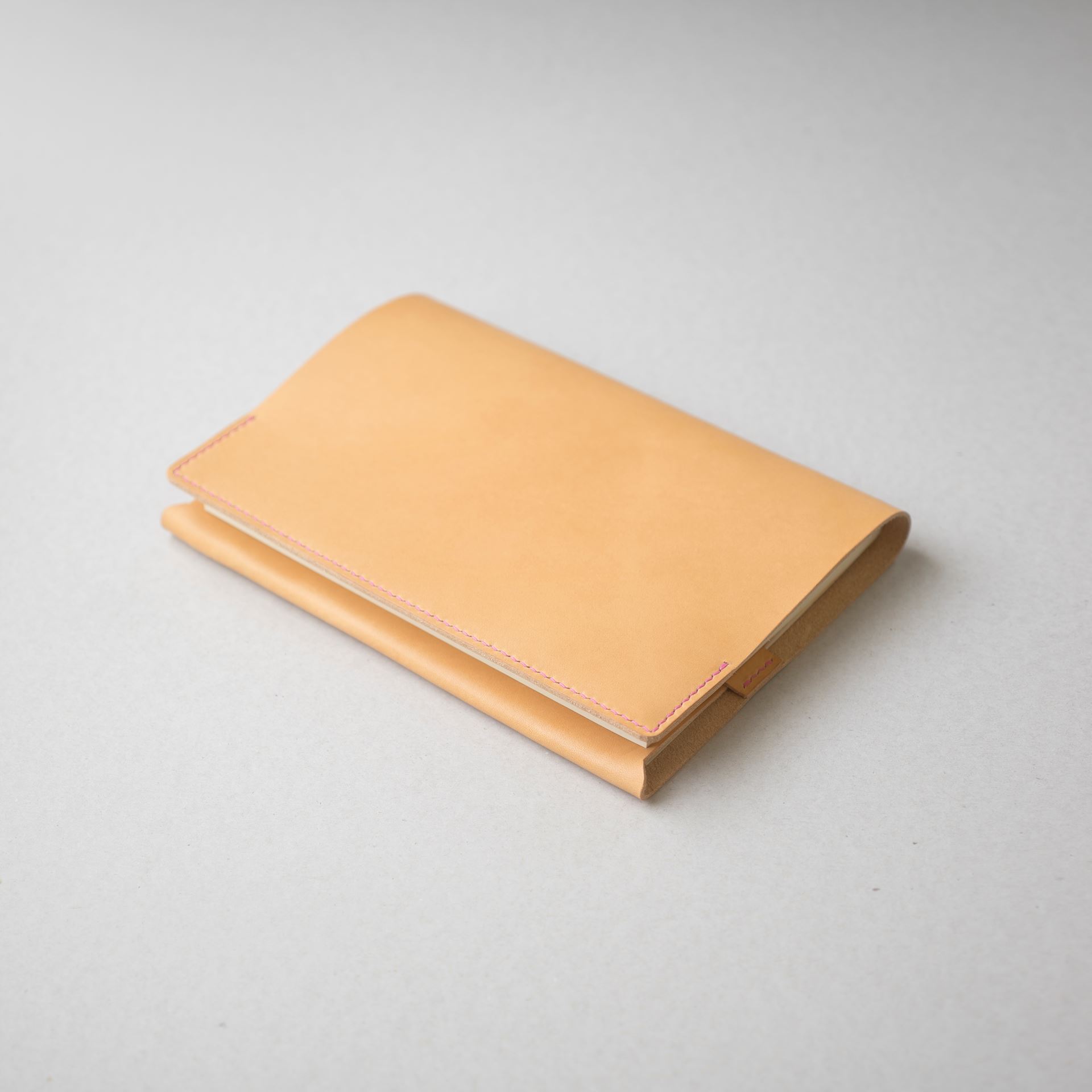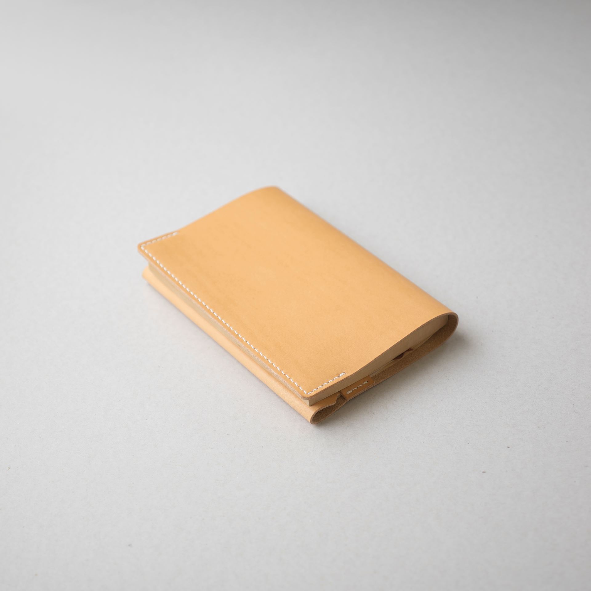 植物タンニン鞣し革に麻糸で手縫いを施したシンプルなつくりです。差込部にステッチを入れることで、ブックカバー1型をよりスマートに、本を読みやすく進化させました。