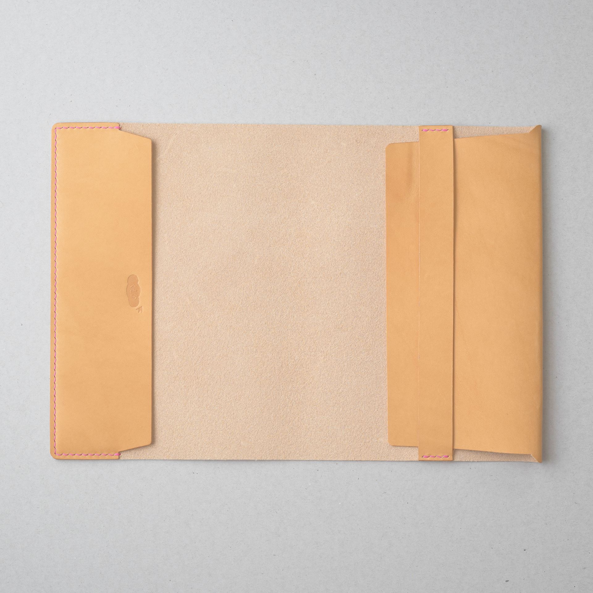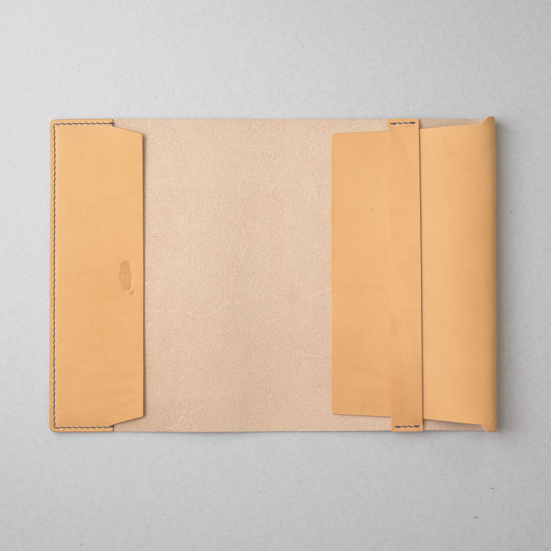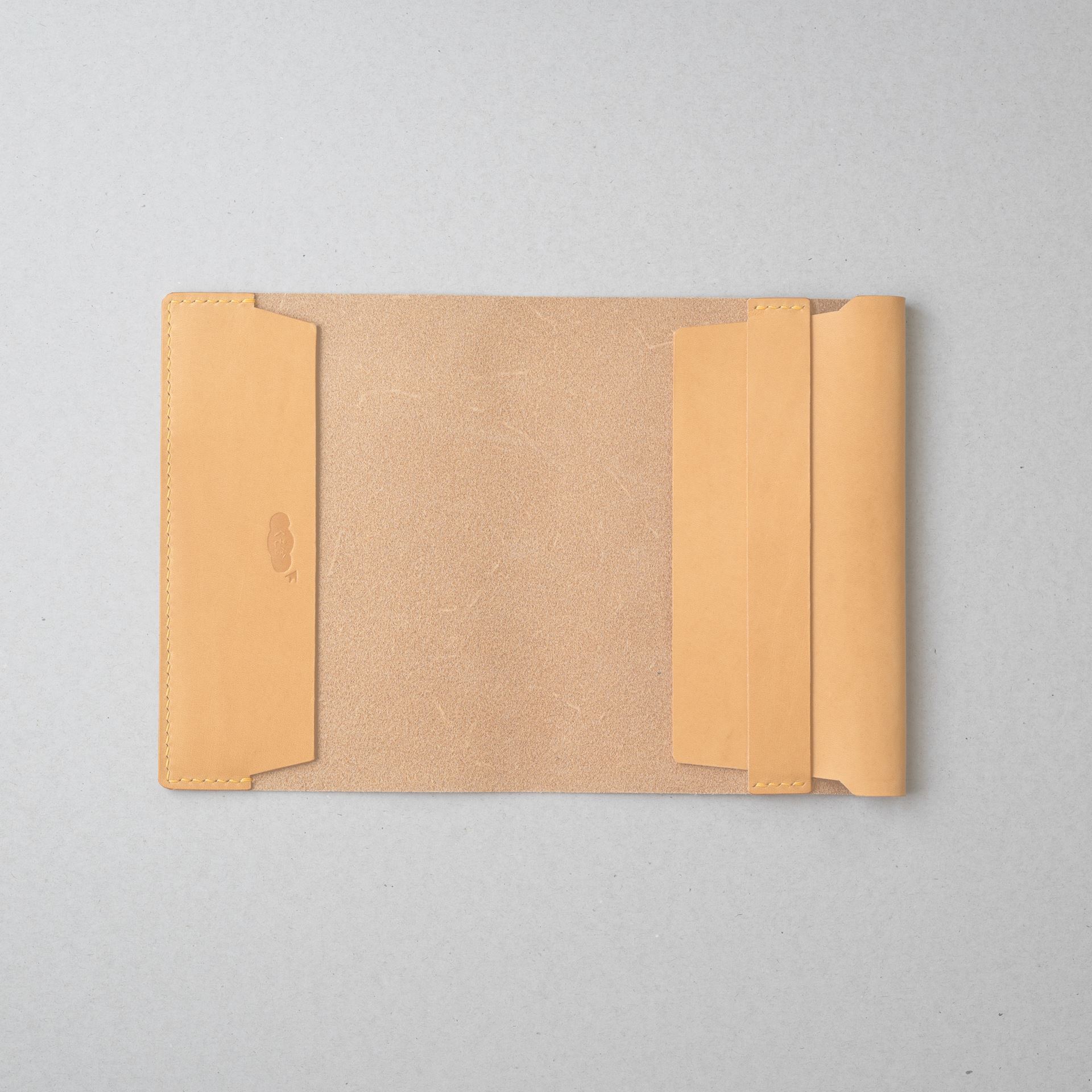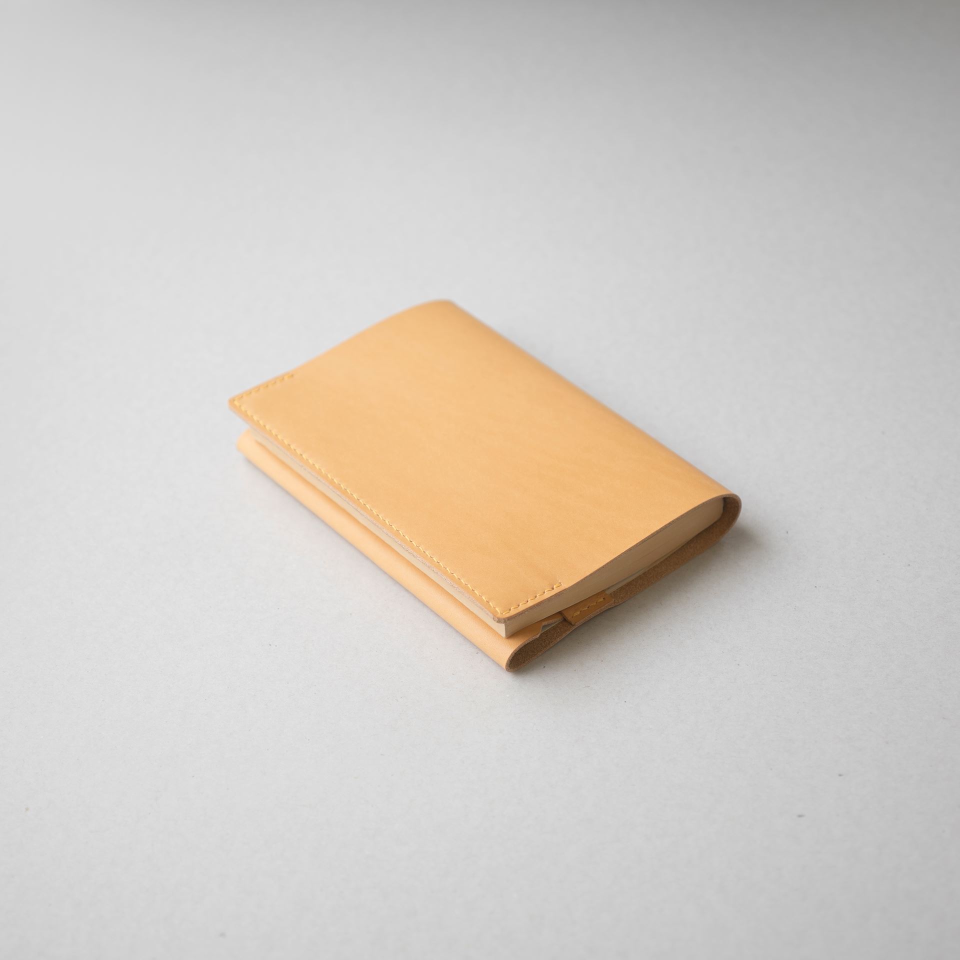 植物タンニン鞣し革に麻糸で手縫いを施したシンプルなつくりです。差込部にステッチを入れることで、ブックカバー1型をよりスマートに、本を読みやすく進化させました。
