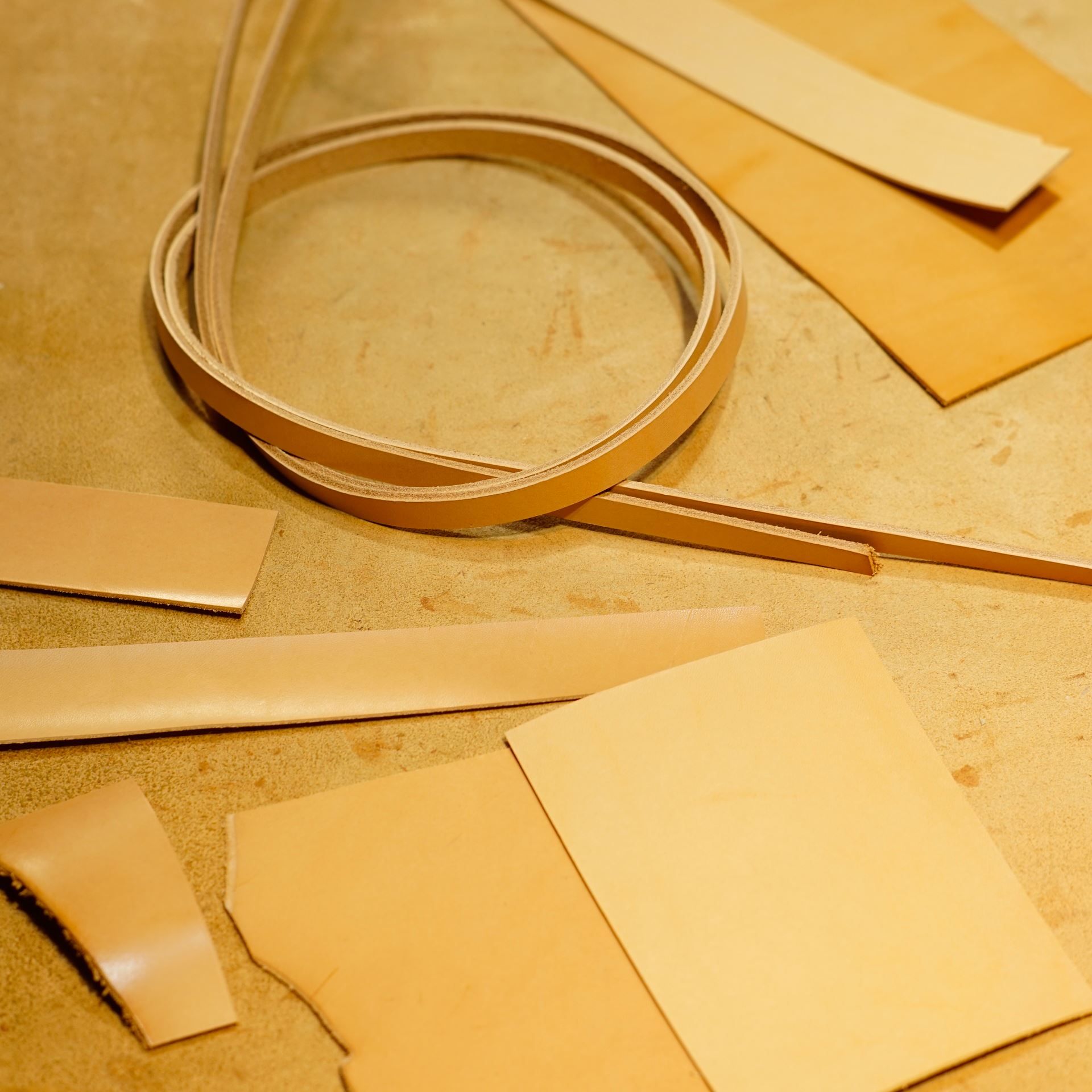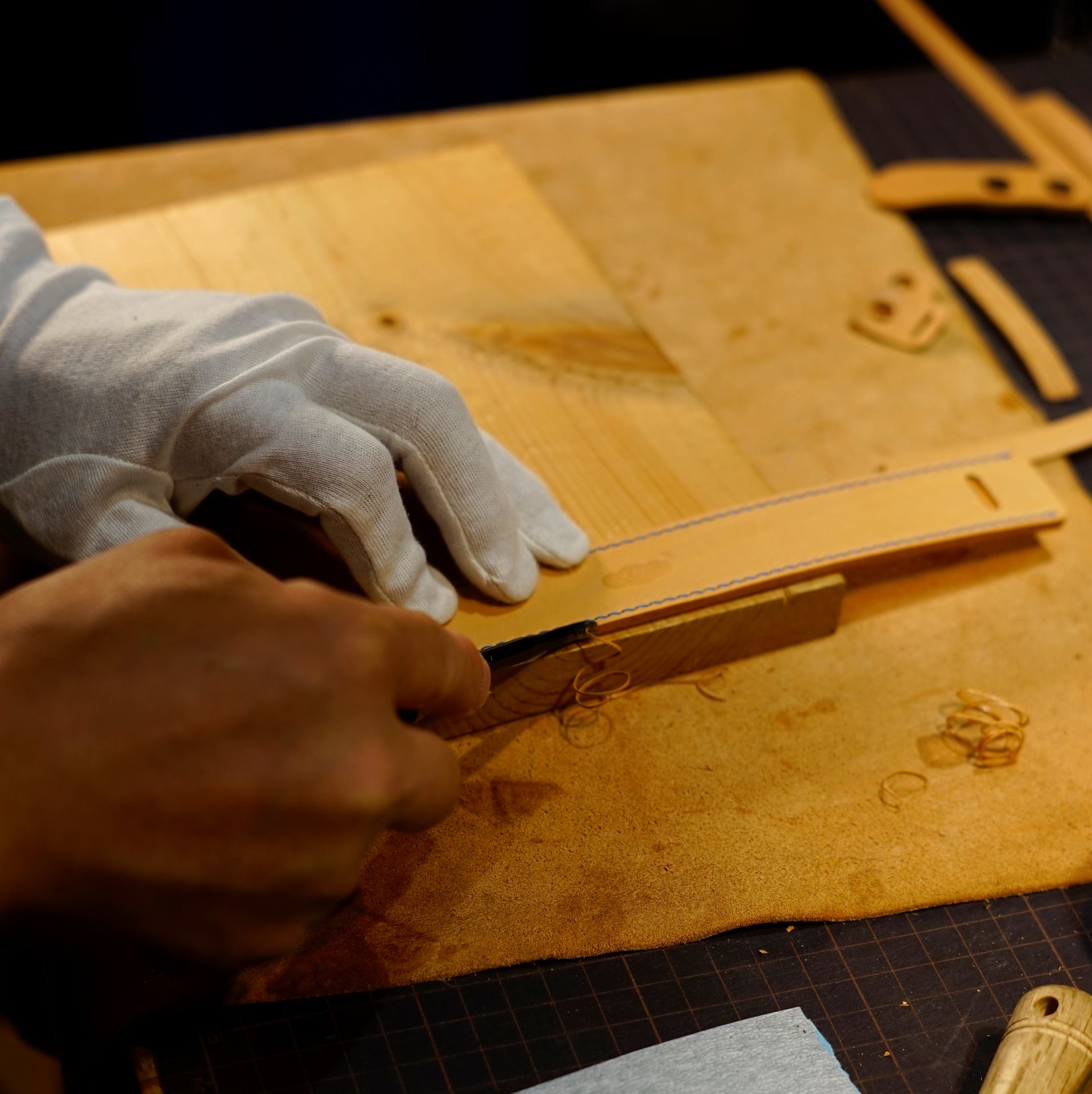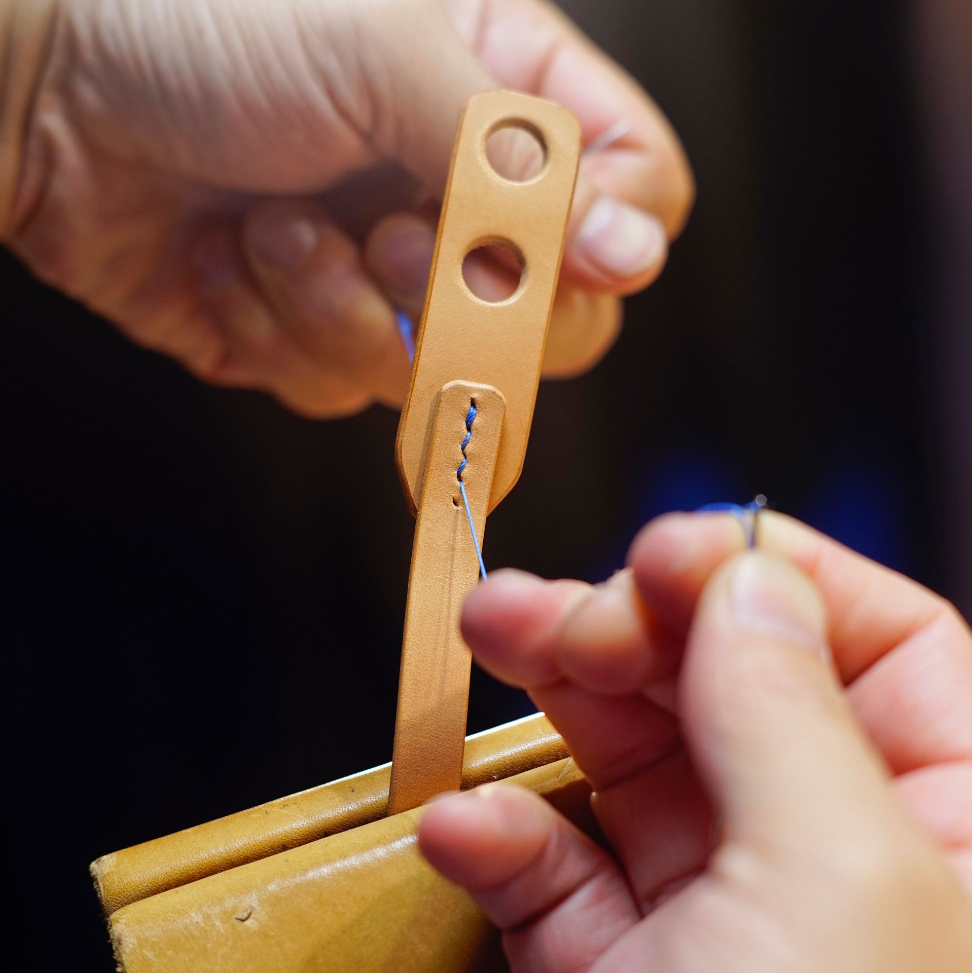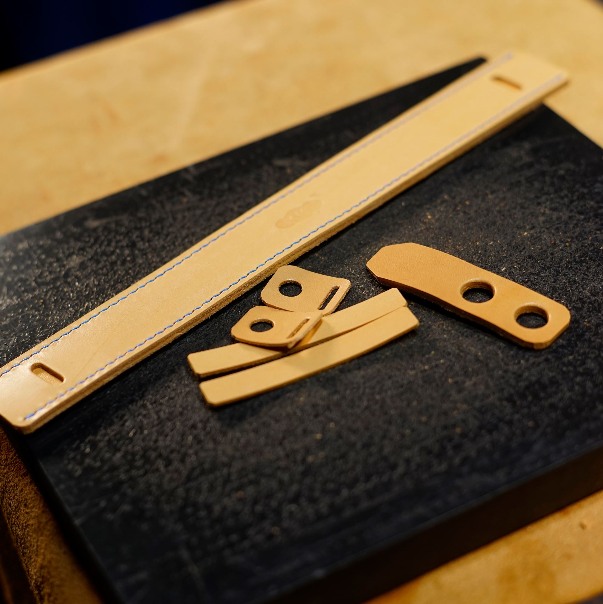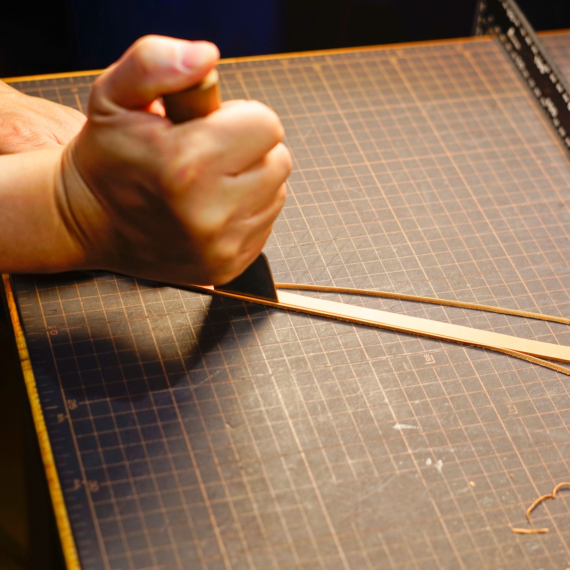 革ひもを漉いて、各パーツを組み上げて完成となります。