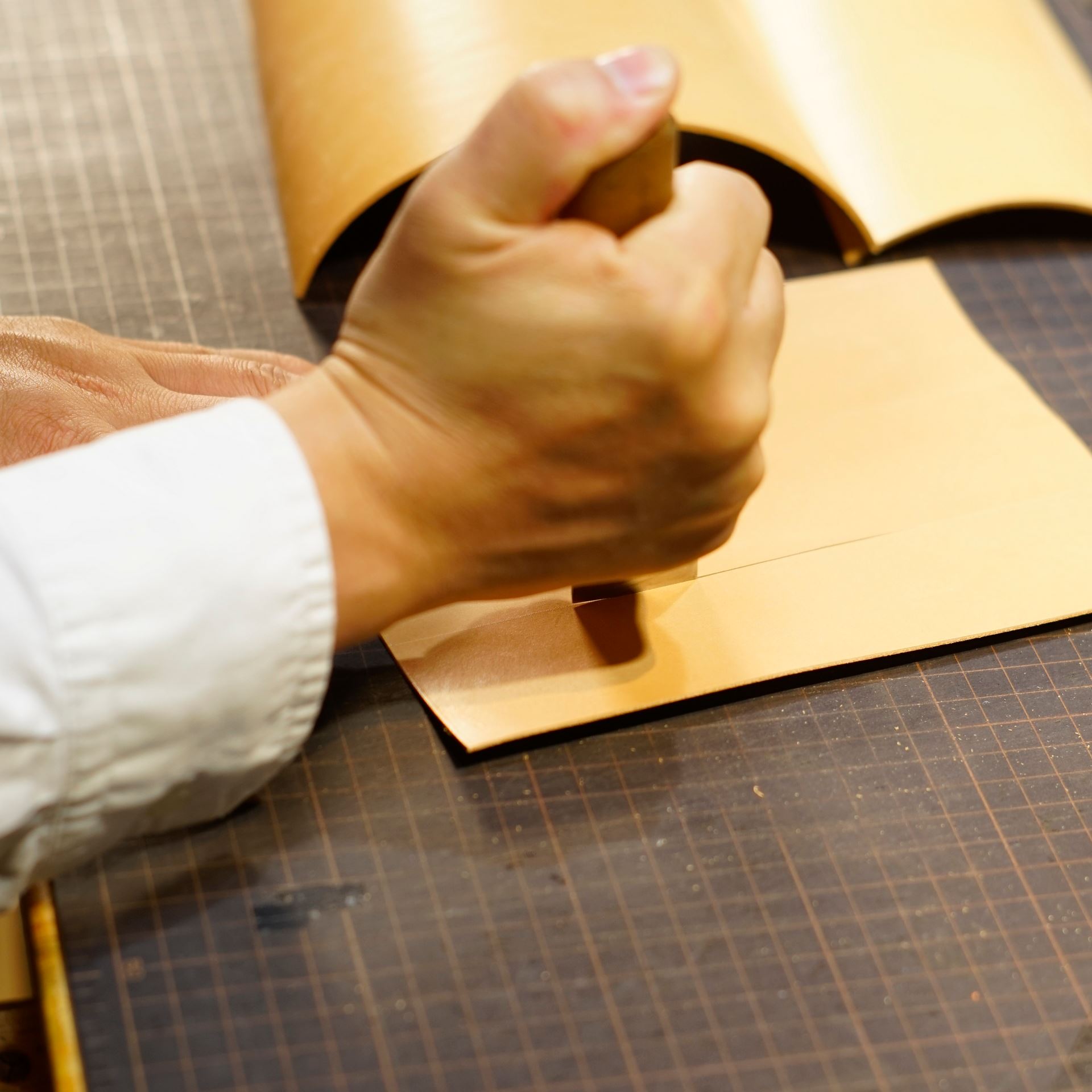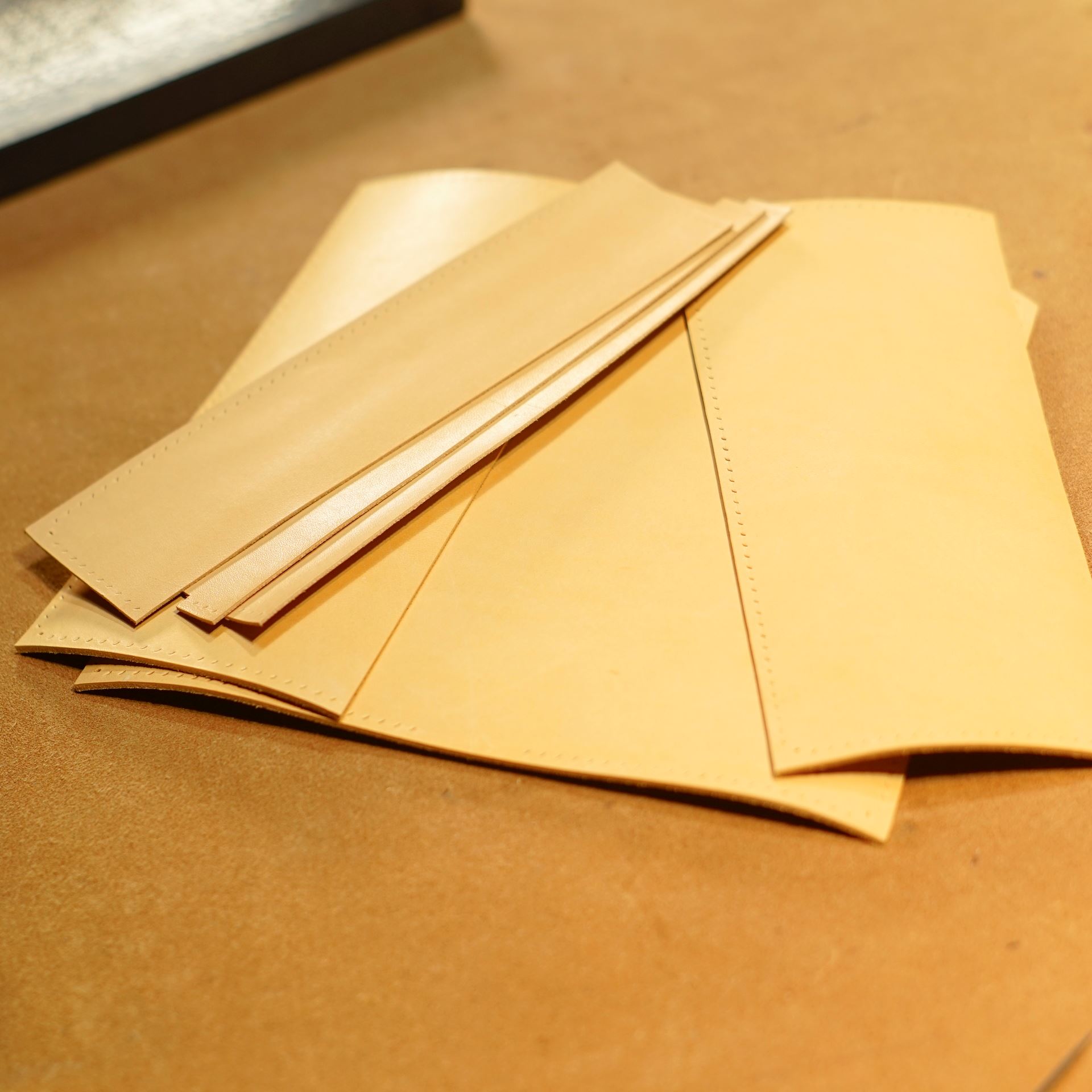 今回のご依頼はイタリアンハードの生成りとなります。革をカットしてパーツを揃えます。