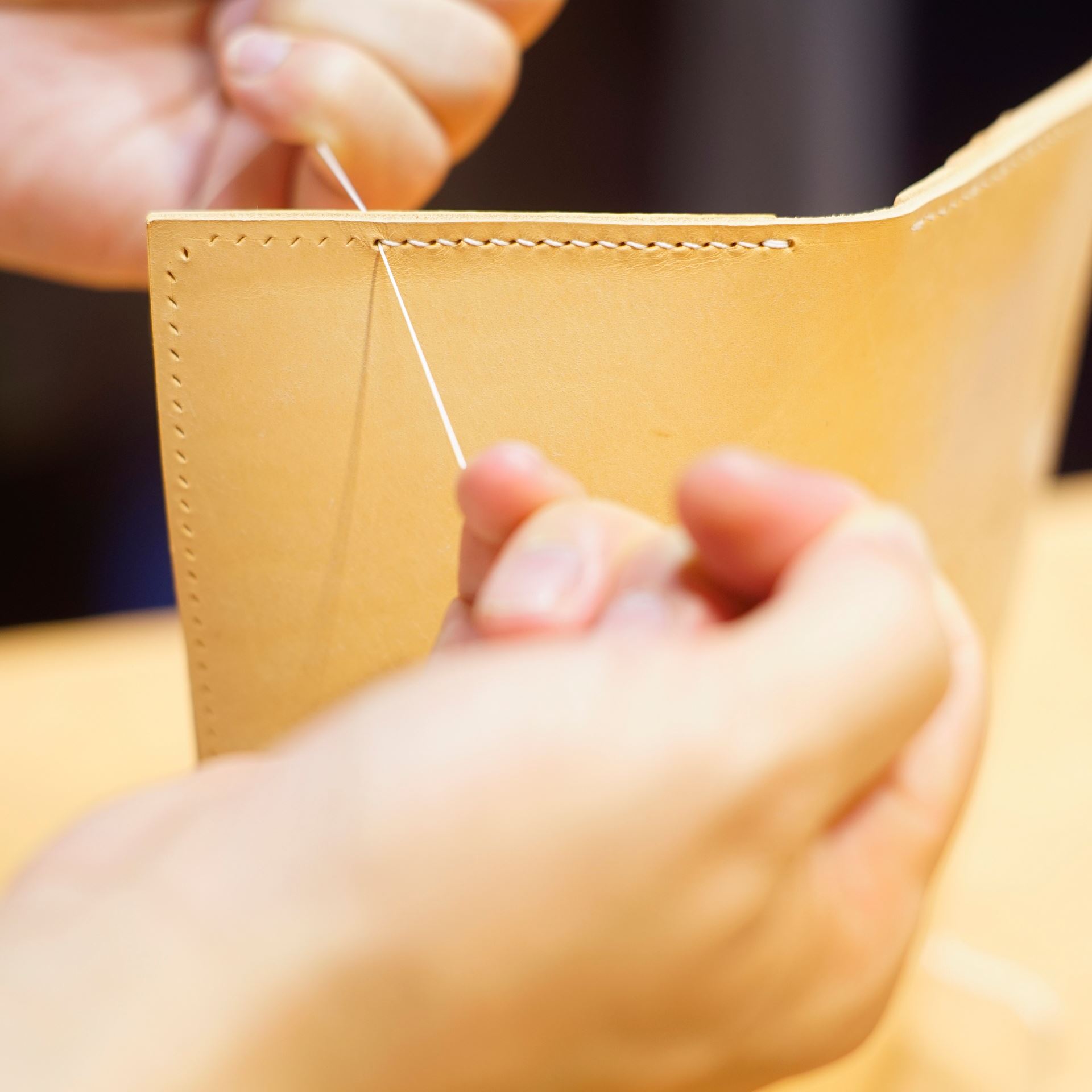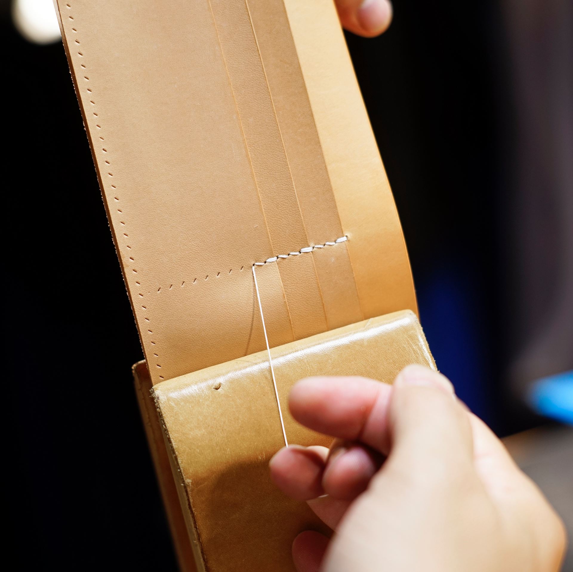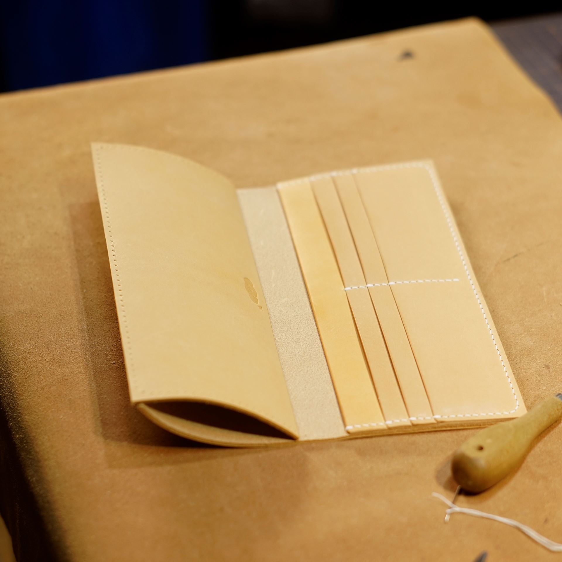 カットしたパーツに刻印を打刻してカード挿し側のパーツから手縫いします。