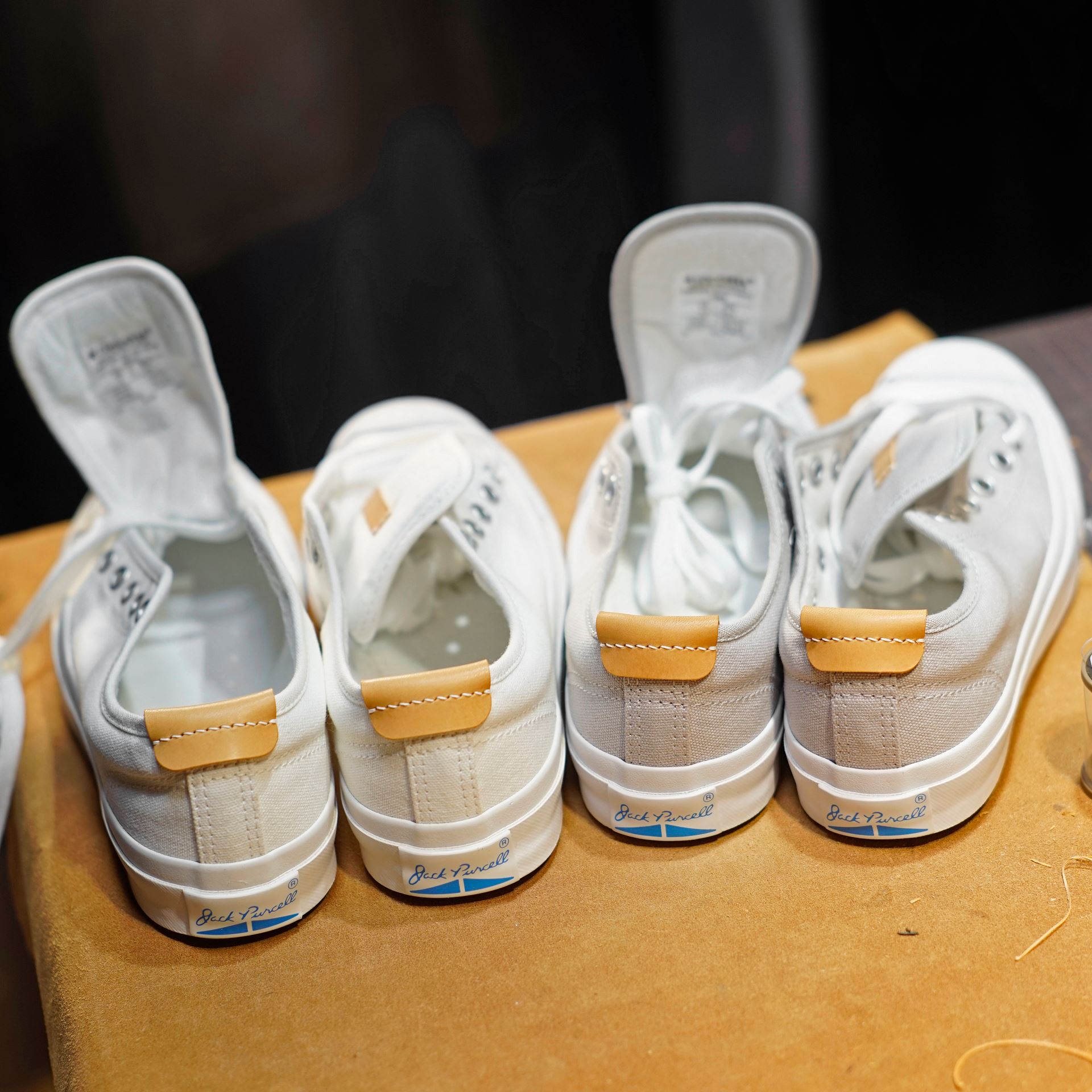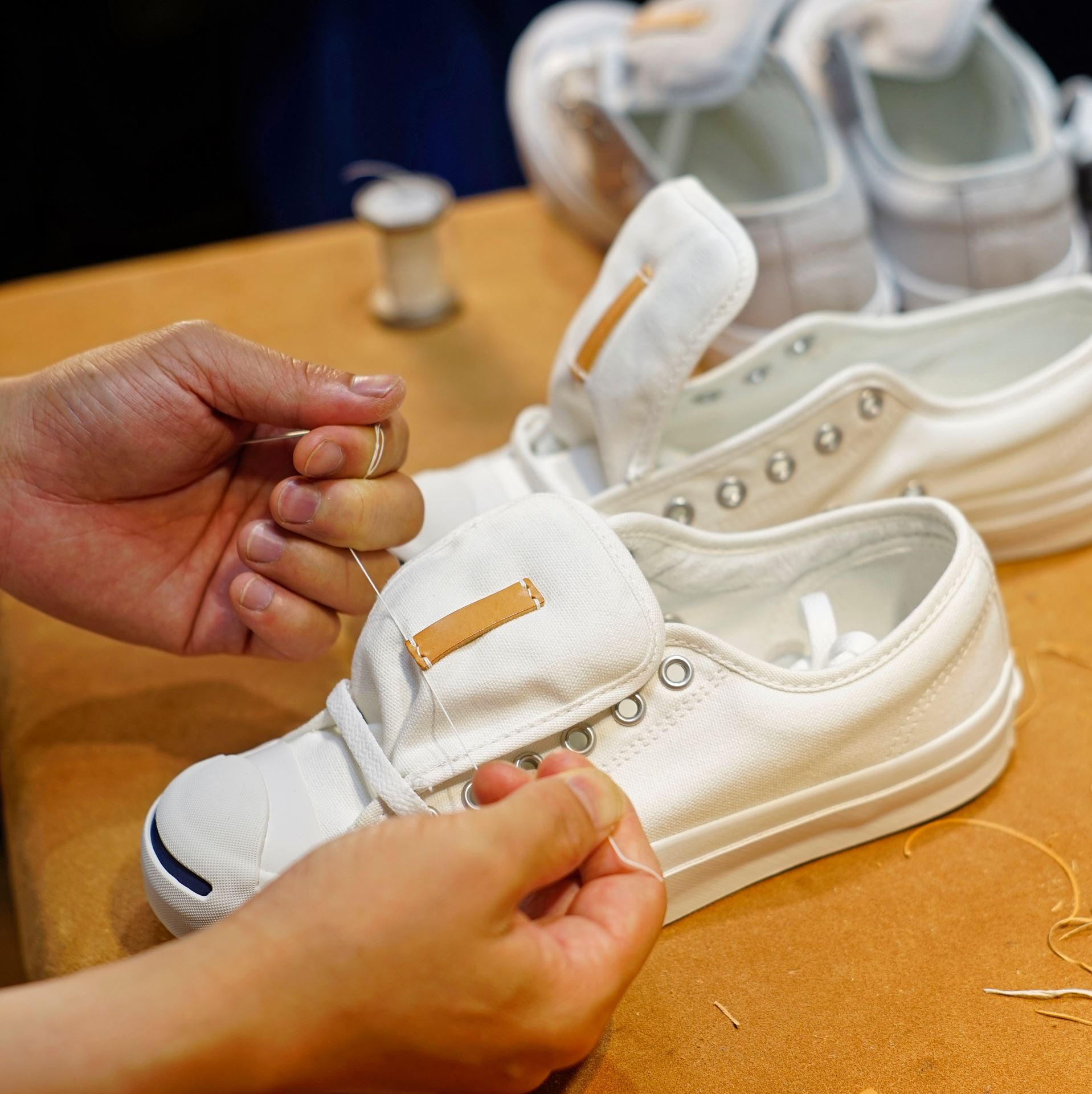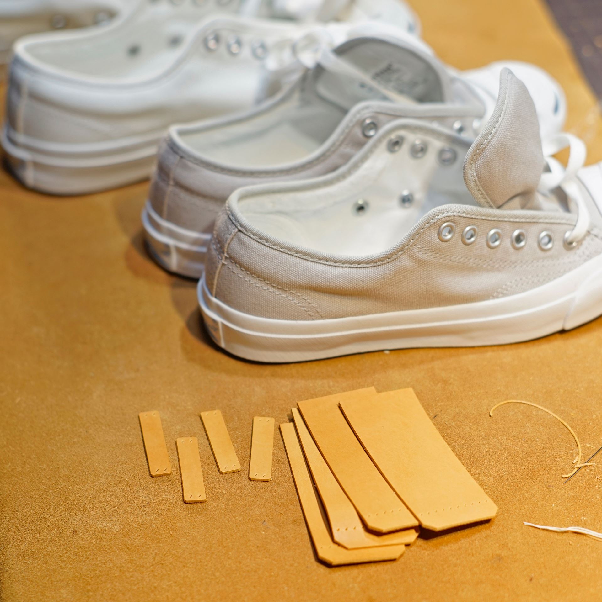 青ひげを2足用意します。今回制作するのは通常の青ひげ改と銀鼠になります。どちらも生成り革を縫い付けます。