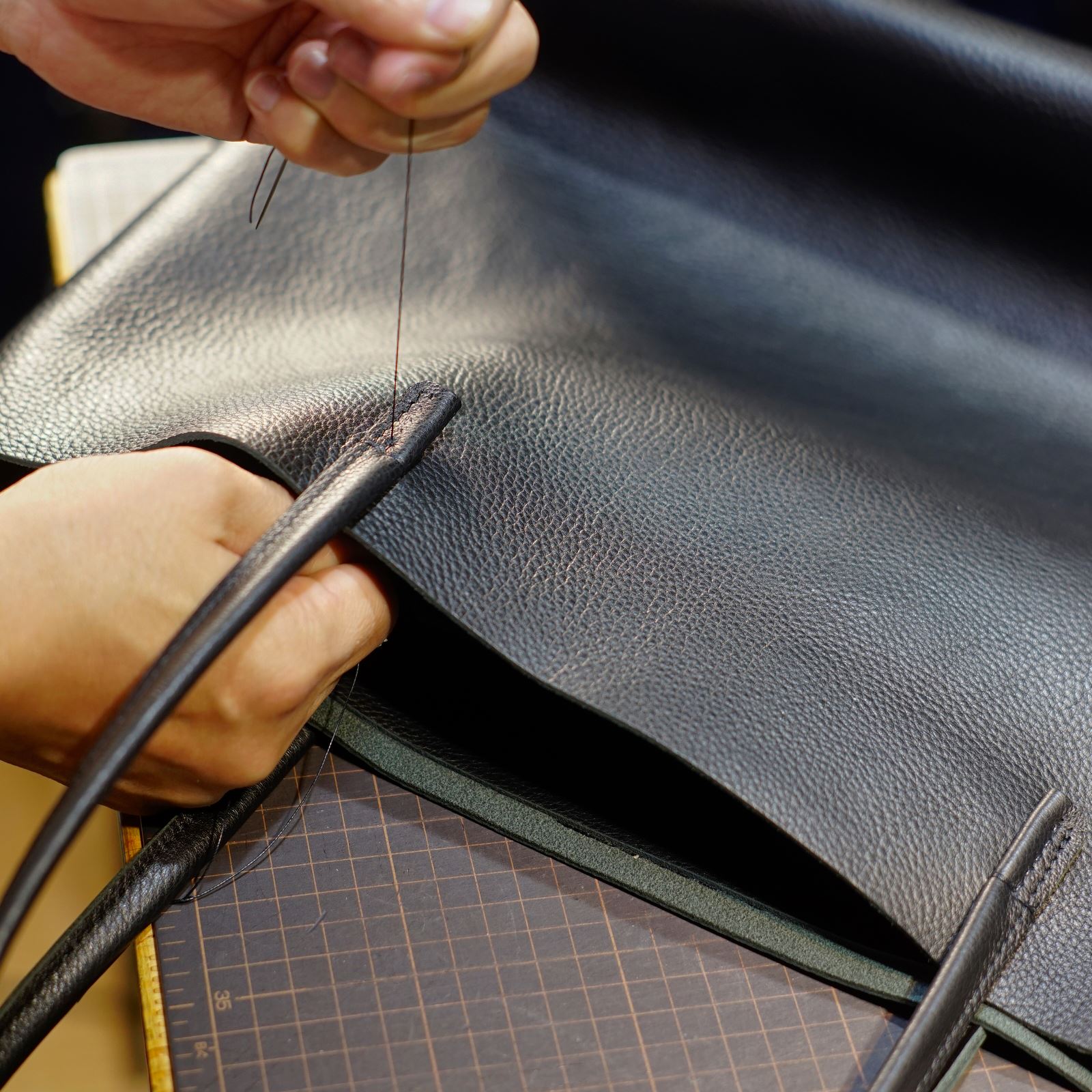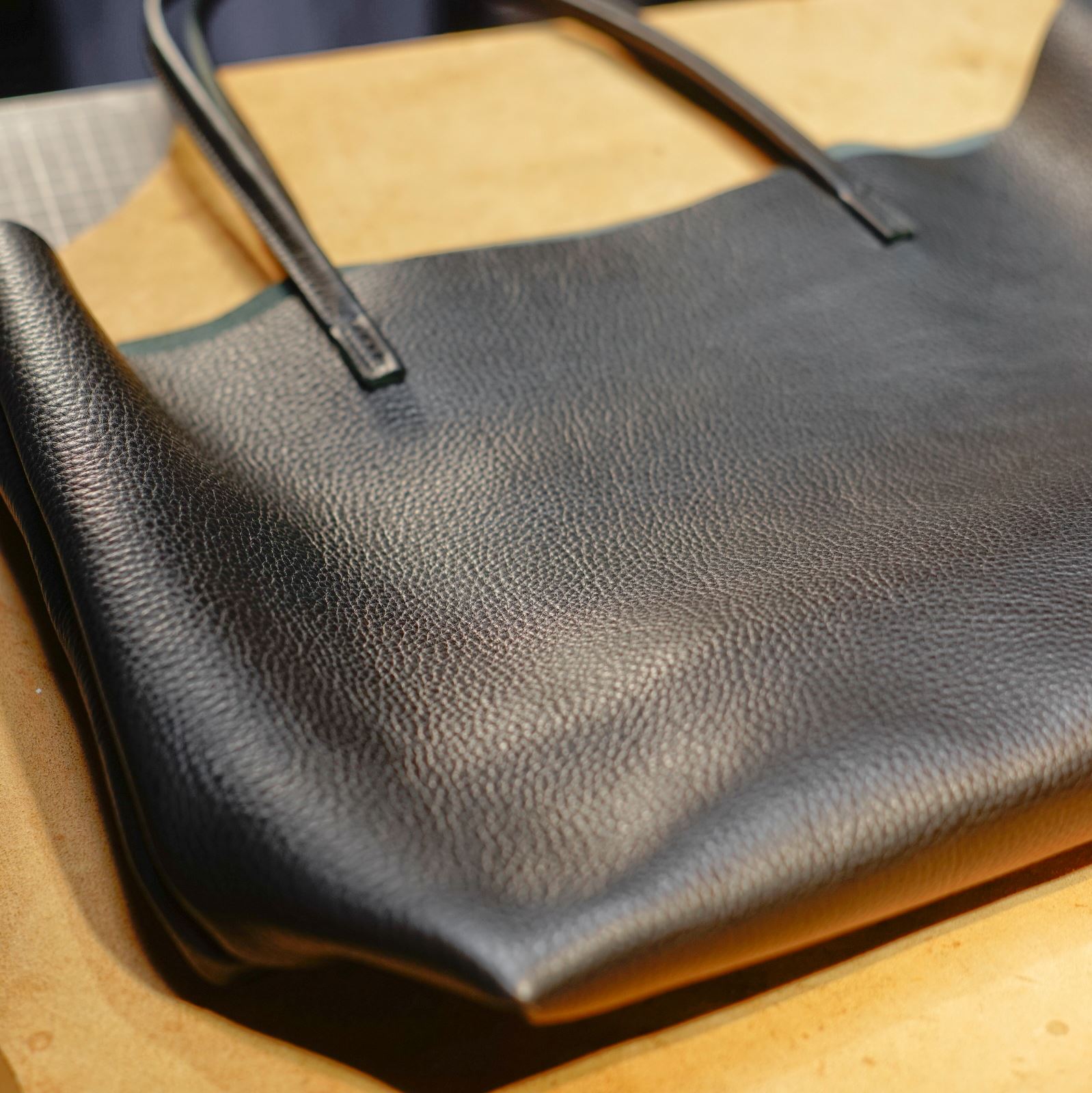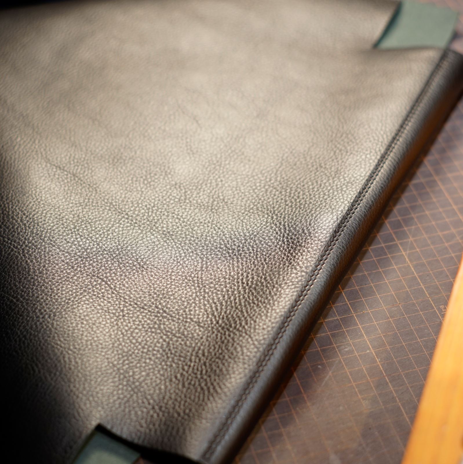 使用するのはクローム鞣しのシボ革黒。この革からパーツを切り出します。本体、持ち手、内ポケットを揃えてサイズを整えます。