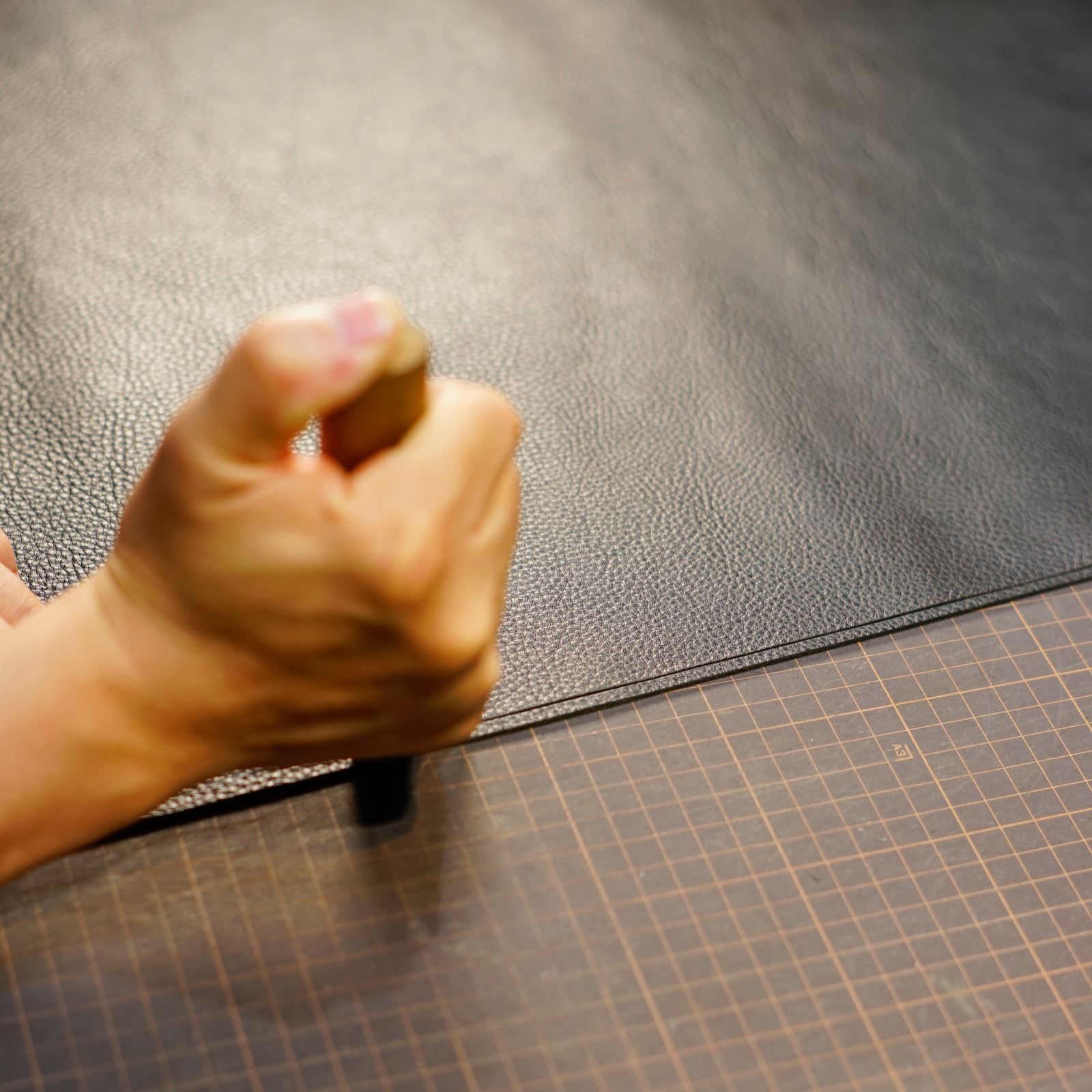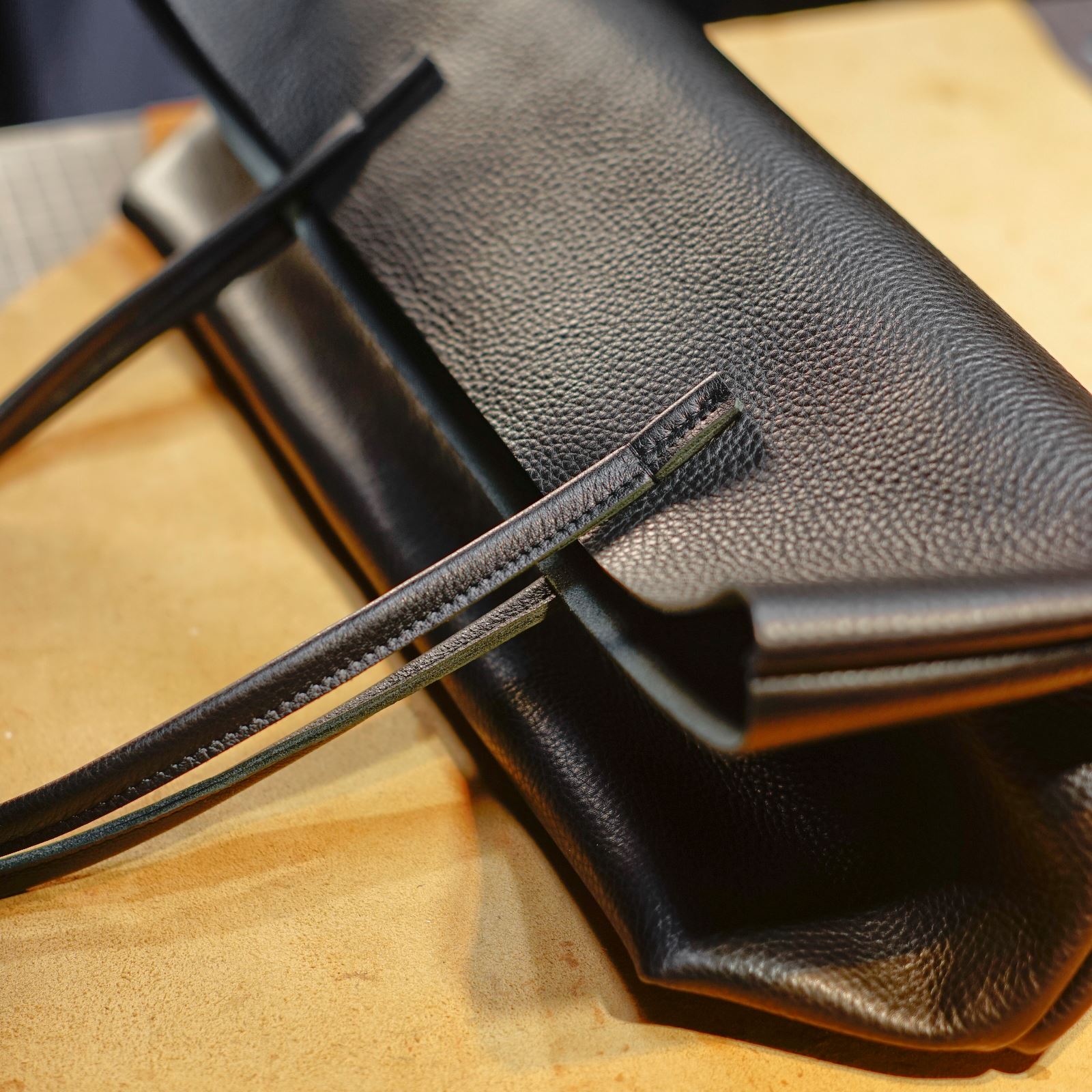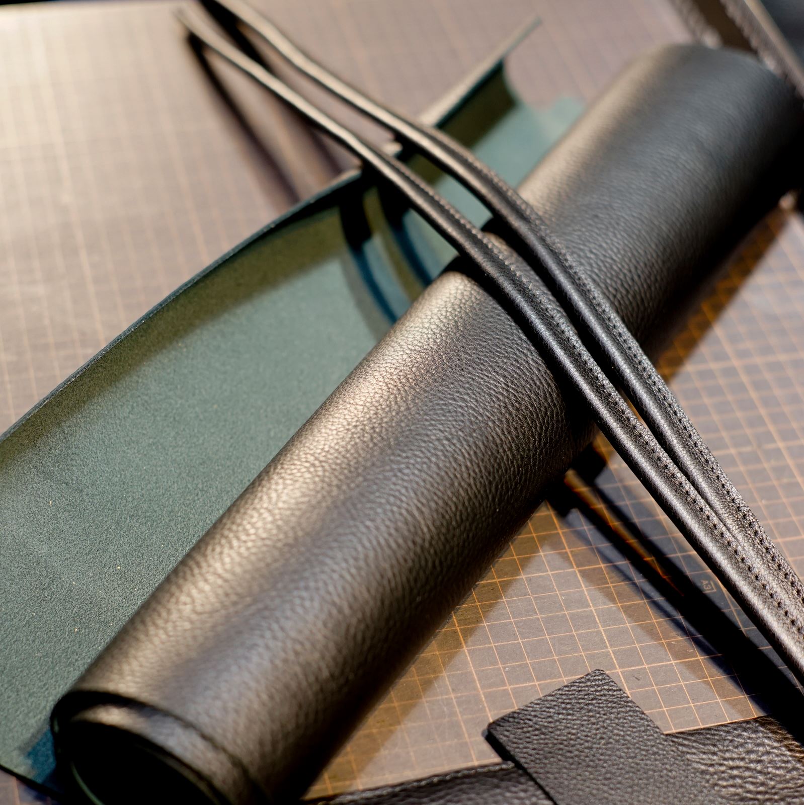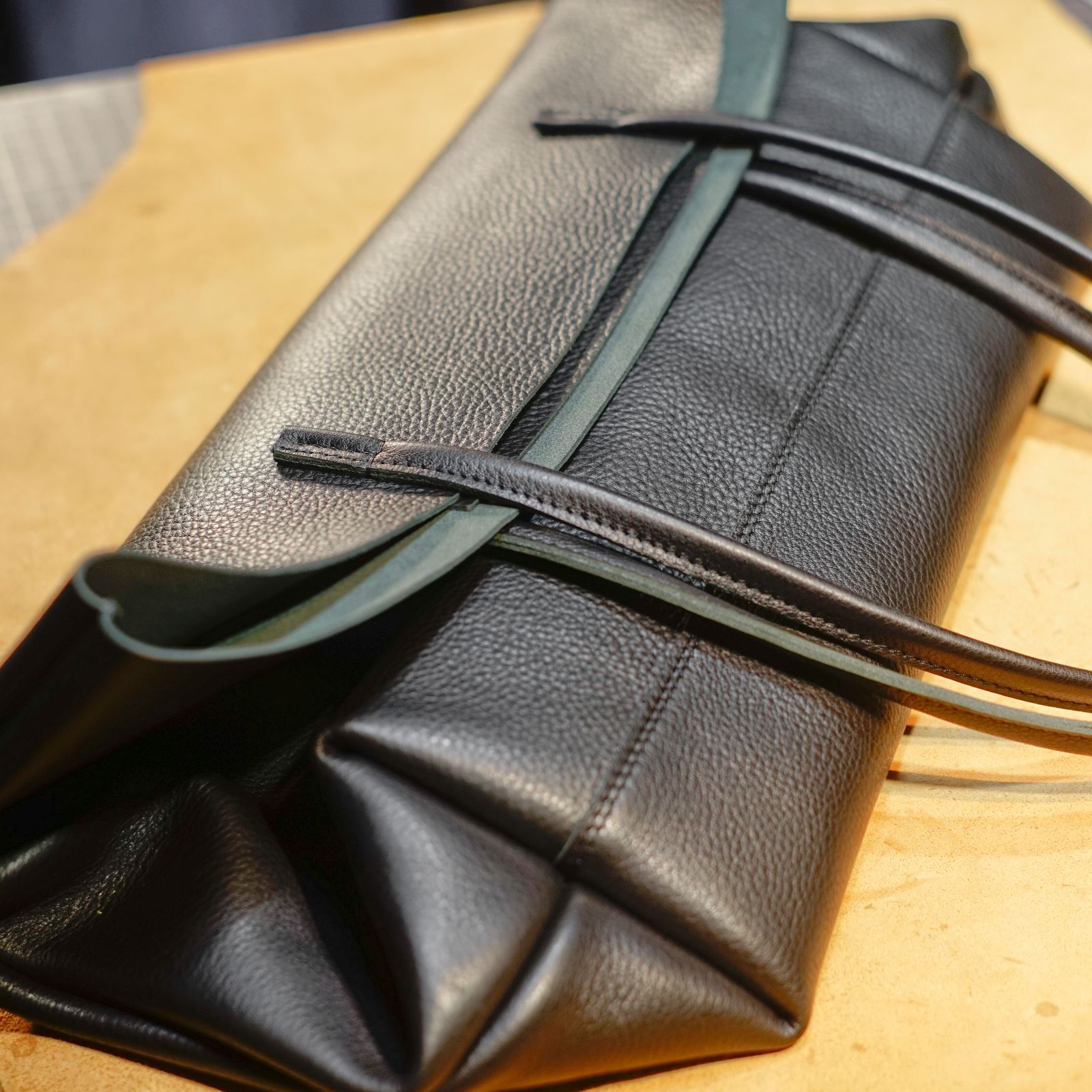 使用するのはクローム鞣しのシボ革黒。この革からパーツを切り出します。本体、持ち手、内ポケットを揃えてサイズを整えます。
