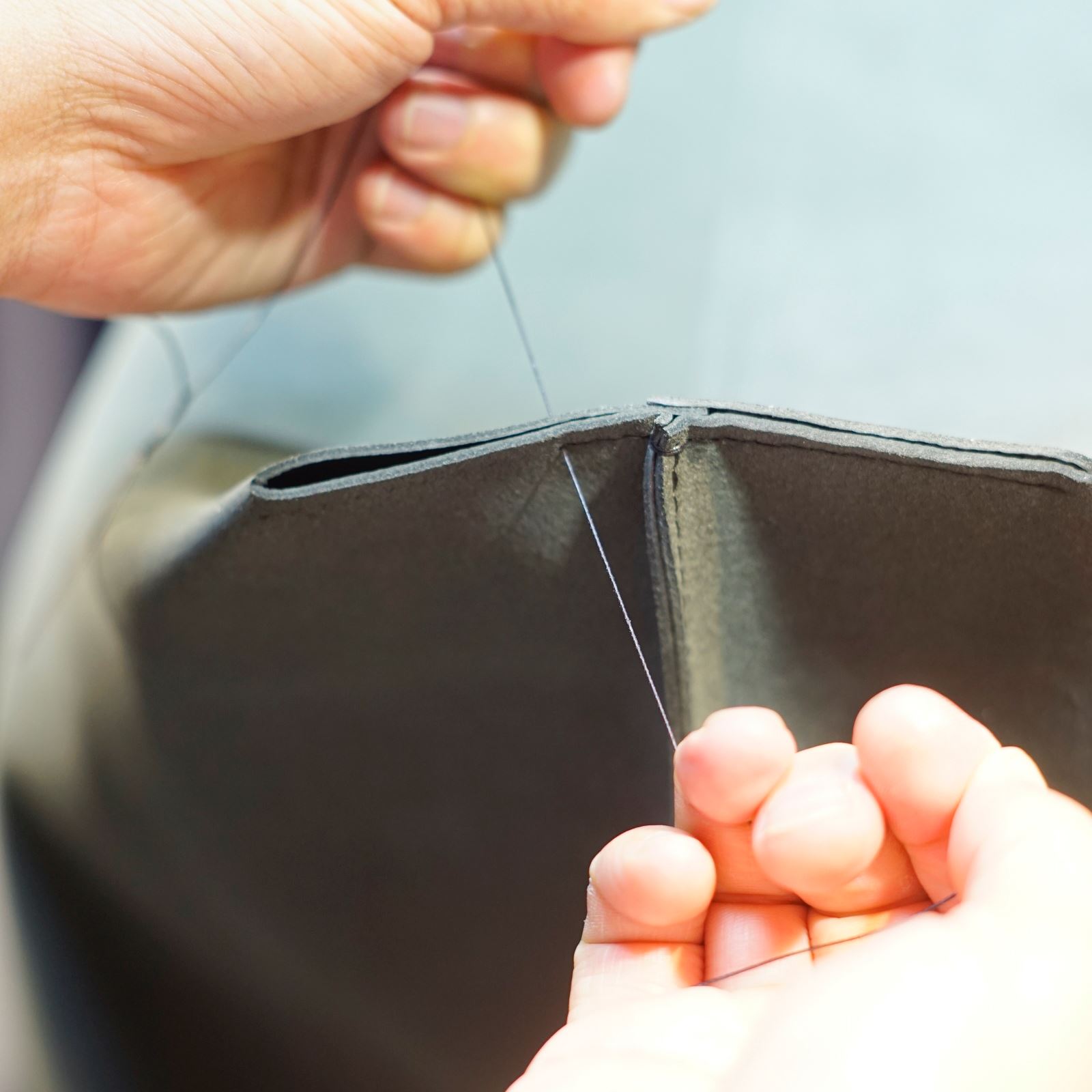 カバンの縁を六花リネン糸の36鼠で手縫いして補強します。あとはマチを手縫いして持ち手を付ければ完成となります。