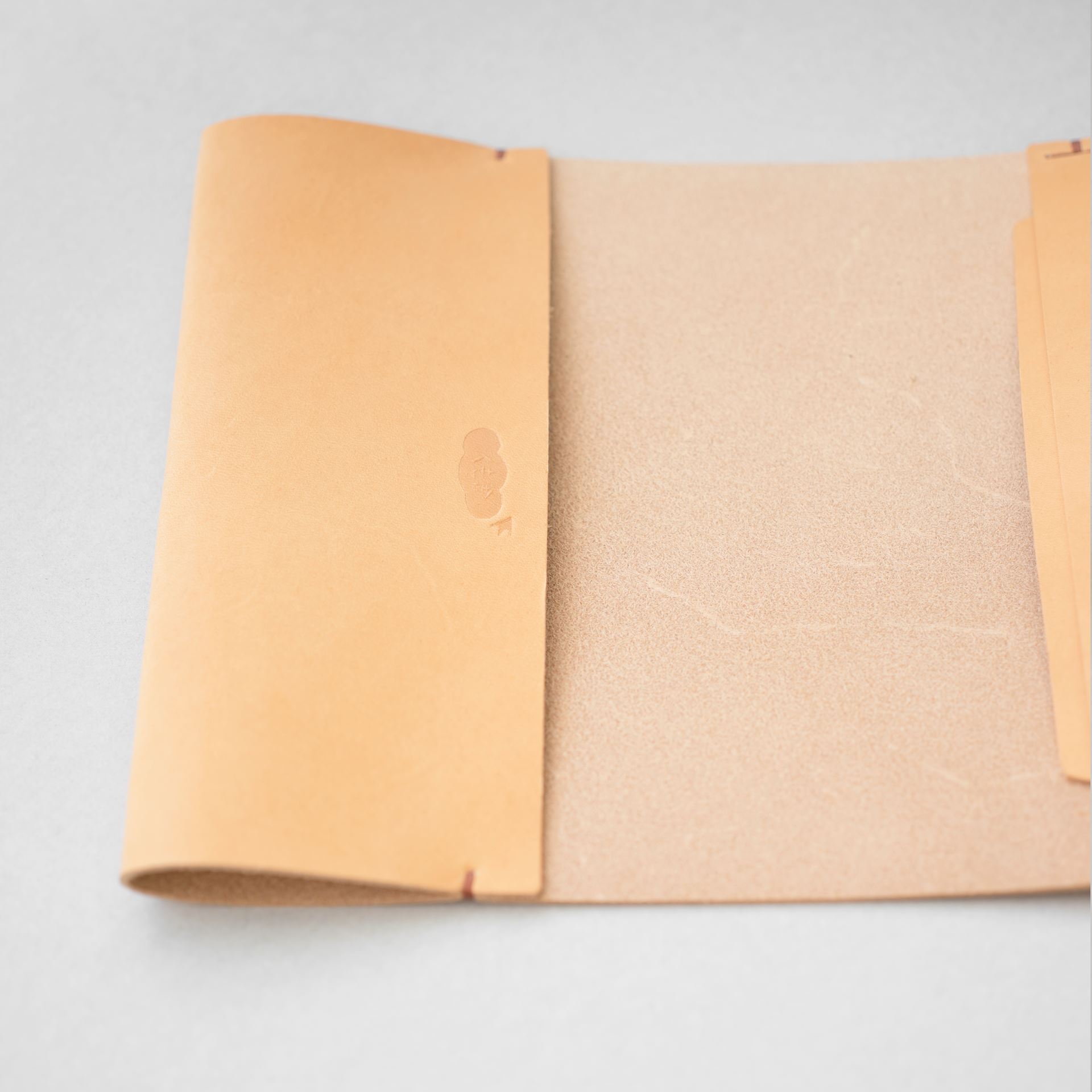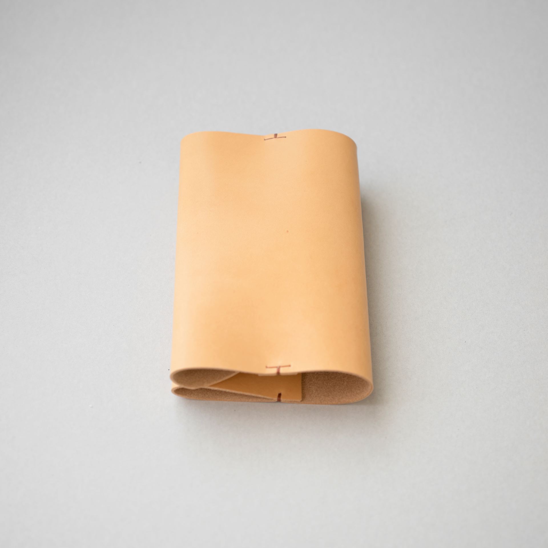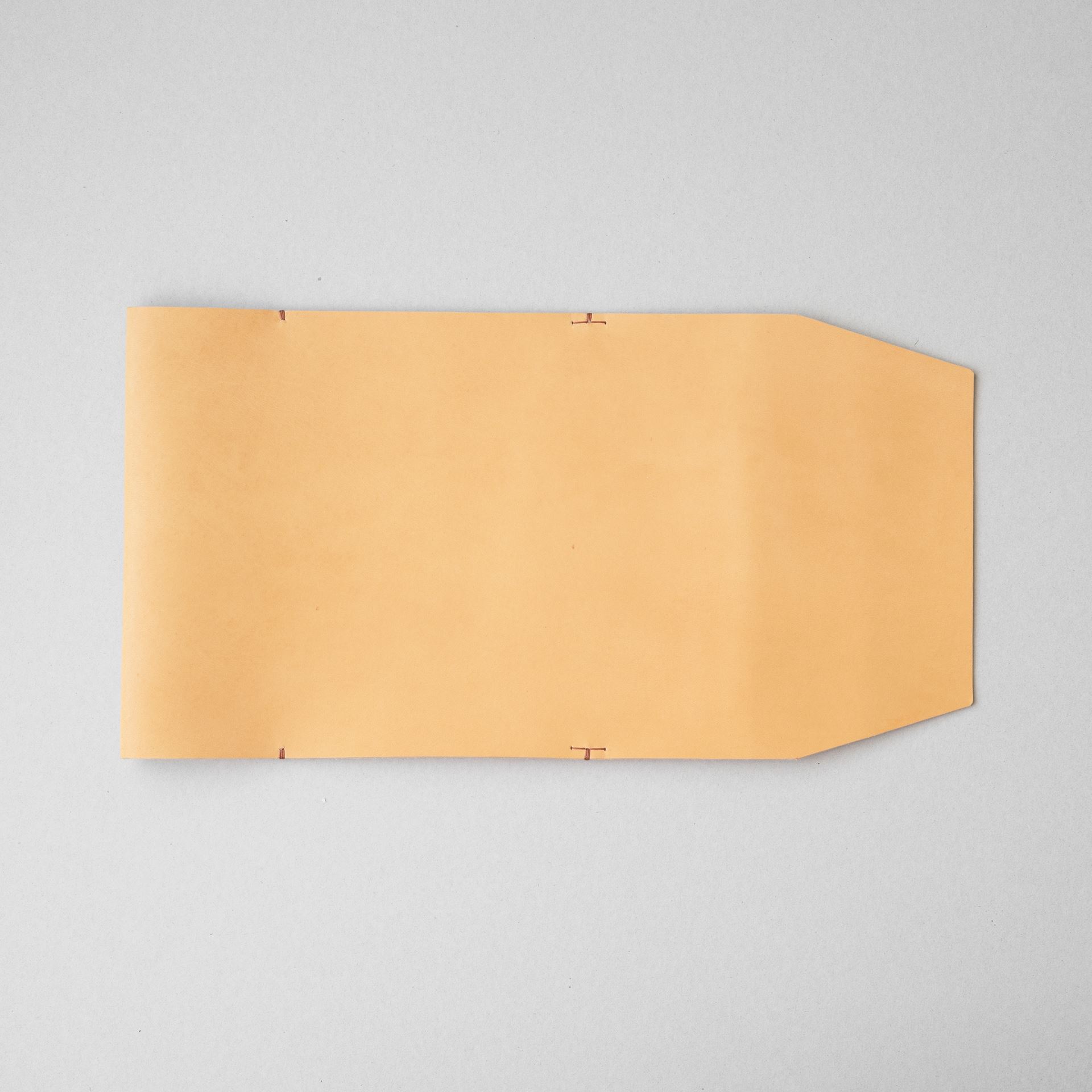 イタリアンソフトの生成りをカットして刻印を入れたら、六花リネン糸の03焦茶で手縫いします。