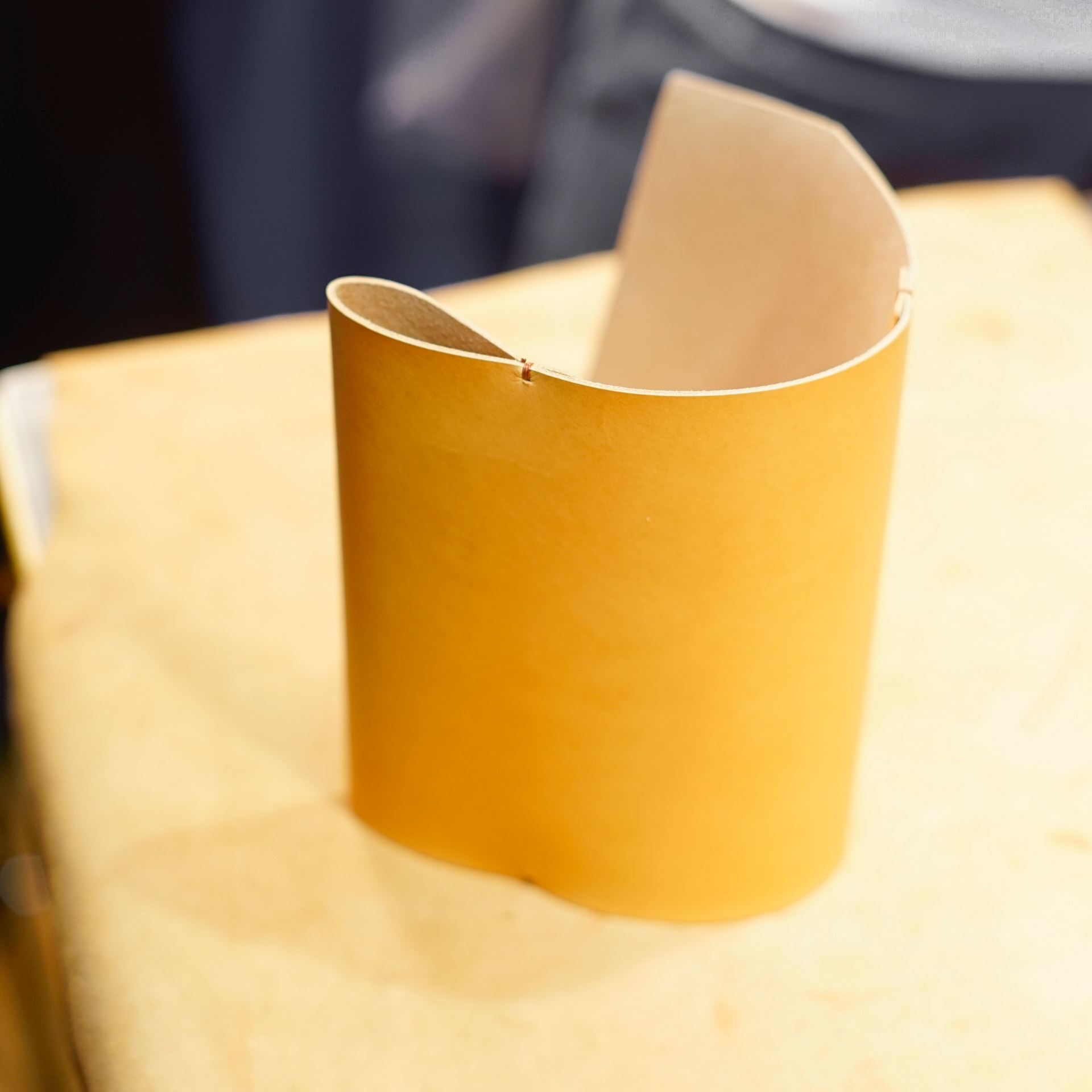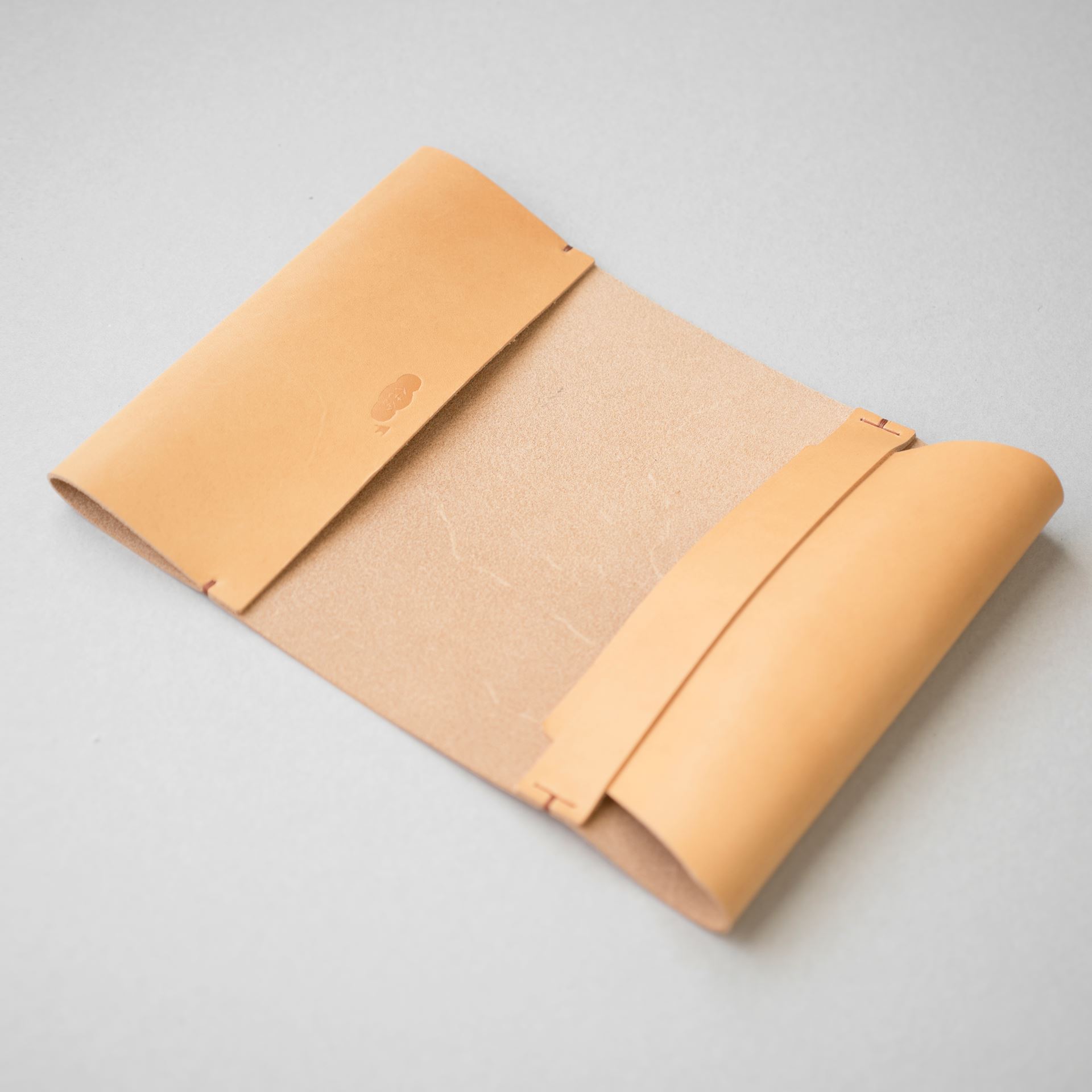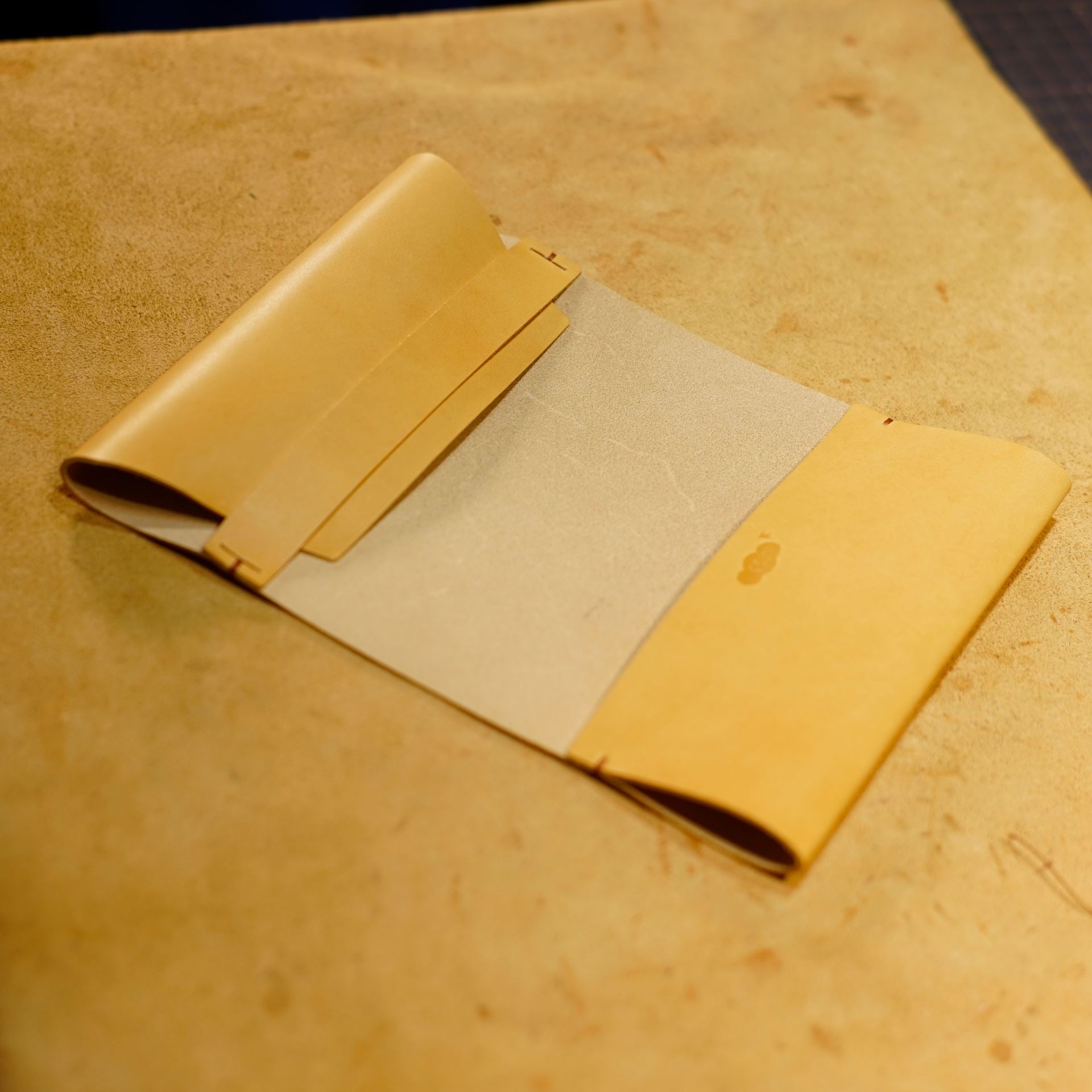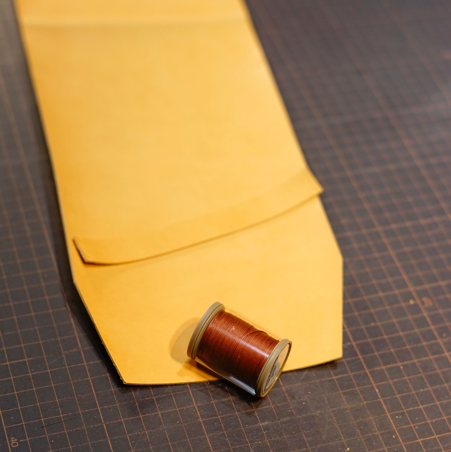 イタリアンソフトの生成りをカットして刻印を入れたら、六花リネン糸の03焦茶で手縫いします。