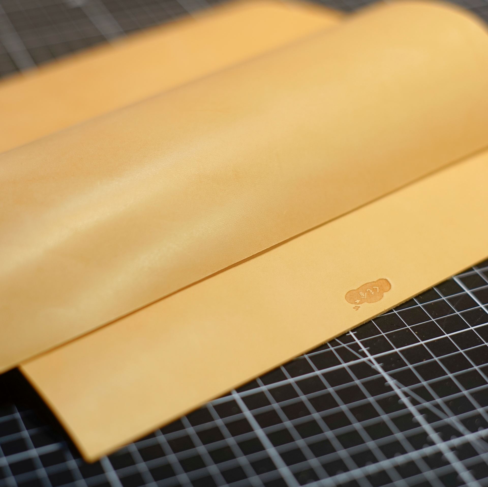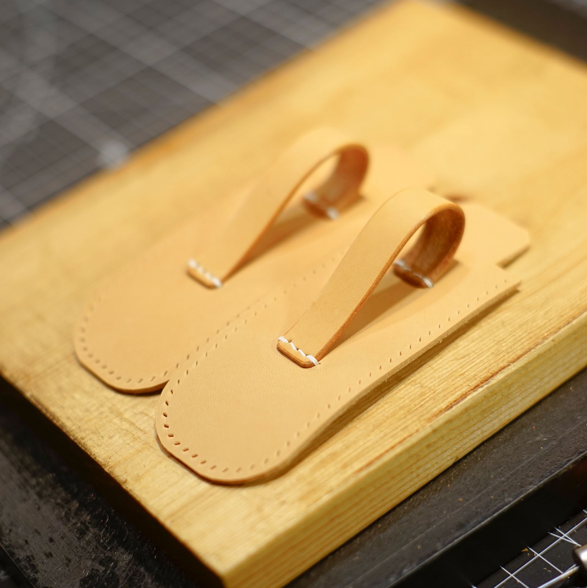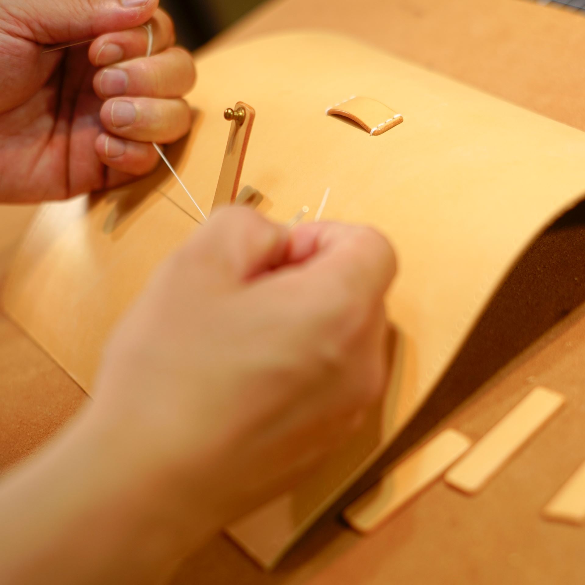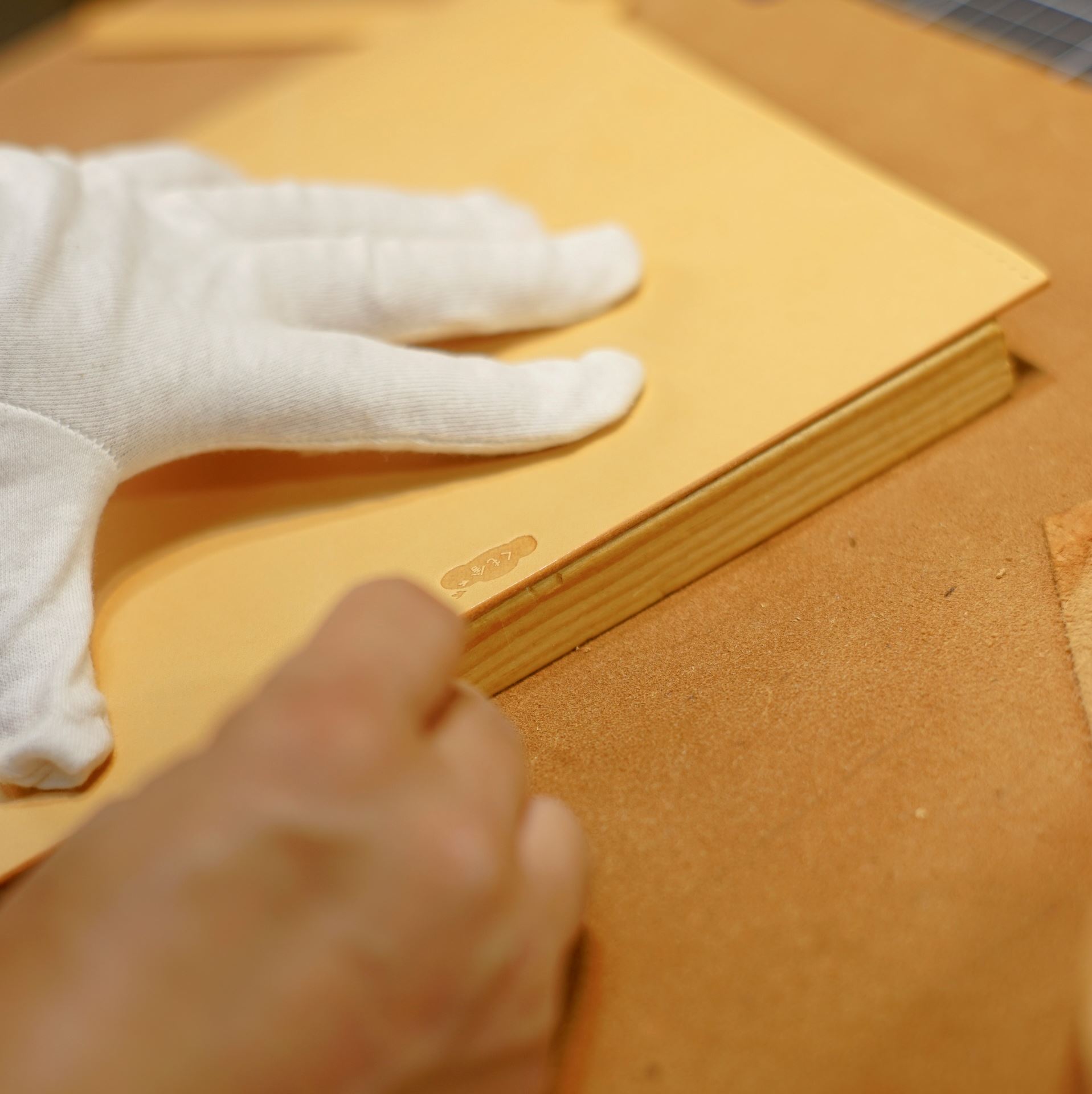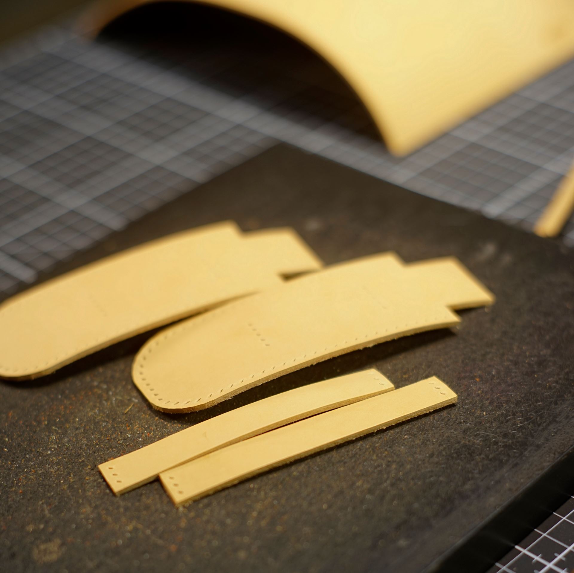 切出したパーツをそれぞれ下ごしらえしていきます。ロゴの打刻、コバ磨きから目打ちまで。手縫いで組み上げる手前までもって行きましょう。
