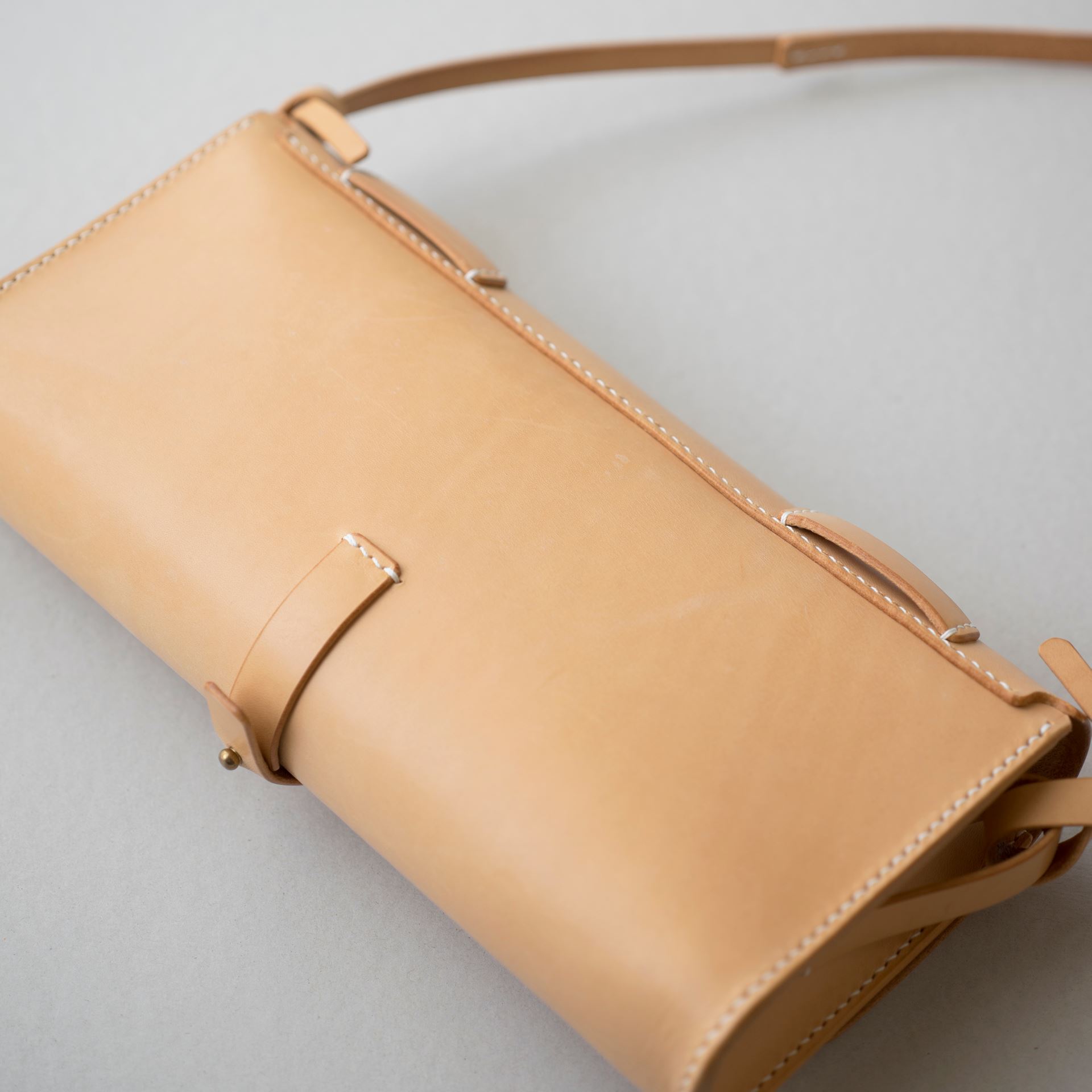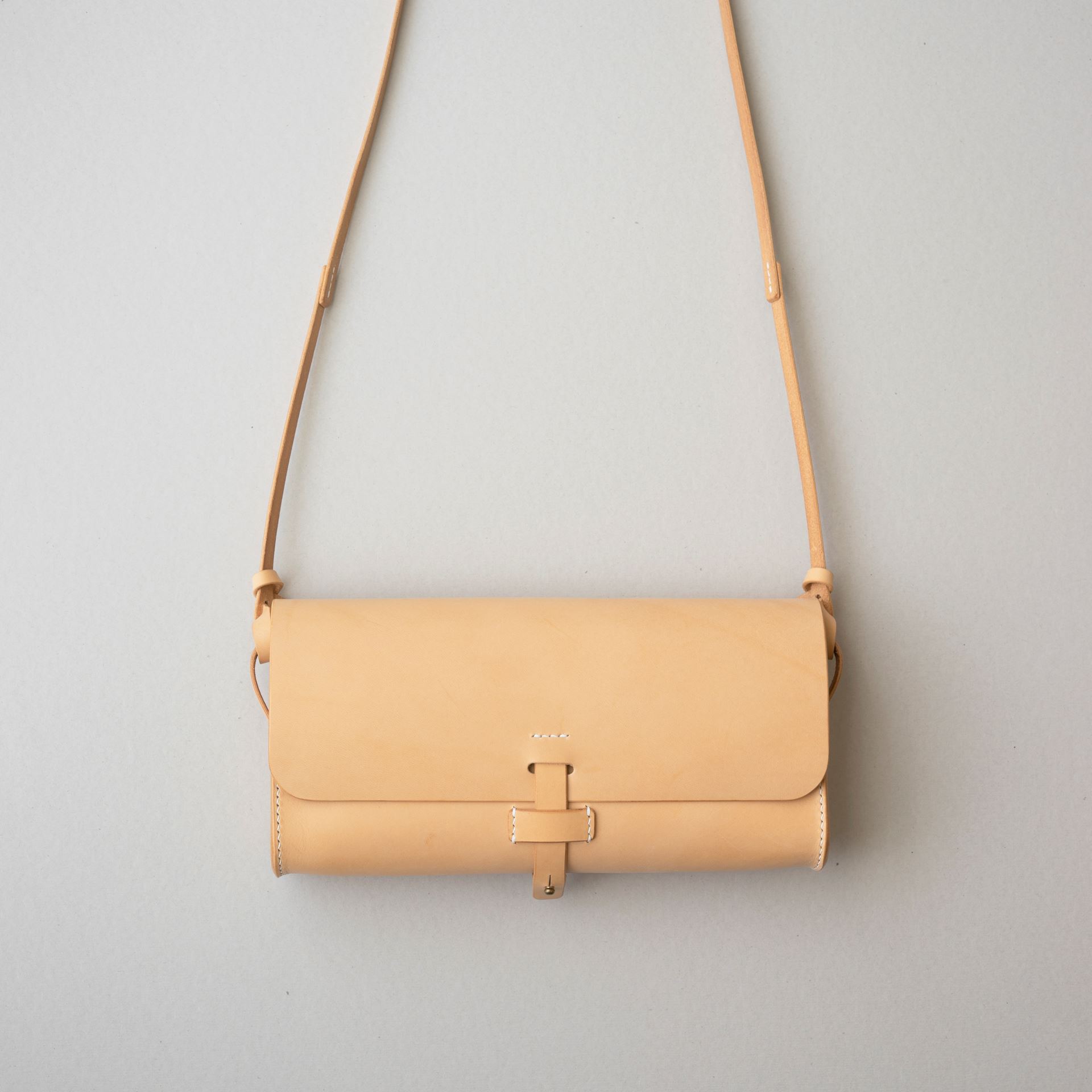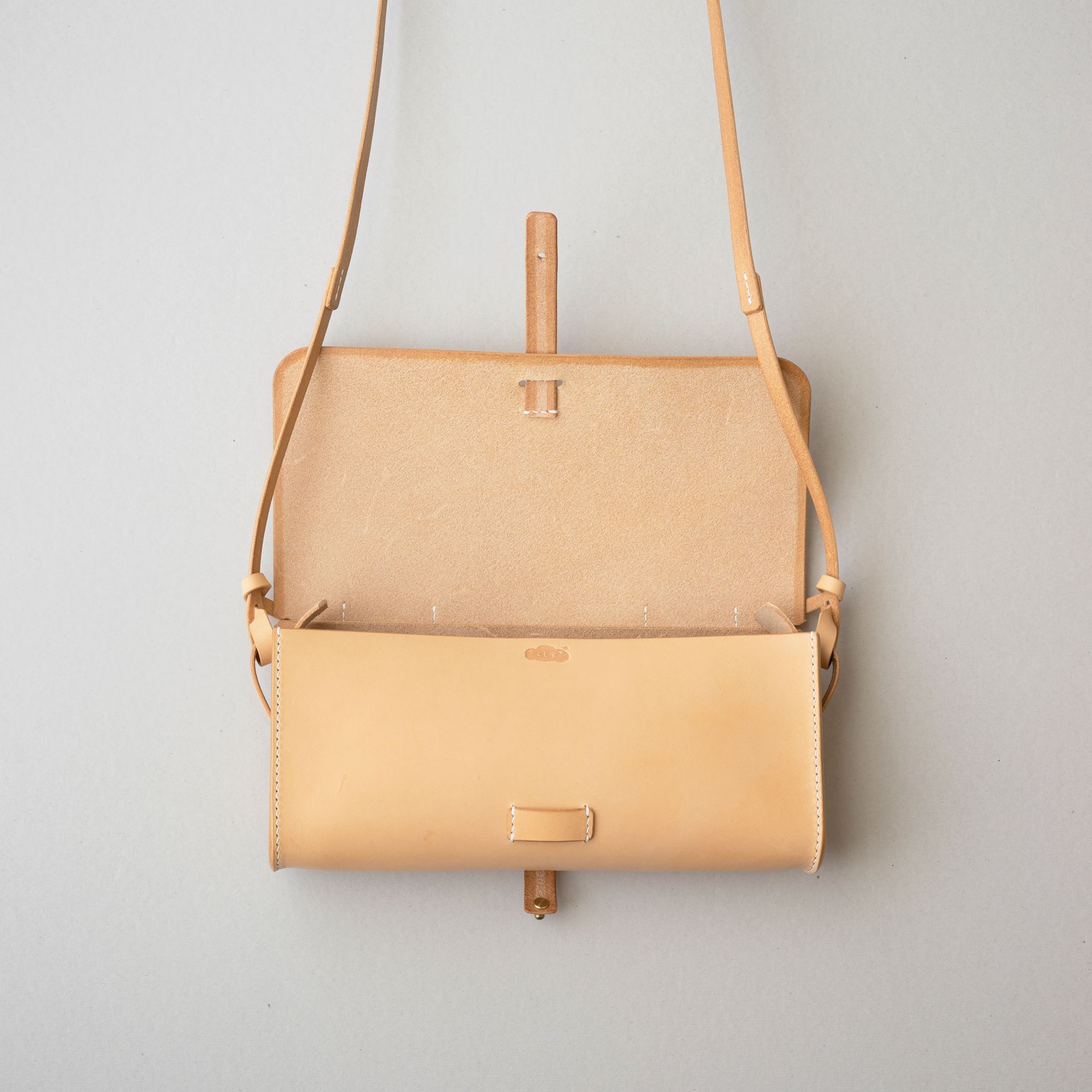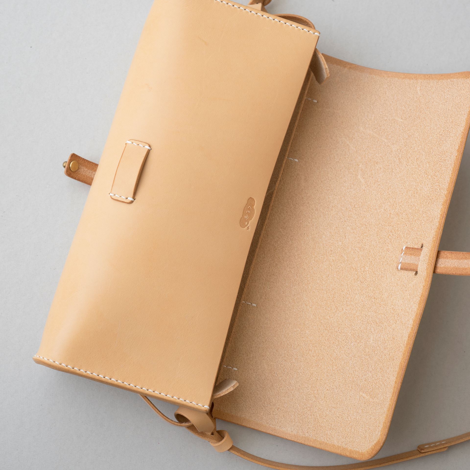 くも舎の耳つき肩かけカバンは、最上級のヌメ革を使用した横長の小さなバッグです。サイズは一般的な長財布や文庫本、携帯電話などが入る大きさです。カバンの側面には大きな耳がついていますので、長いベルトをつければショルダーバッグになります。