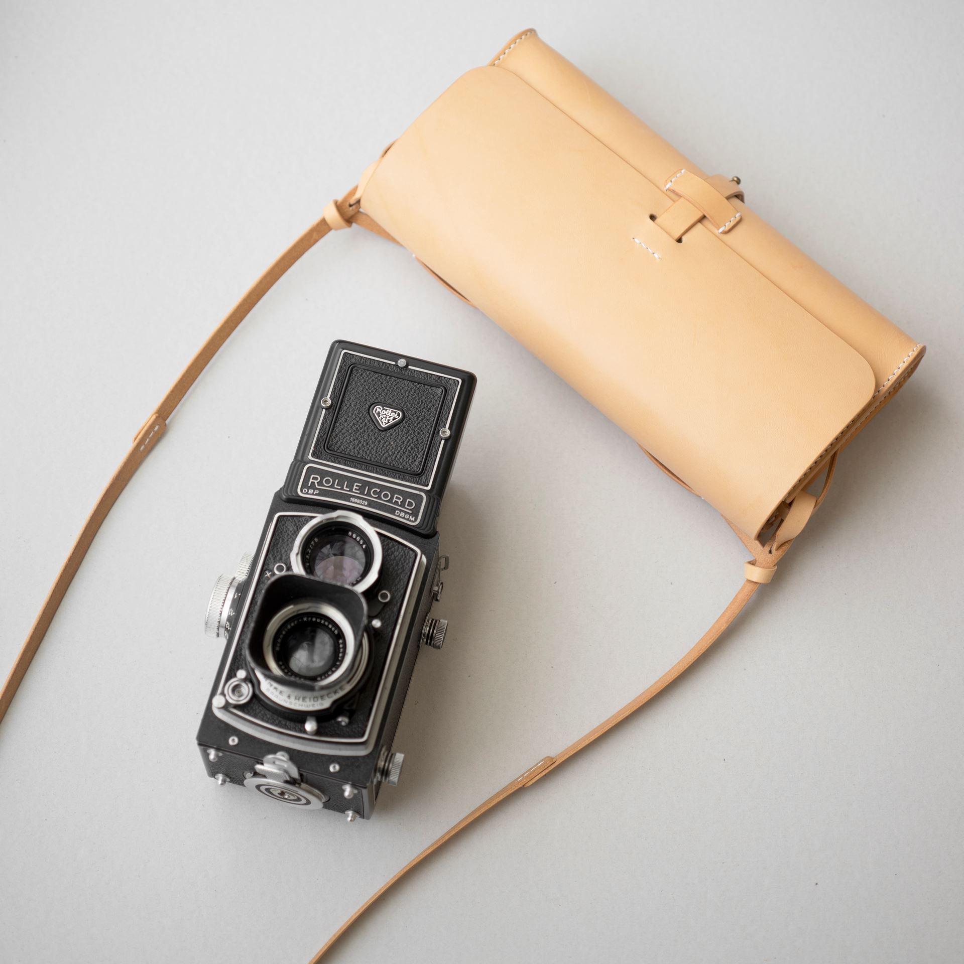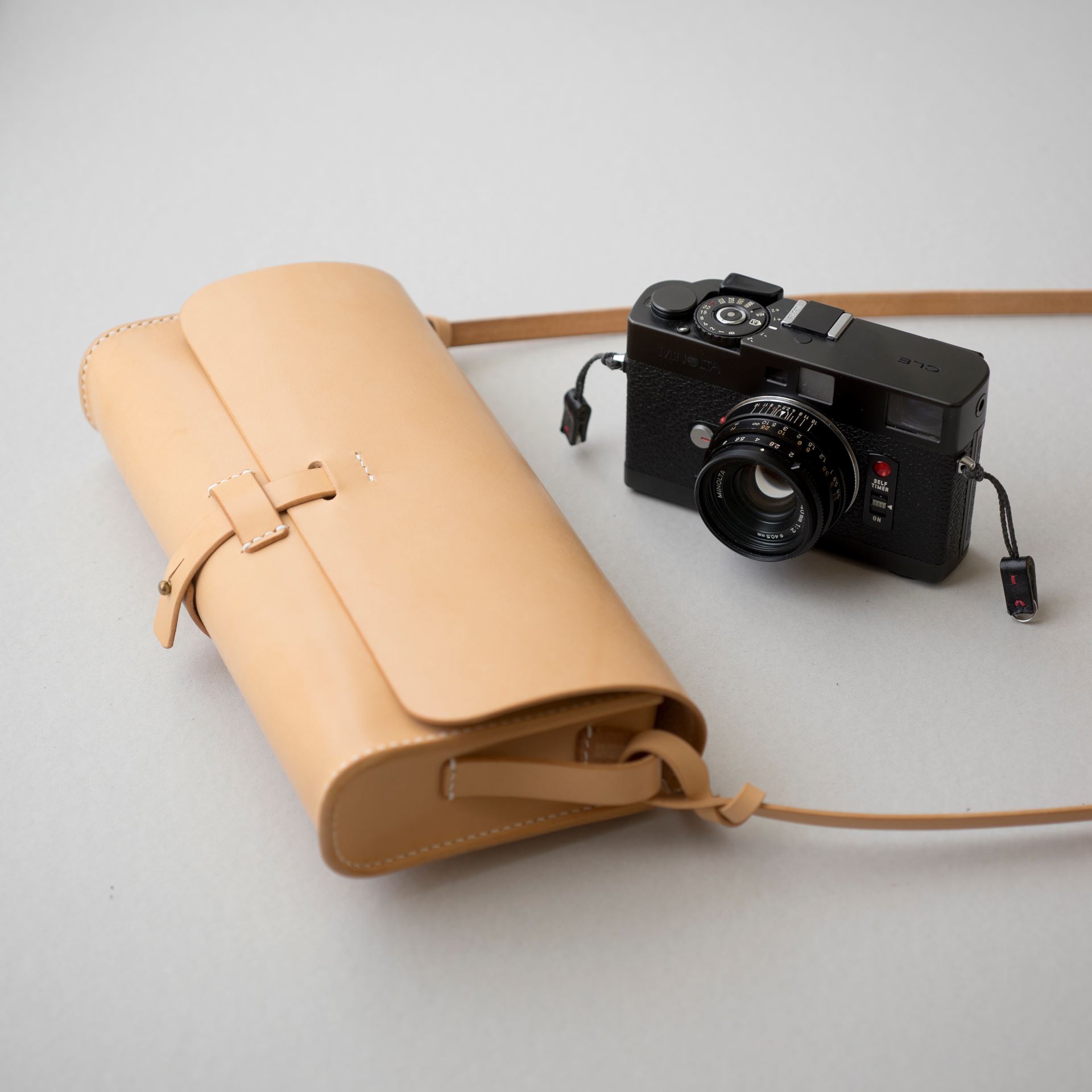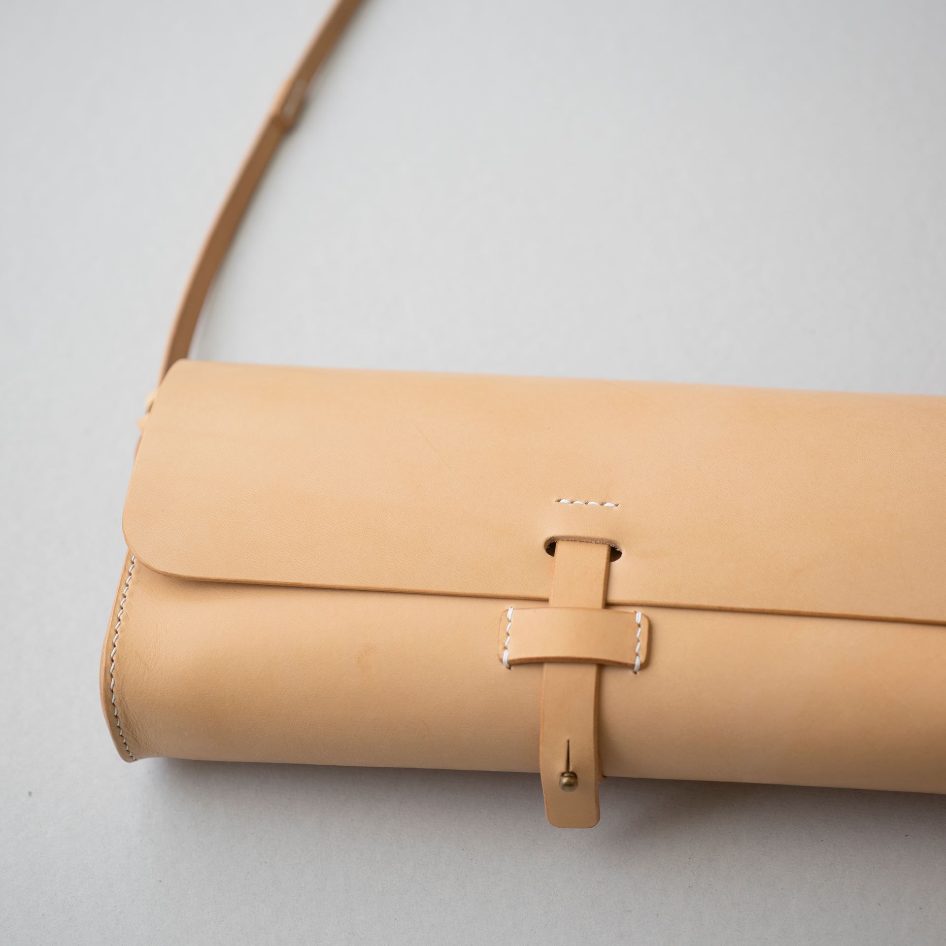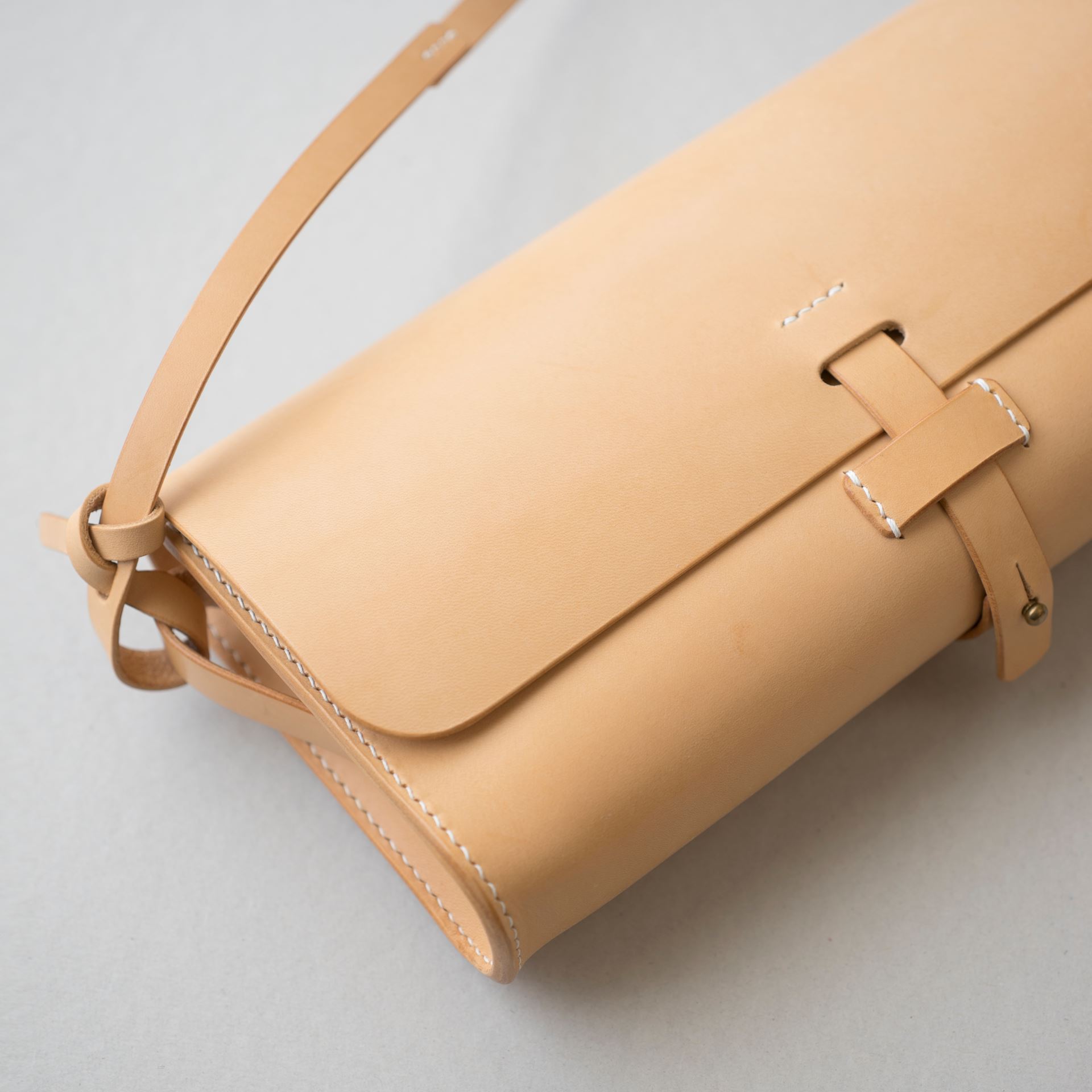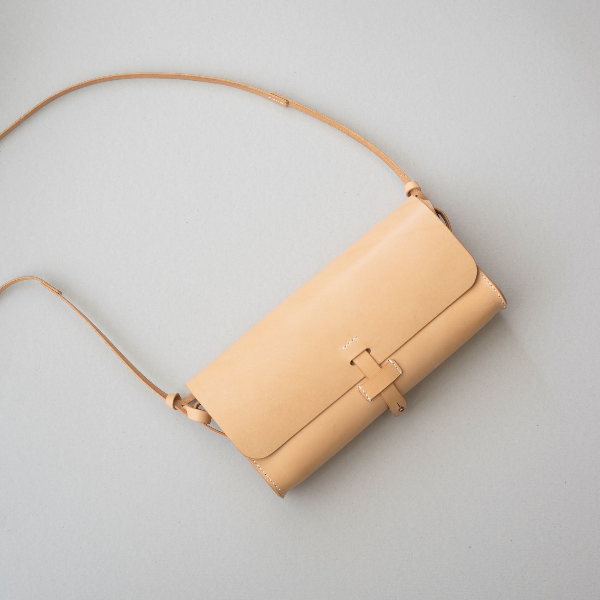 くも舎の耳つき肩かけカバンは、最上級のヌメ革を使用した横長の小さなバッグです。サイズは一般的な長財布や文庫本、携帯電話などが入る大きさです。カバンの側面には大きな耳がついていますので、長いベルトをつければショルダーバッグになります。
