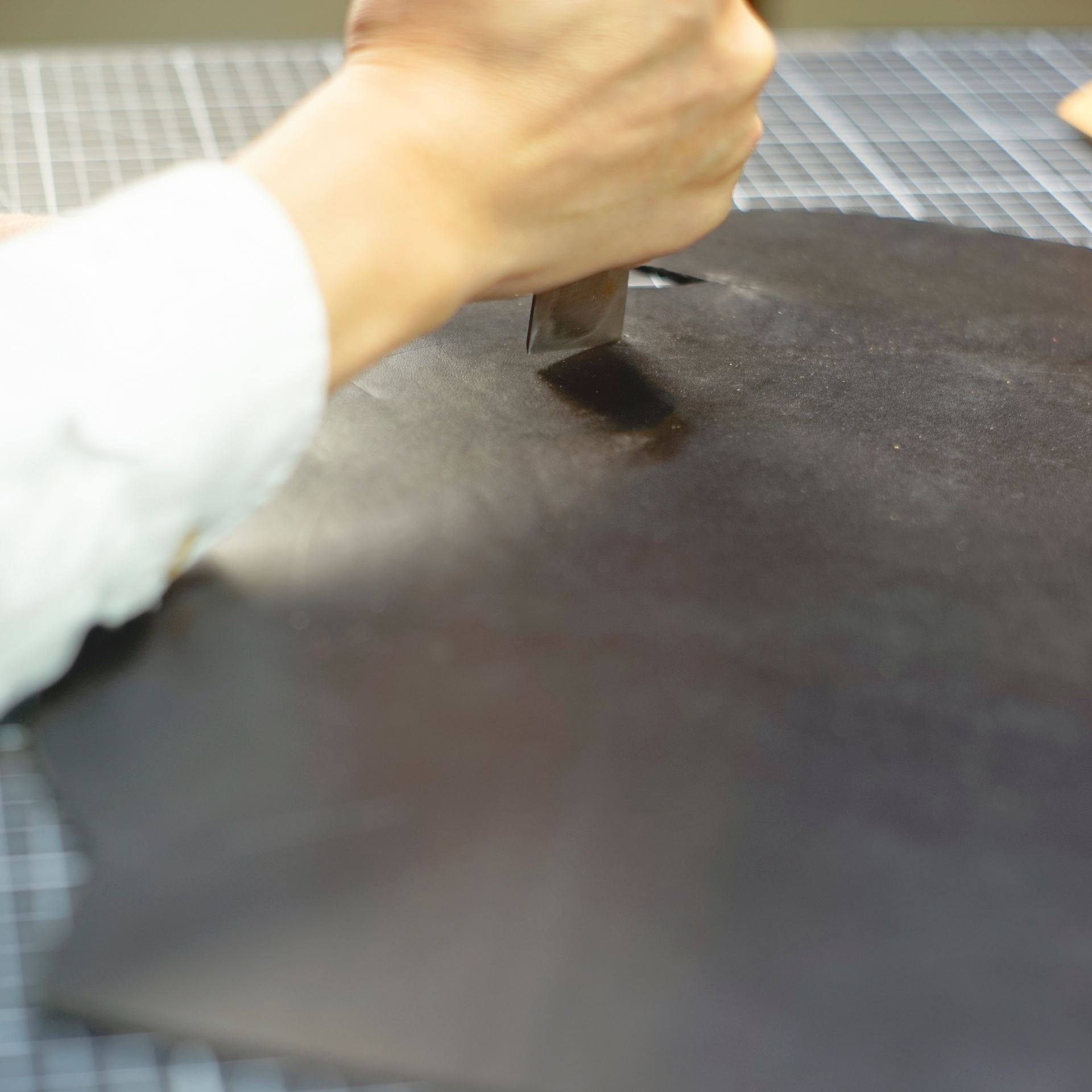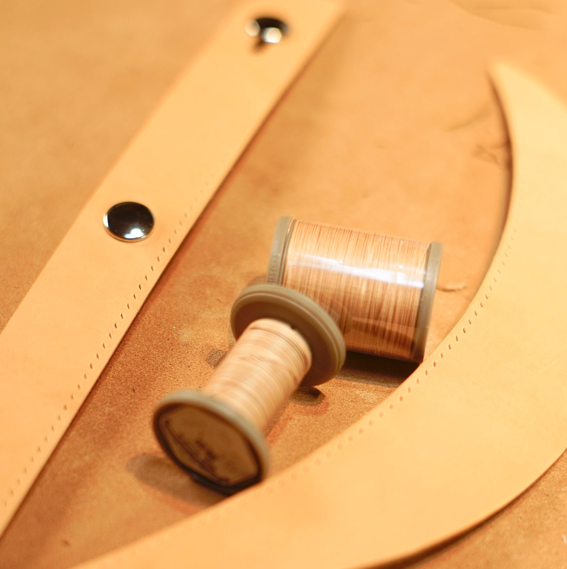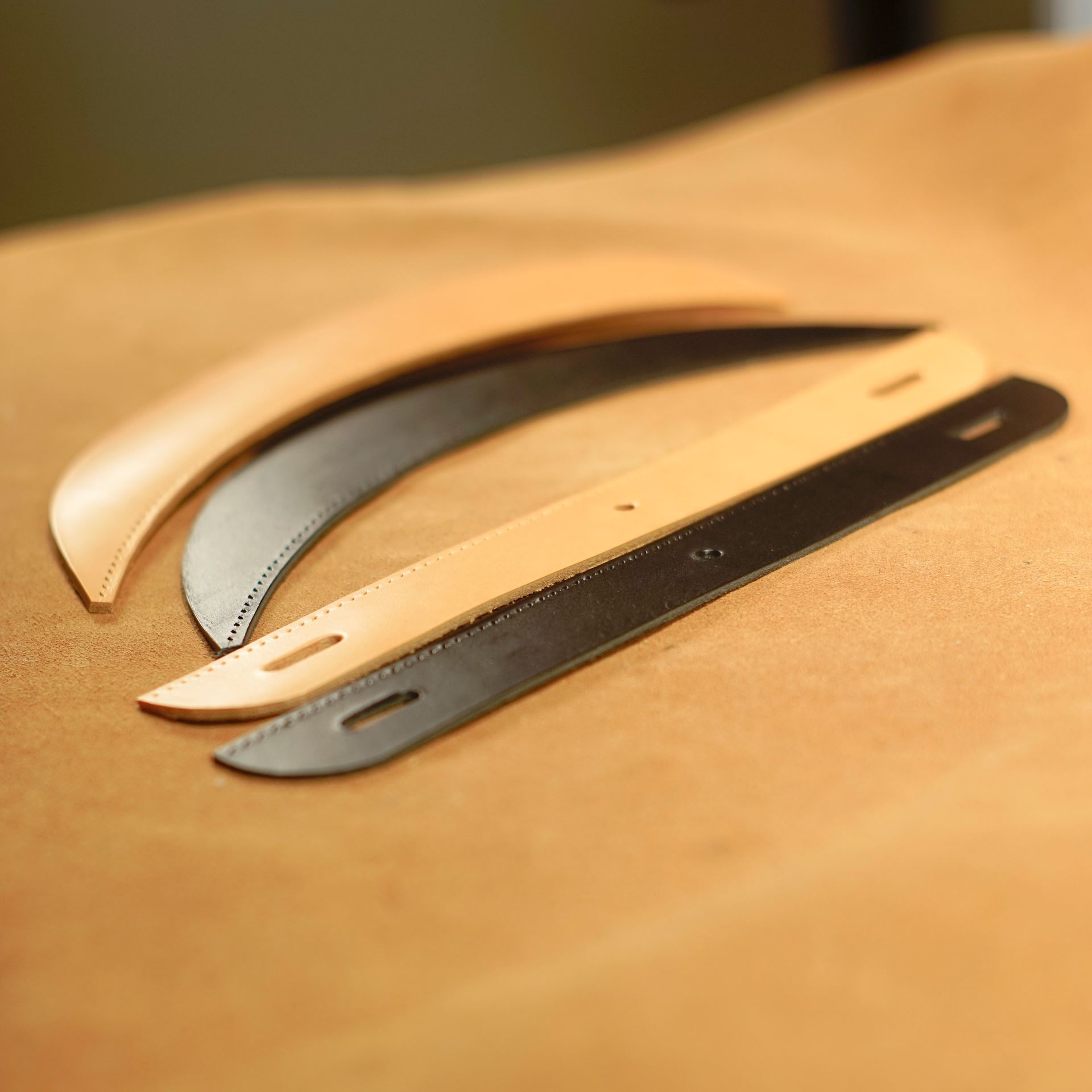 生成りと黒のイタリアンハードをカットしてパーツを切り出します。穴あけ、目打ちとジャンパーホックを取り付けます。コバは切りっぱなしで軽くエッジを丸めておきます。