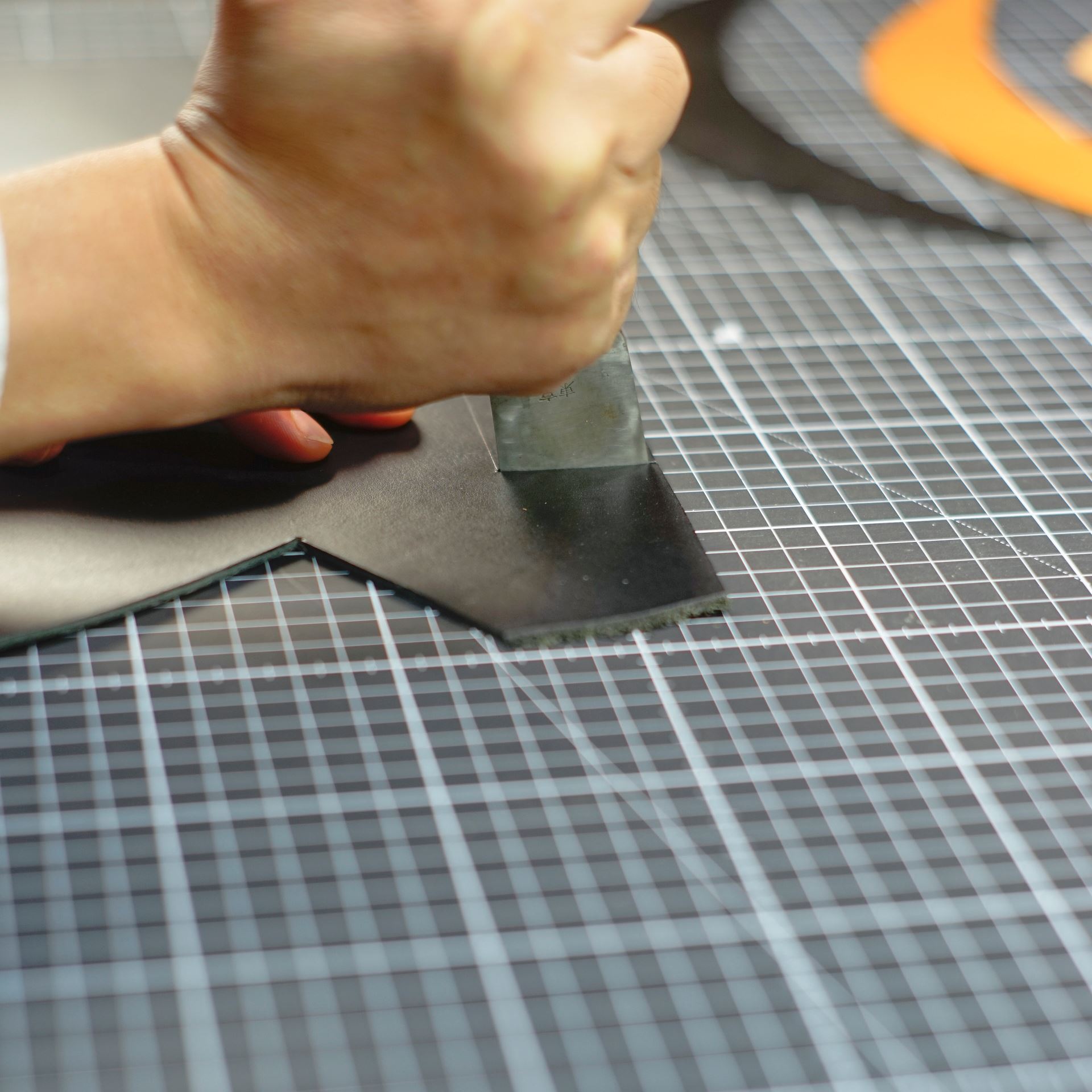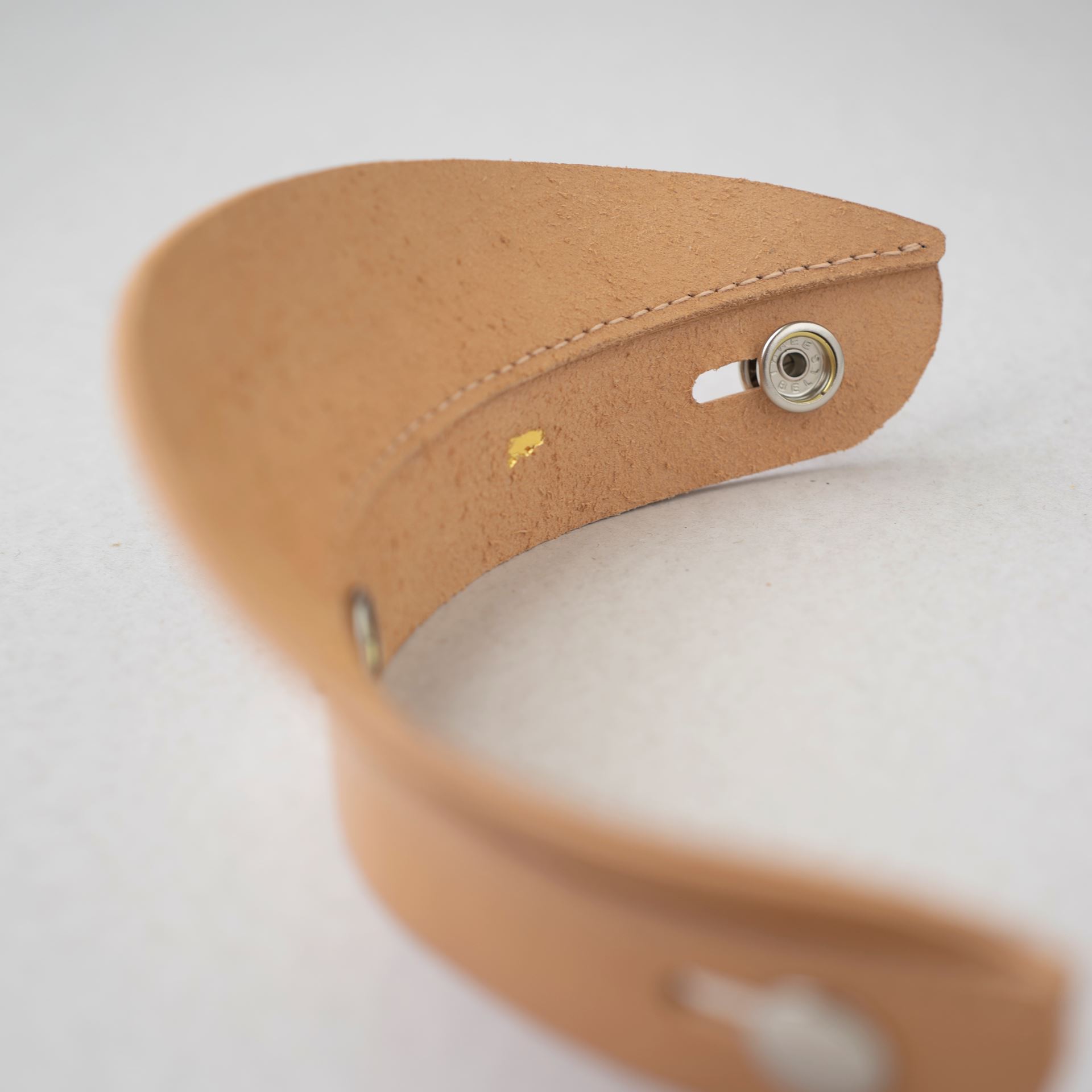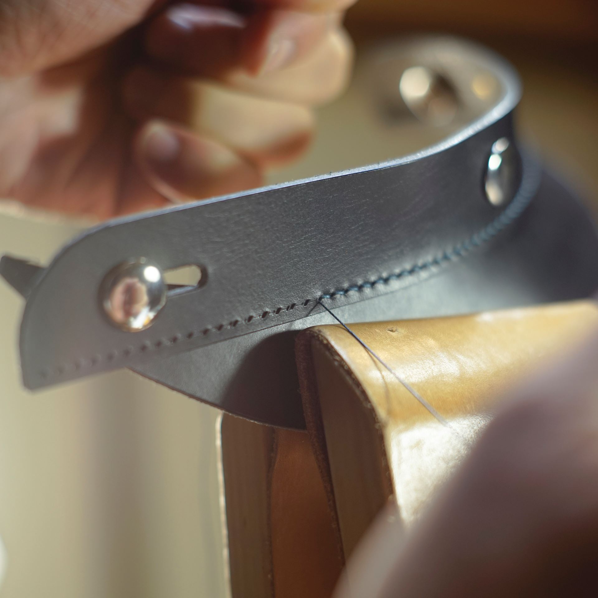 生成りと黒のイタリアンハードをカットしてパーツを切り出します。穴あけ、目打ちとジャンパーホックを取り付けます。コバは切りっぱなしで軽くエッジを丸めておきます。