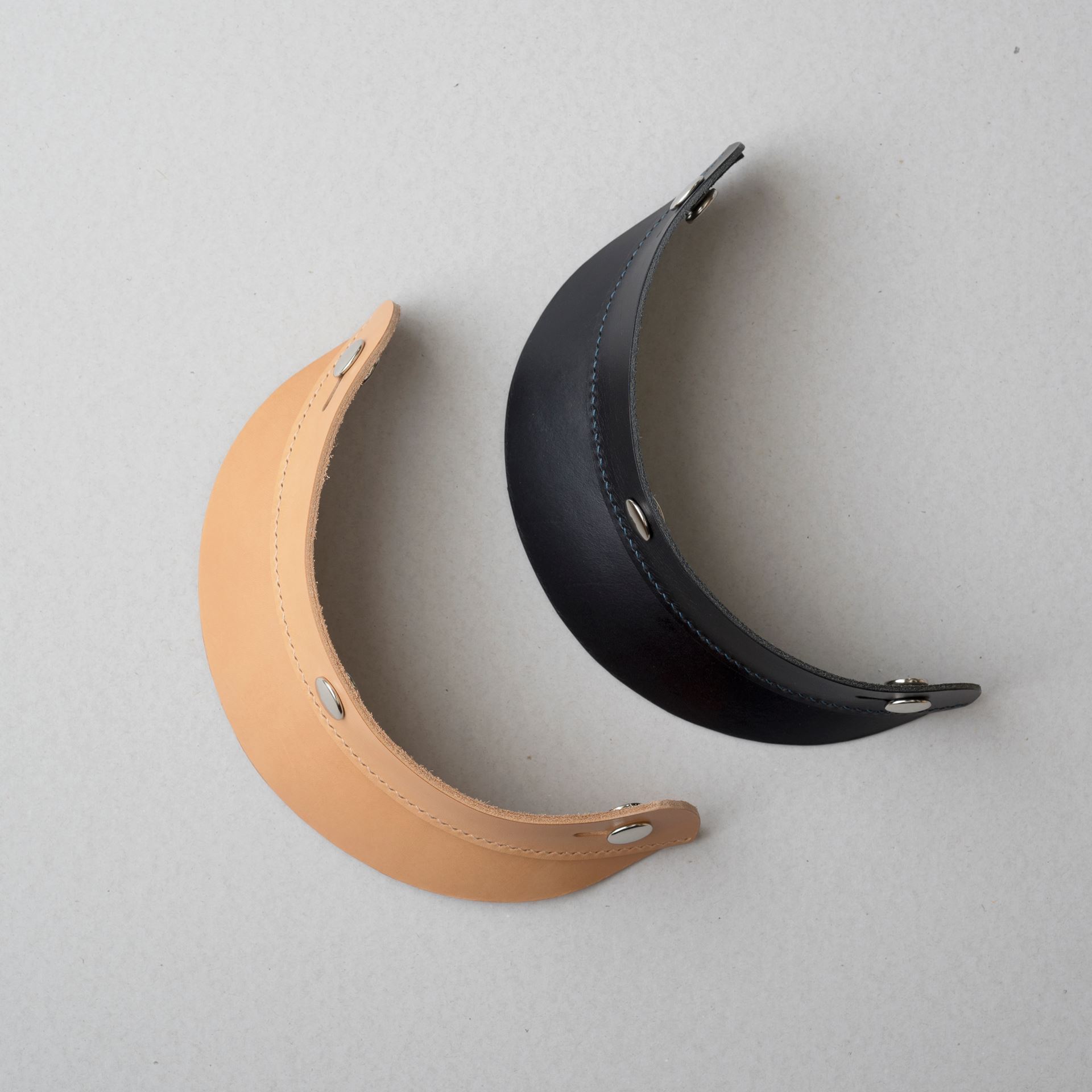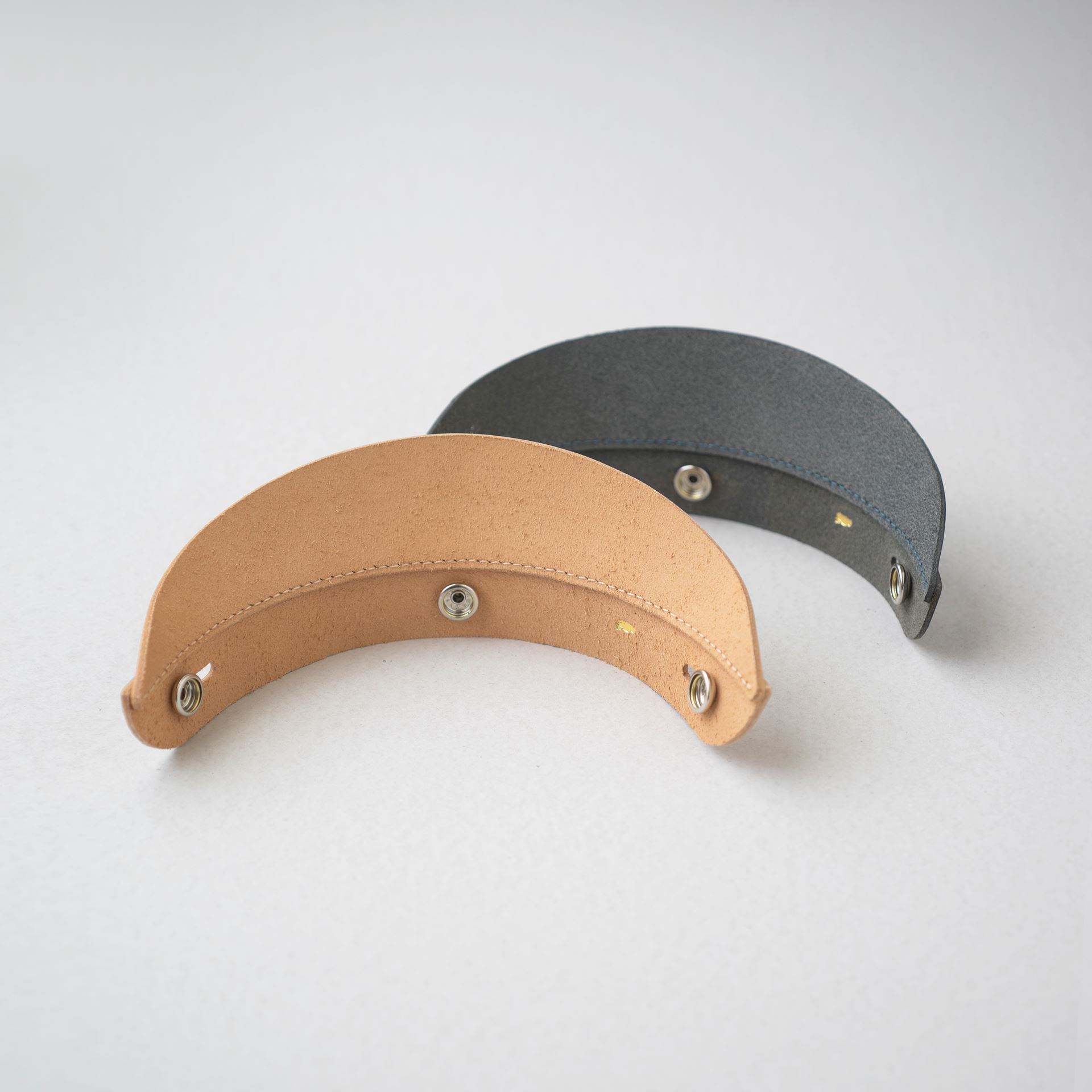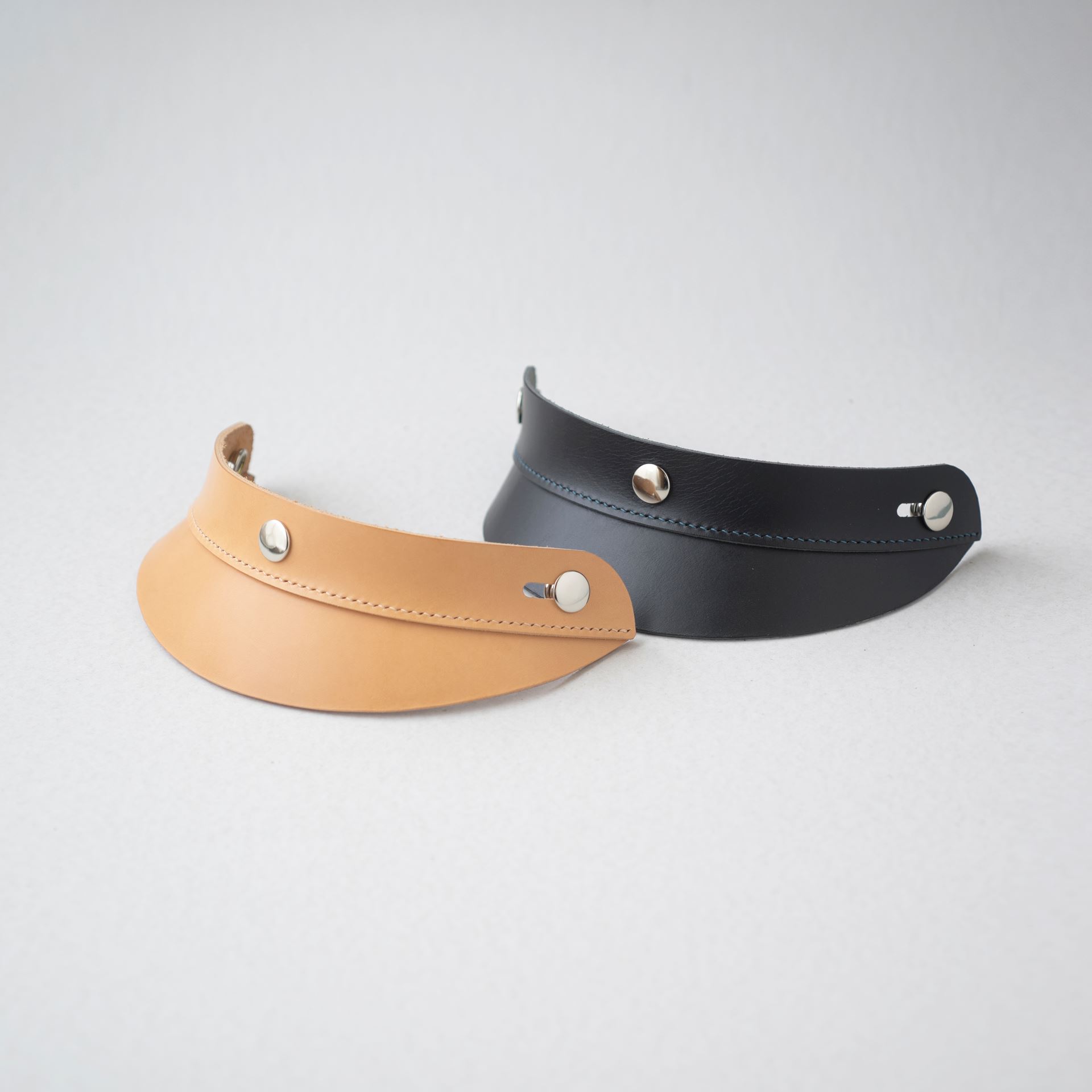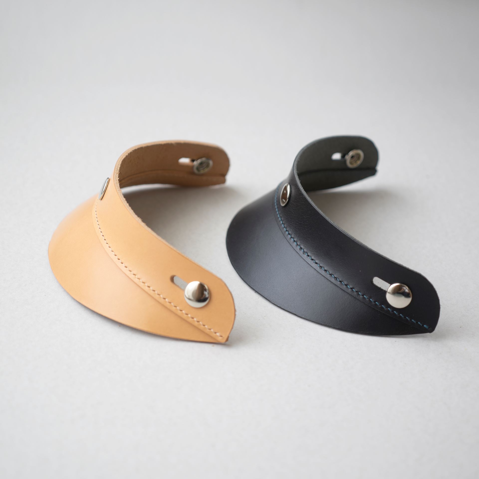 ジェットヘルメットなどに取り付けるタイプのバイザーです。漉きなしの厚みのあるヌメの1枚革を使用しています。ひさし部との連結は丈夫なリネン糸を手縫いで仕上げております。コバは切りっぱなしでエッジの立ったシャープな作りです。植物タンニン鞣し革の経年変化を楽しめると思います。両端のホックは可動しますので、大抵のヘルメットには取り付け可能です。