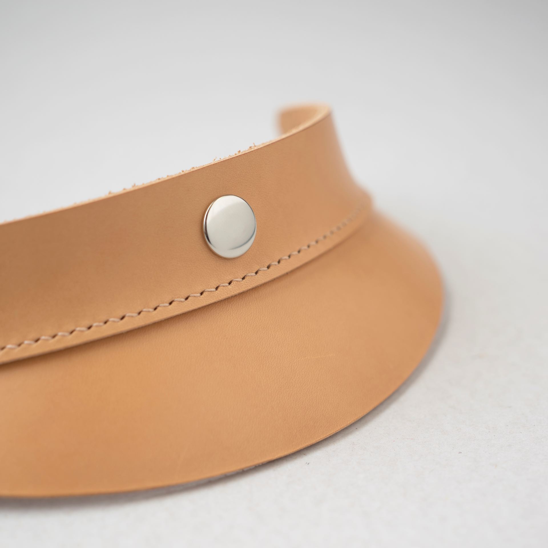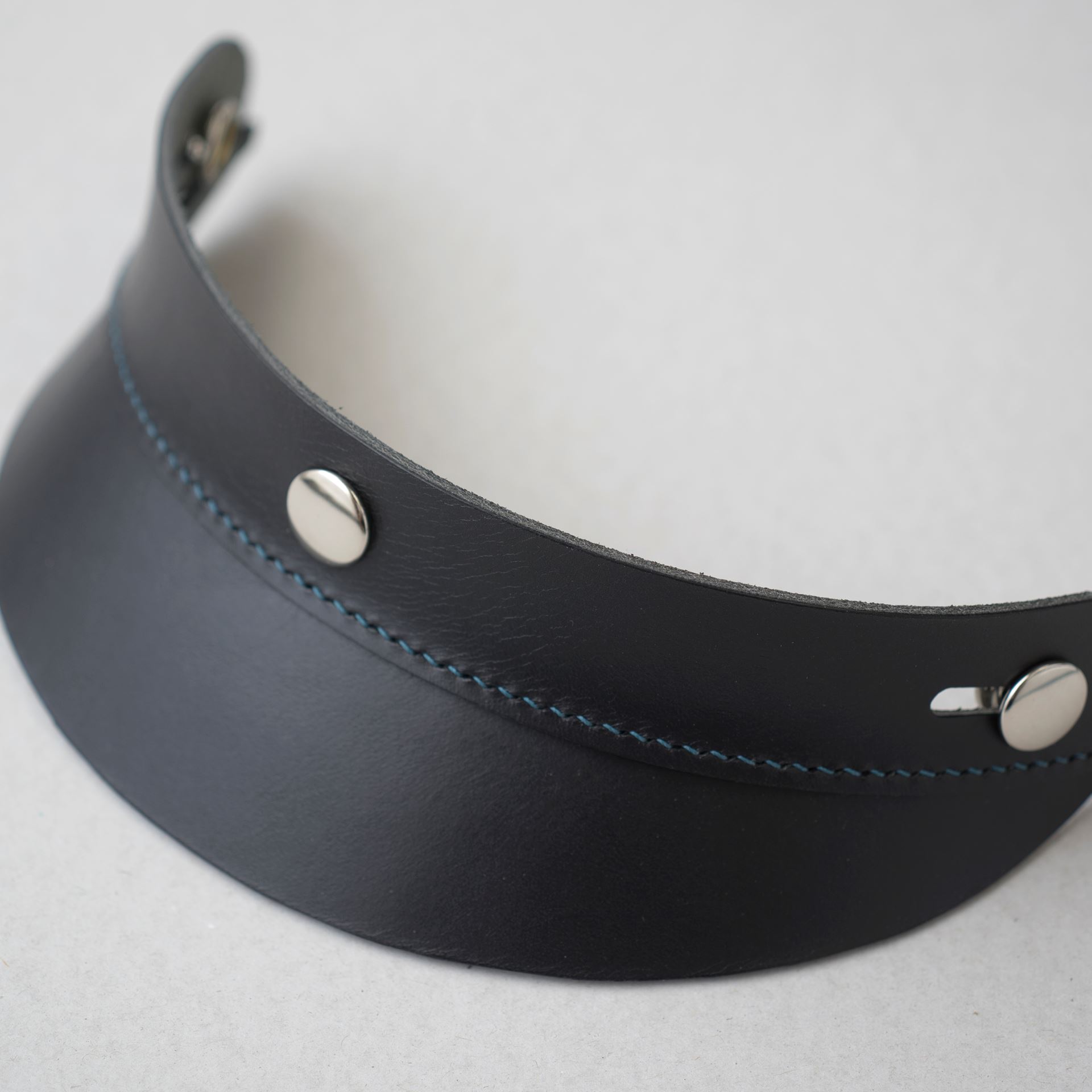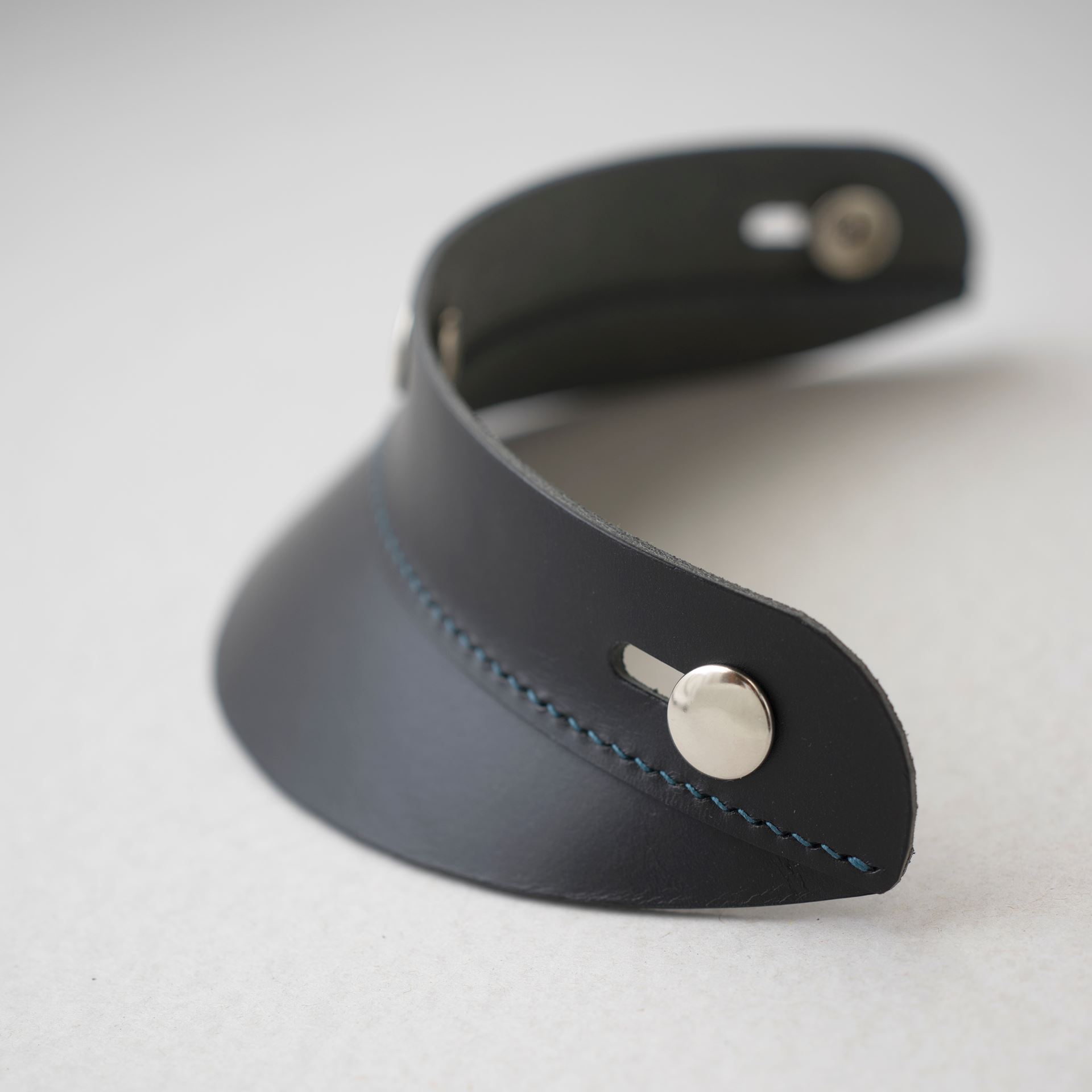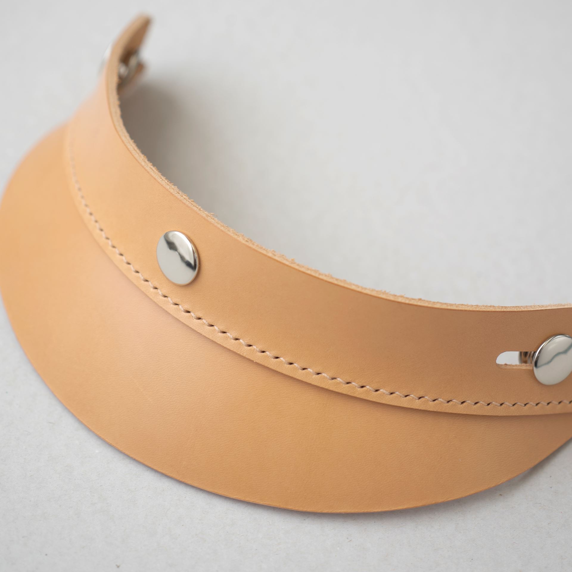 ジェットヘルメットなどに取り付けるタイプのバイザーです。漉きなしの厚みのあるヌメの1枚革を使用しています。ひさし部との連結は丈夫なリネン糸を手縫いで仕上げております。コバは切りっぱなしでエッジの立ったシャープな作りです。植物タンニン鞣し革の経年変化を楽しめると思います。両端のホックは可動しますので、大抵のヘルメットには取り付け可能です。