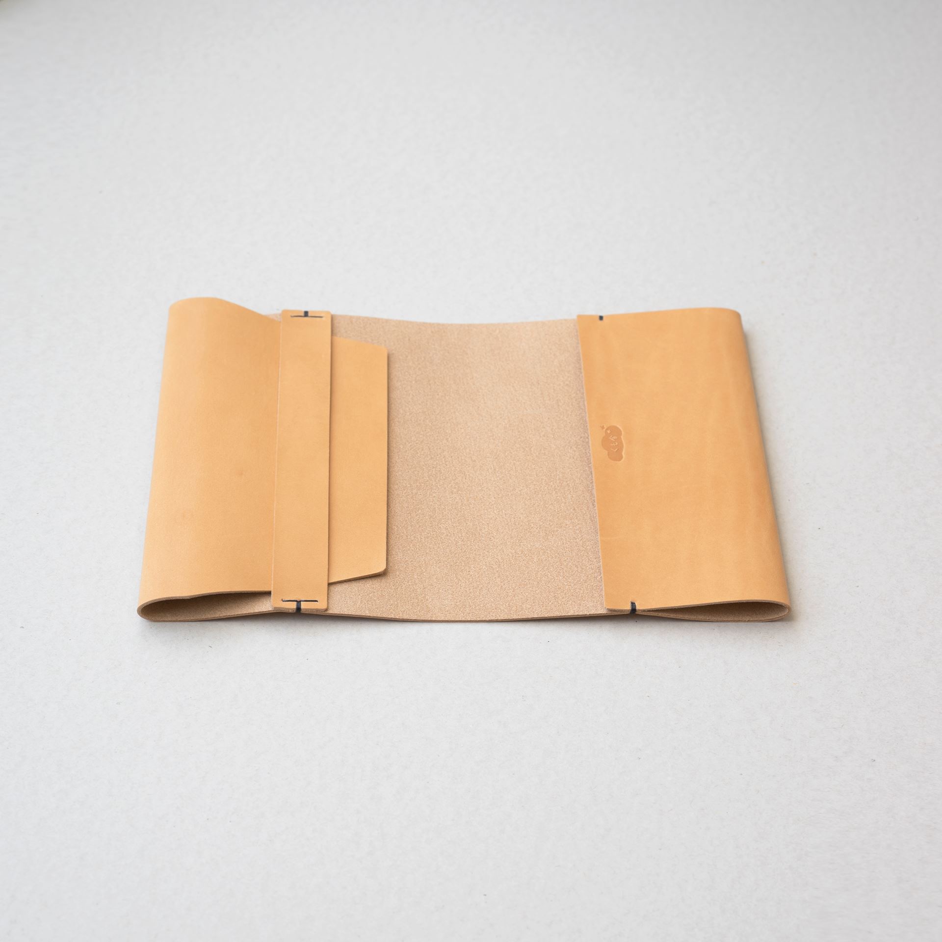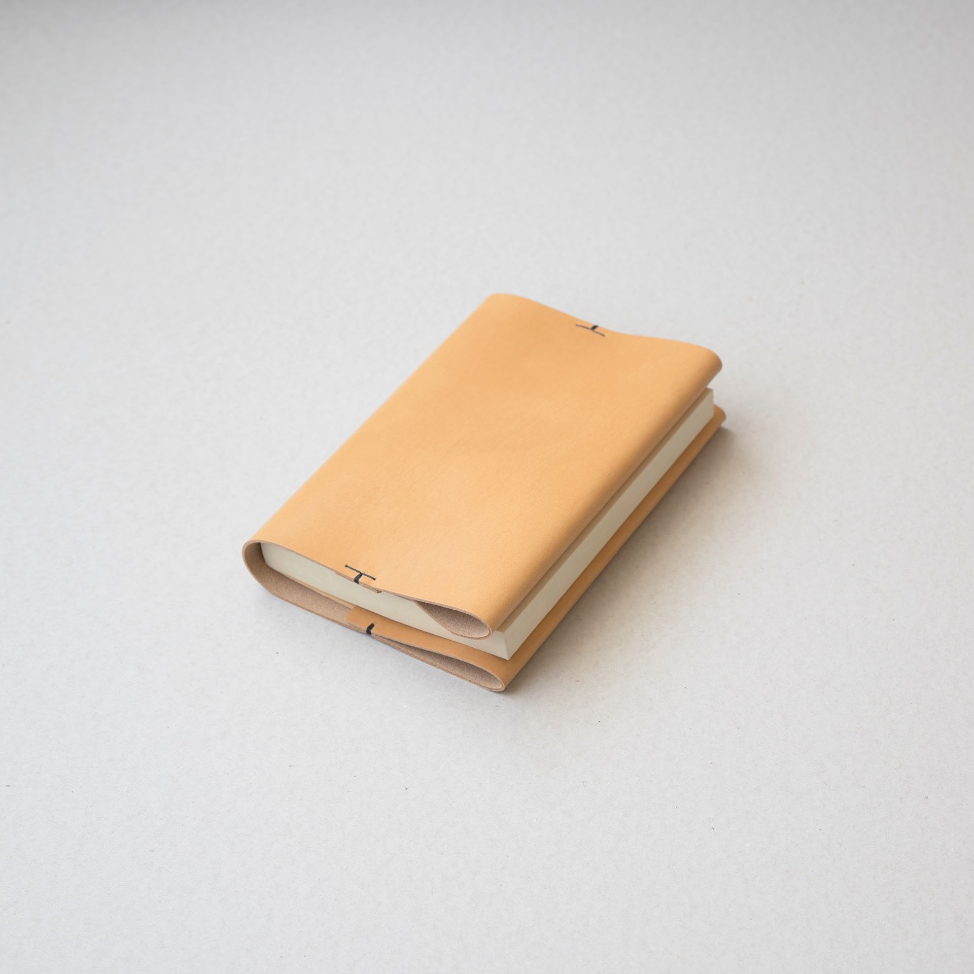 植物タンニン鞣し革に麻糸で手縫いを施したシンプルなつくりです。差込部にステッチを入れることで、ブックカバー1型をよりスマートに、本を読みやすく進化させました。
