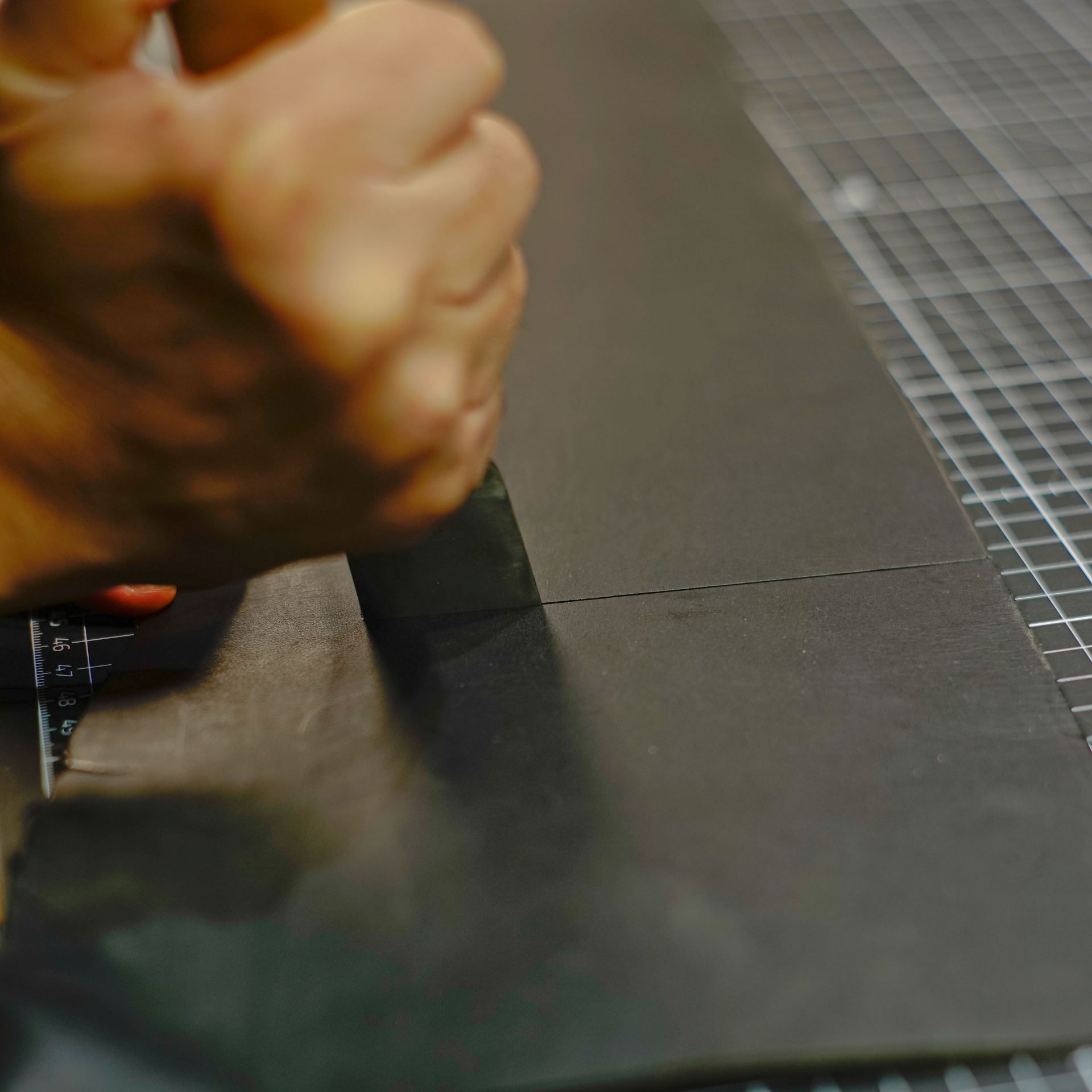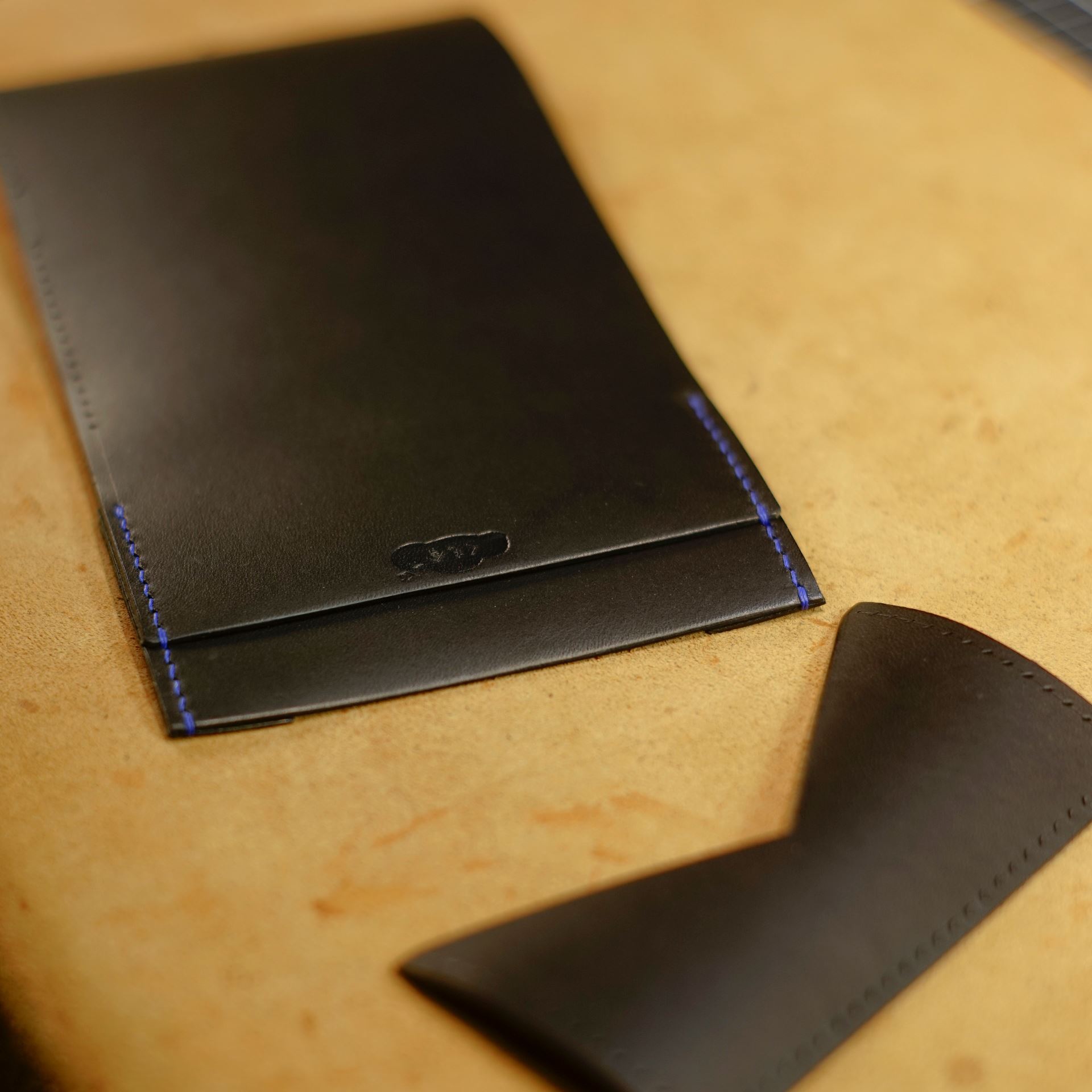 今回ご指定の革はイタリアンソフトのネロ(黒)になります。革をカットして刻印を打刻します。磨けるコバは先に磨いておきます。