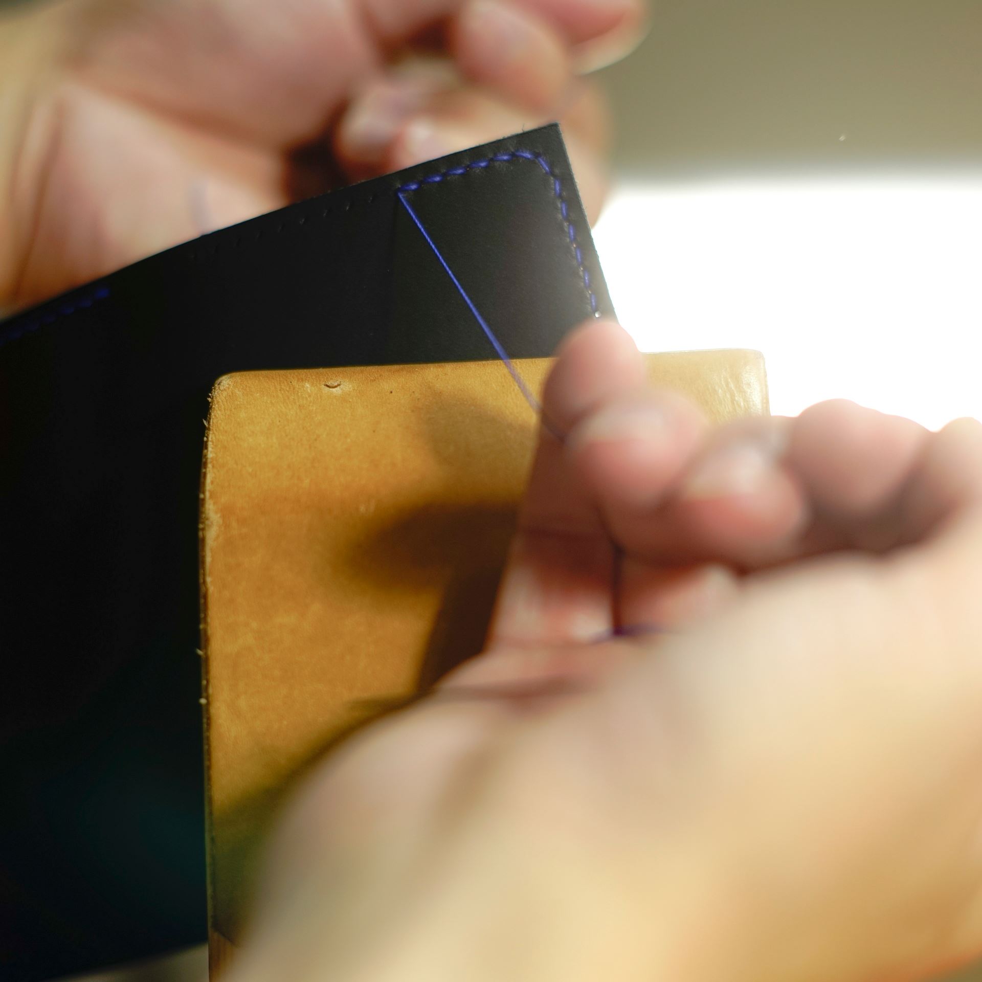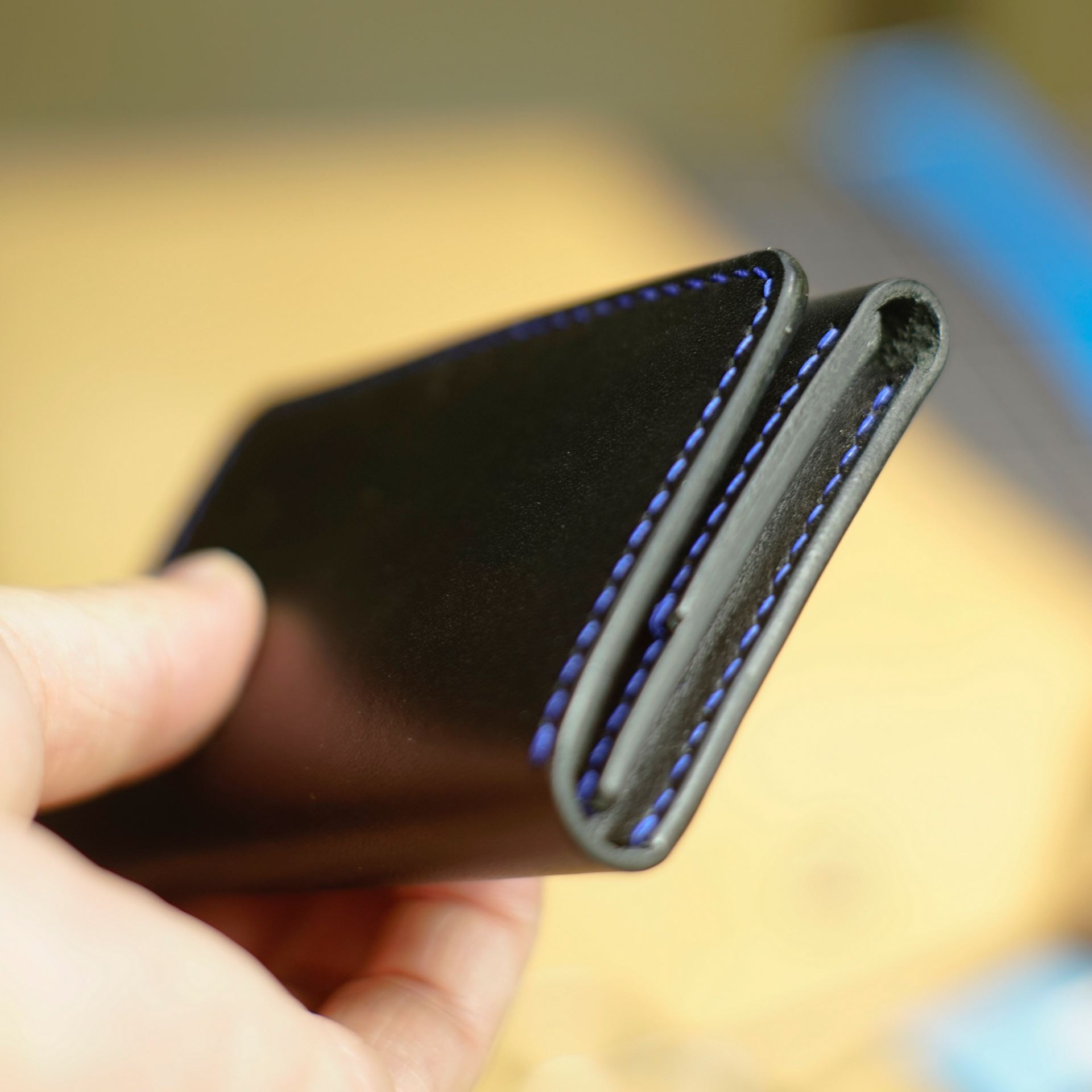 全てのステッチが終了しましたので、最後にコバ(革の断面)磨きで仕上げれば完成となります。