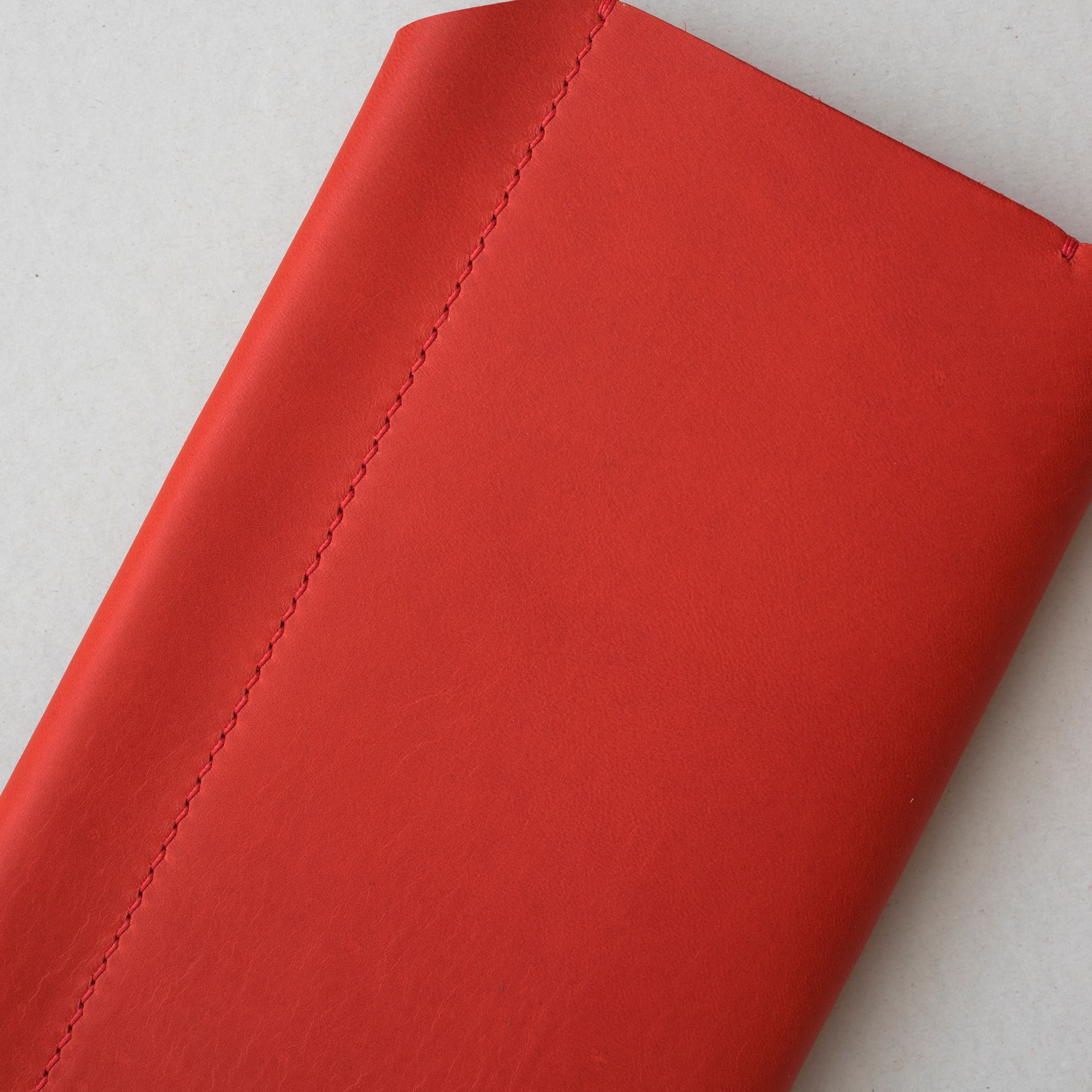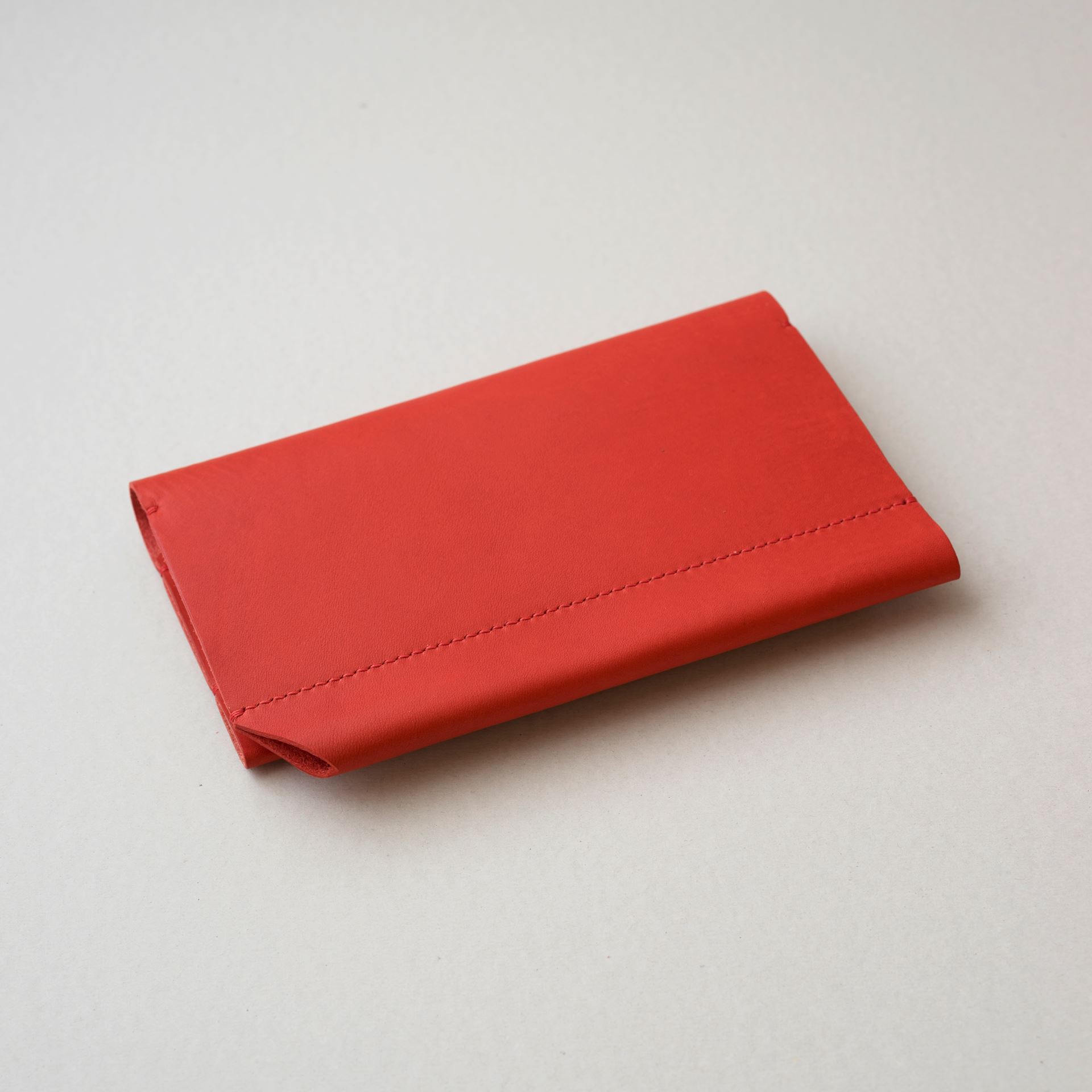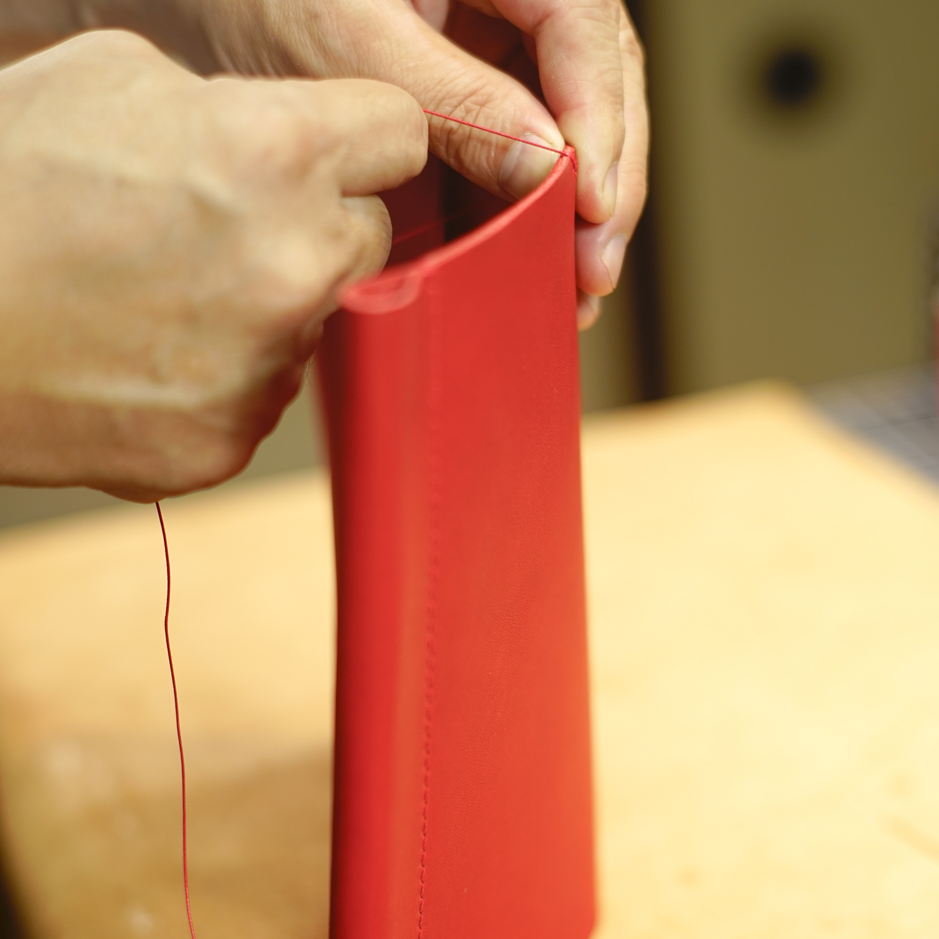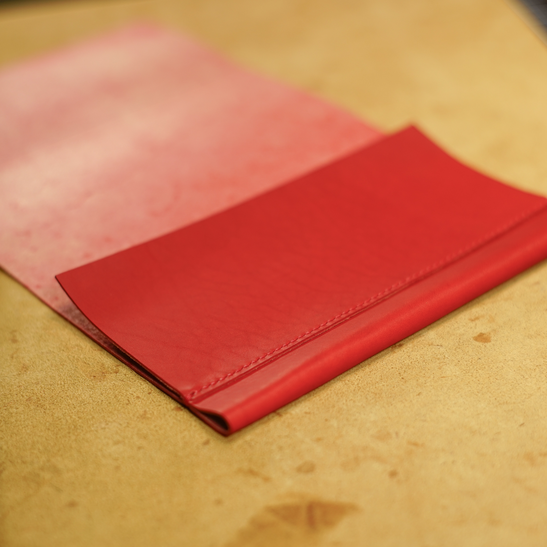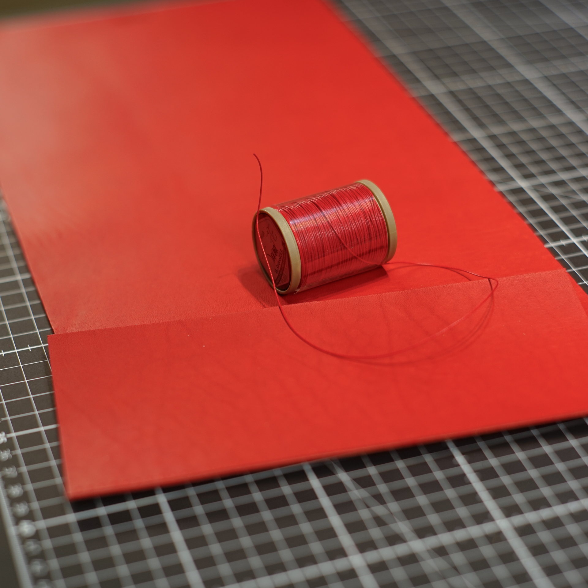 イタリアンソフトの特注色パパベロを切り出して目打ち、刻印を入れて手縫いの下準備です。革と同色の糸という事で、六花リネン糸の53金赤でステッチを入れることにしました。