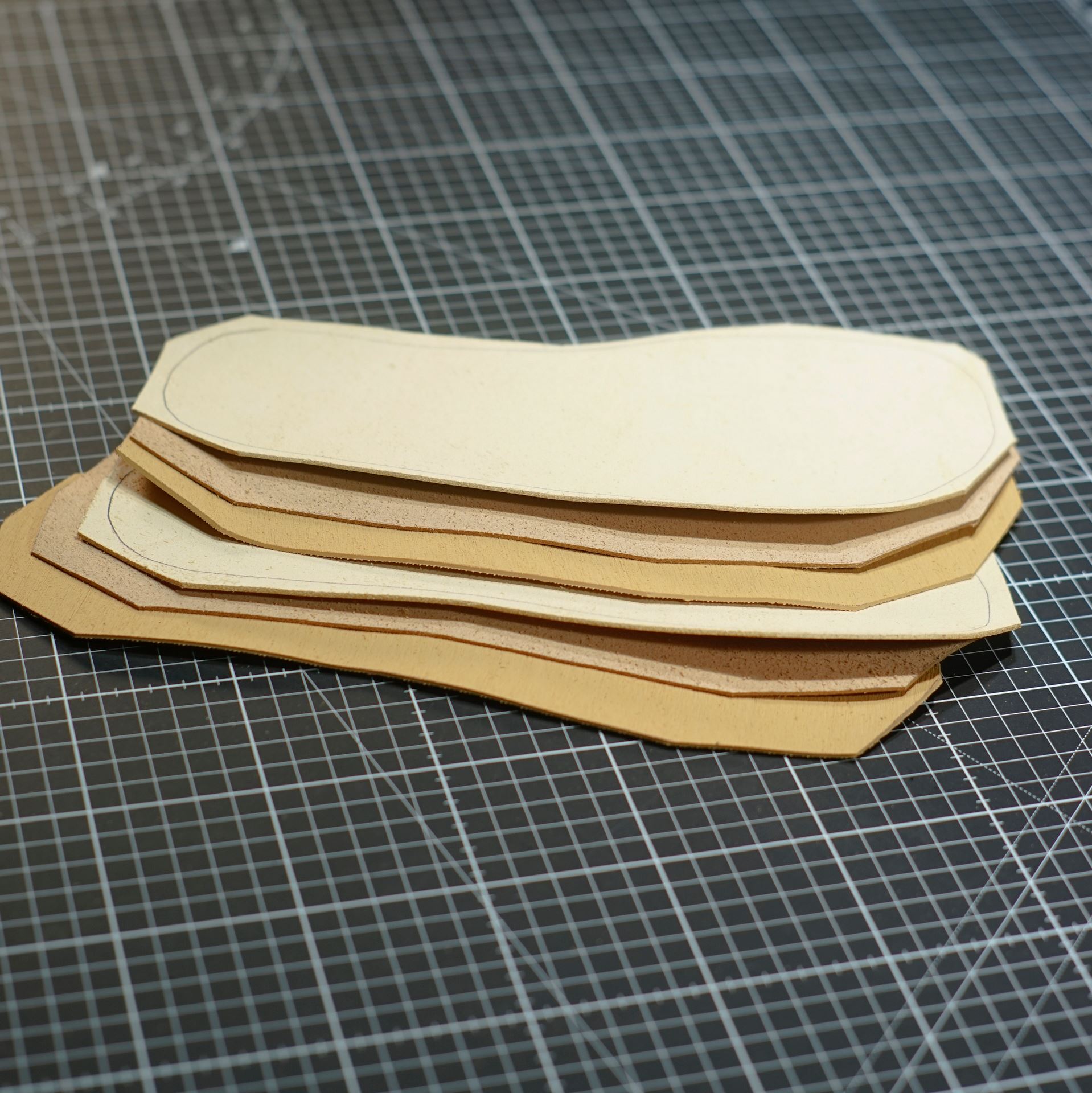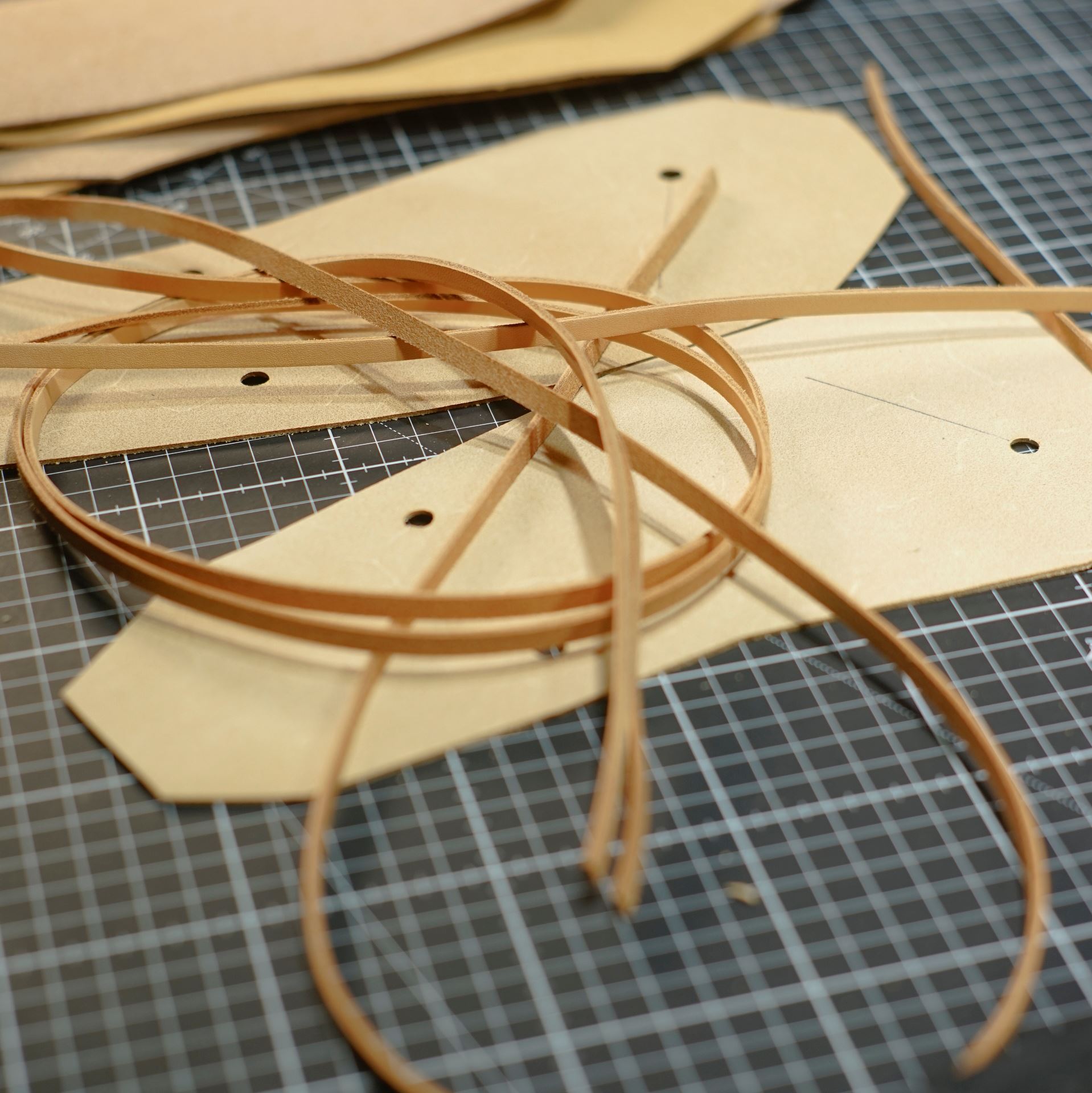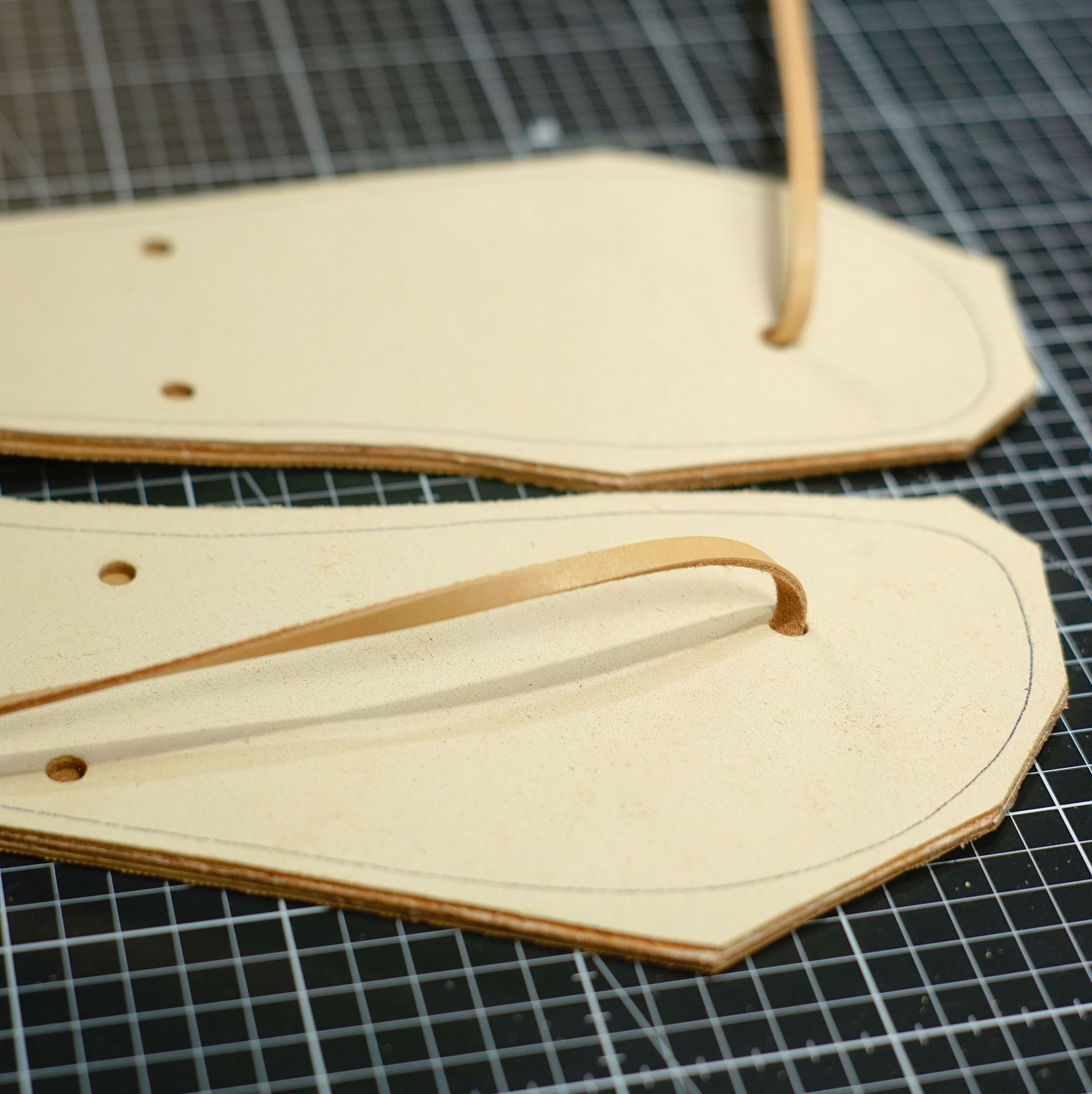 生成りベースでの制作になります。ビブラム底仕様となりますので、革とビブラムソールを切り出して、革ひもとソールの貼り合わせから穴あけを行います。Iさんのご希望で生成りひもを使用します。