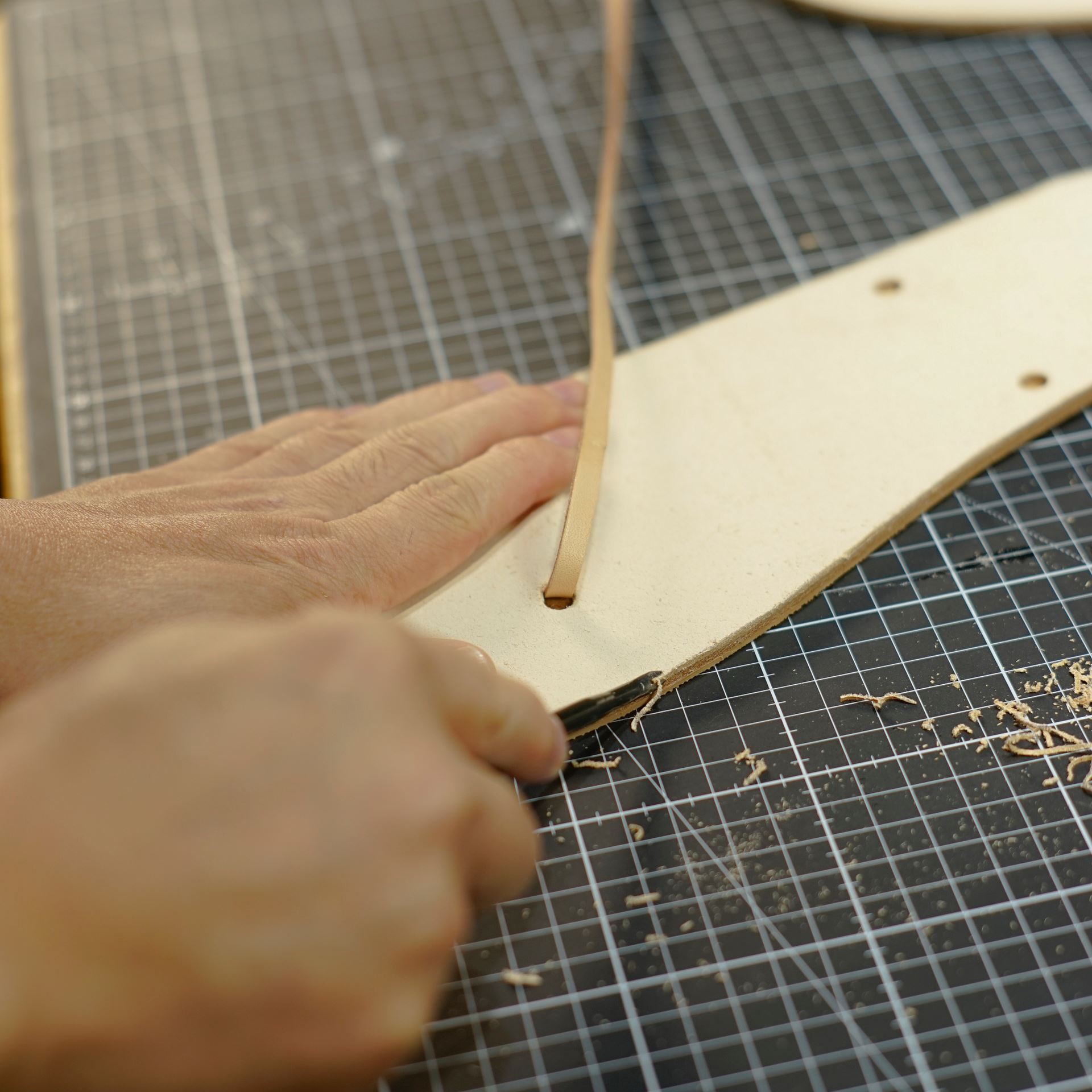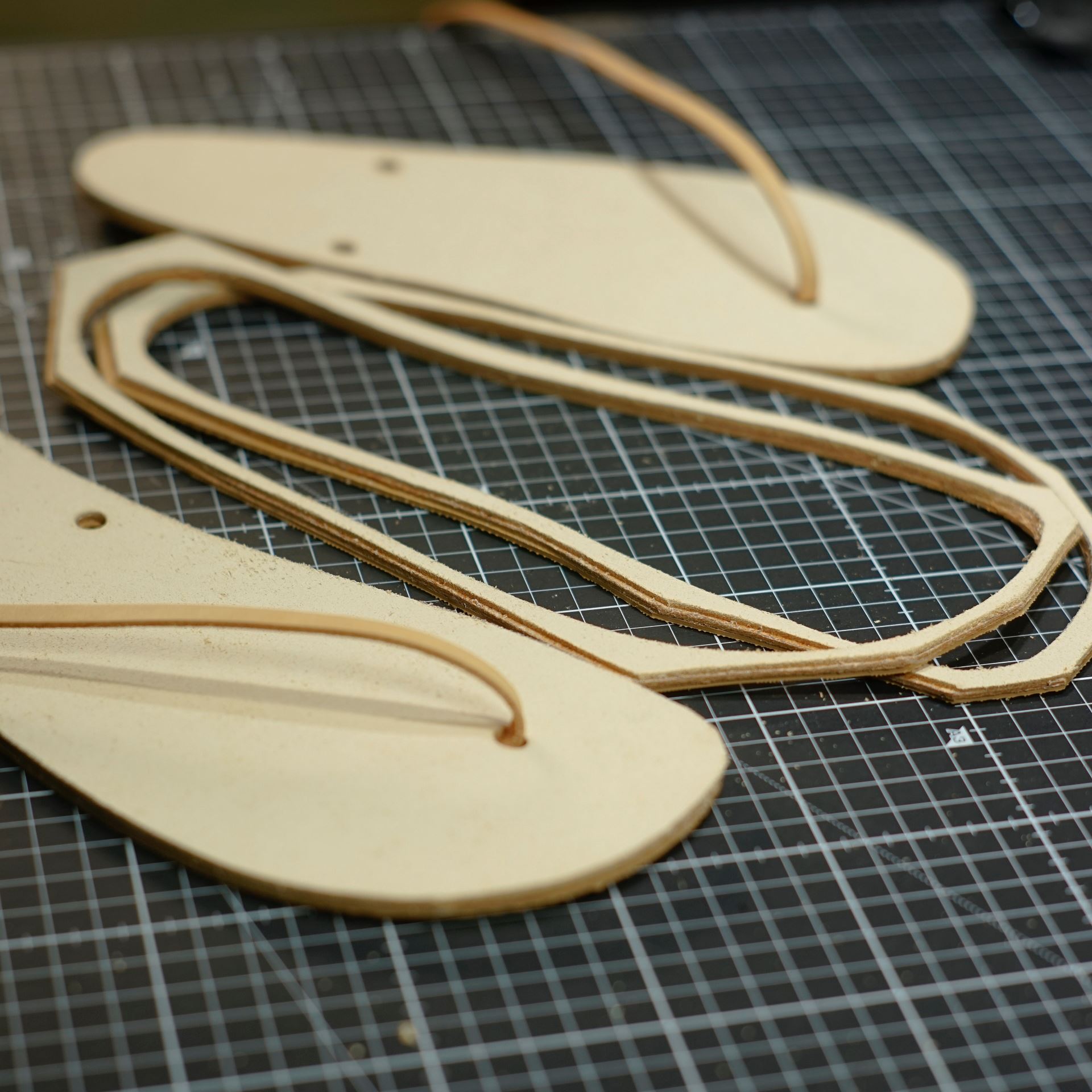 革とソールを手作業で切り抜きします。曲線と切口のエッジが綺麗に仕上がります。