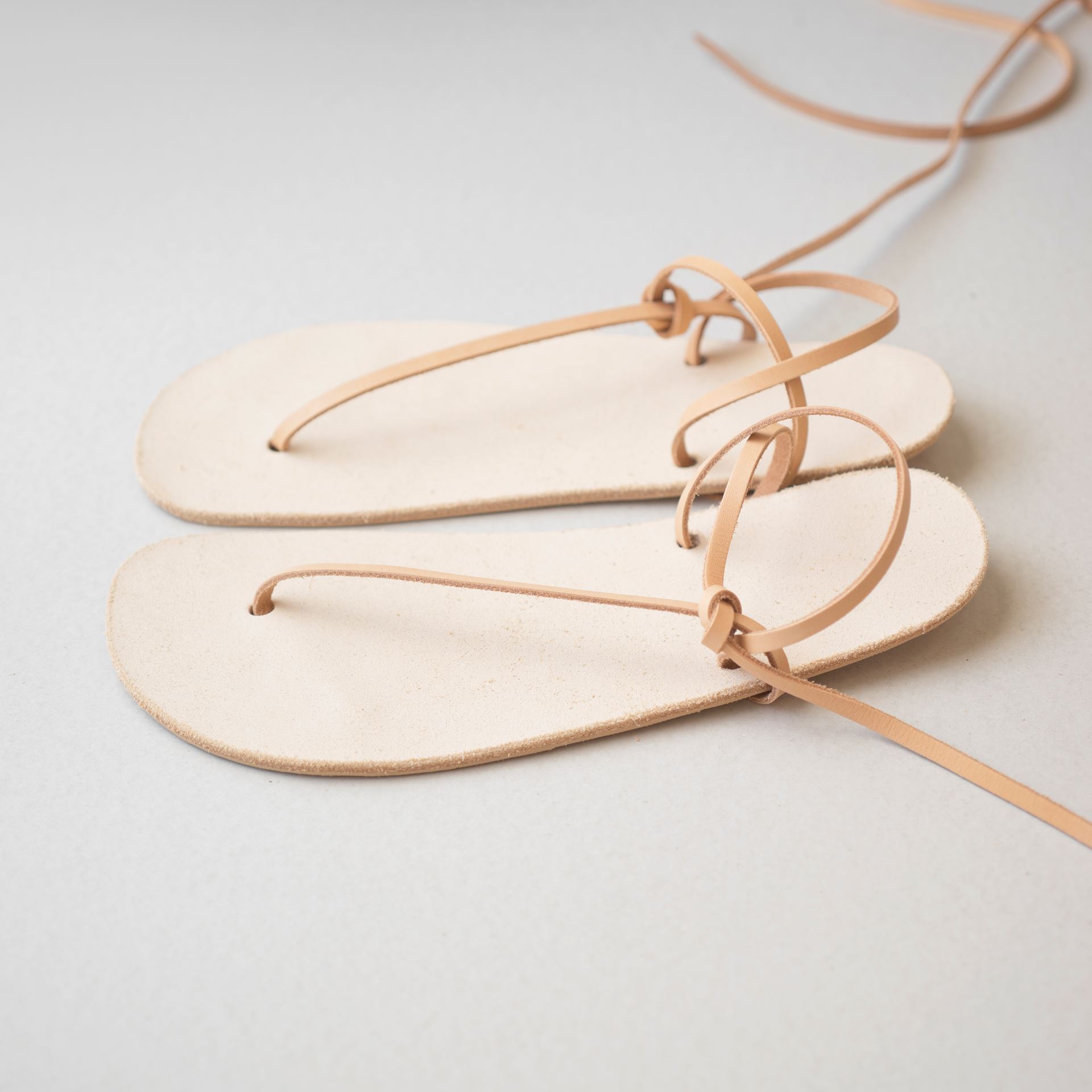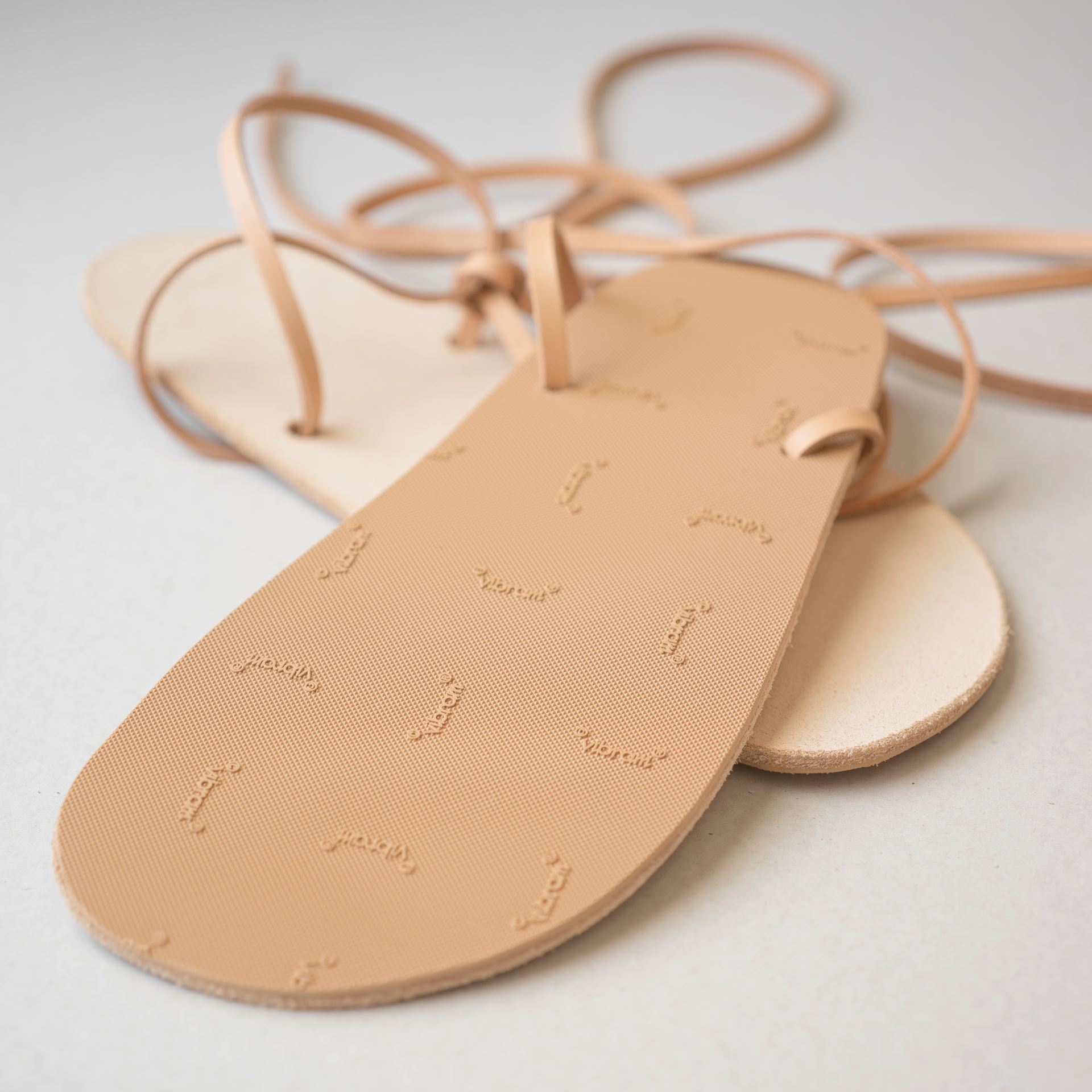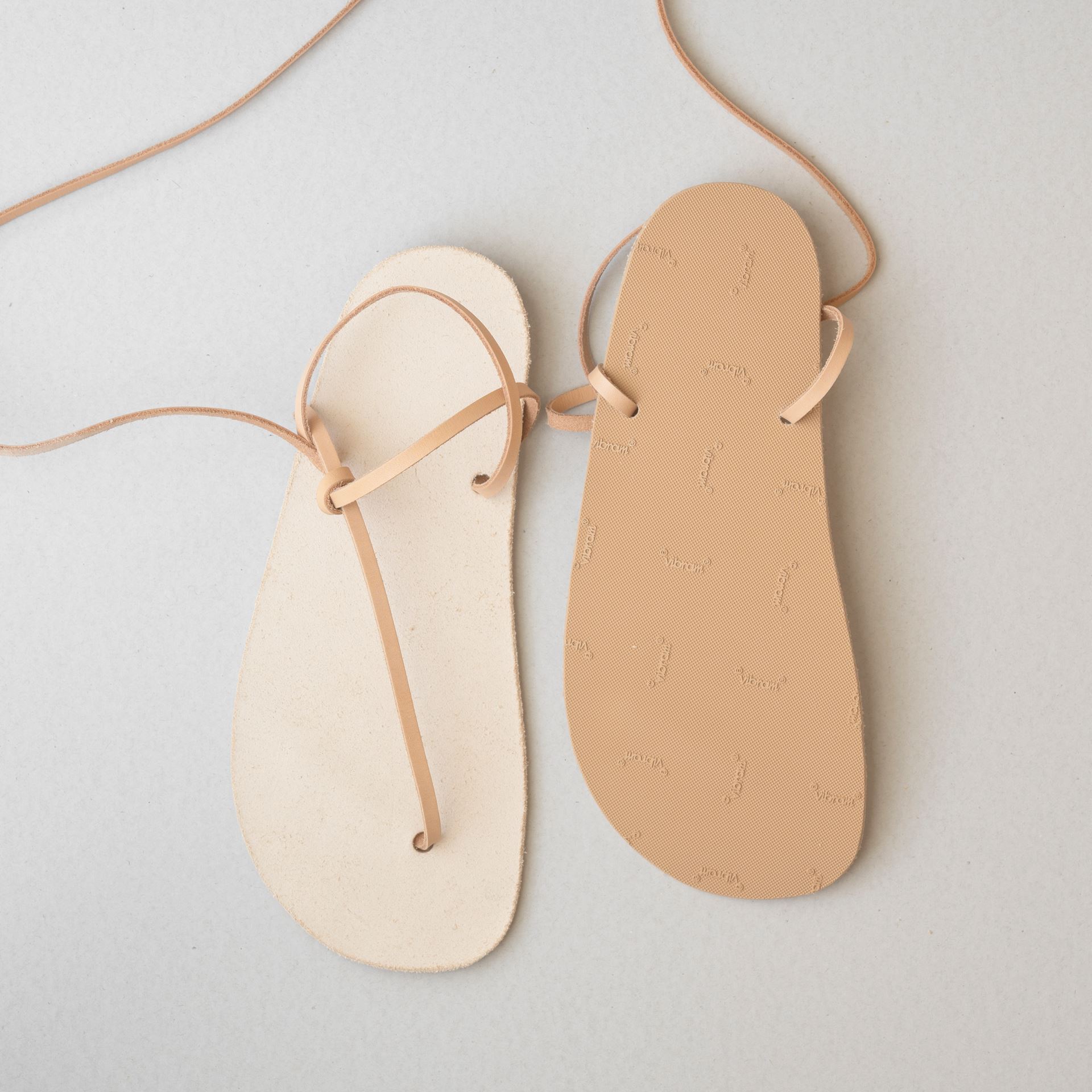 メキシコ山岳部のタラウマラ族が古タイヤと革ひもだけで作ったサンダルを参考に、普段街中を『歩くためのサンダル』に特化させて、丁寧に手作りしたのがくも舎のワラーチです。牛革紐1本で足をしっかりホールドします。一本の革紐から生まれる開放感を楽しめます。