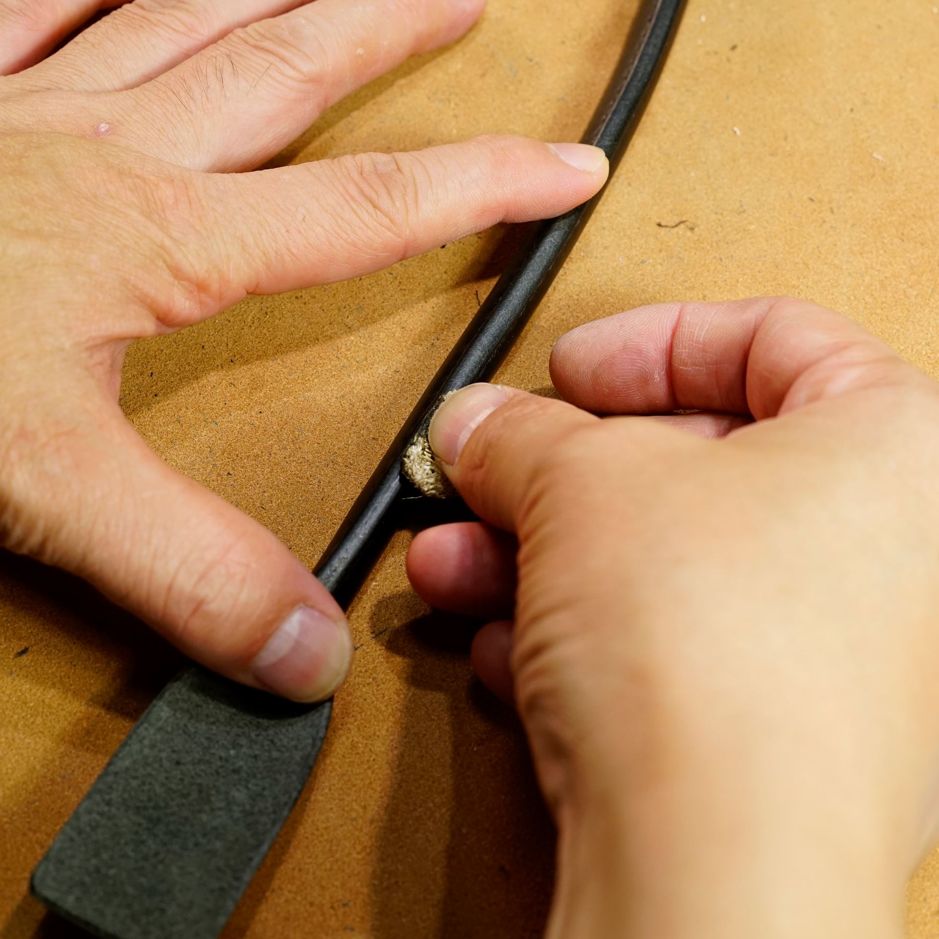 持手をもう一本縫い上げましたので、持手のコバを磨きます。ヘリ落としとヘチマ磨きで程よく均します。