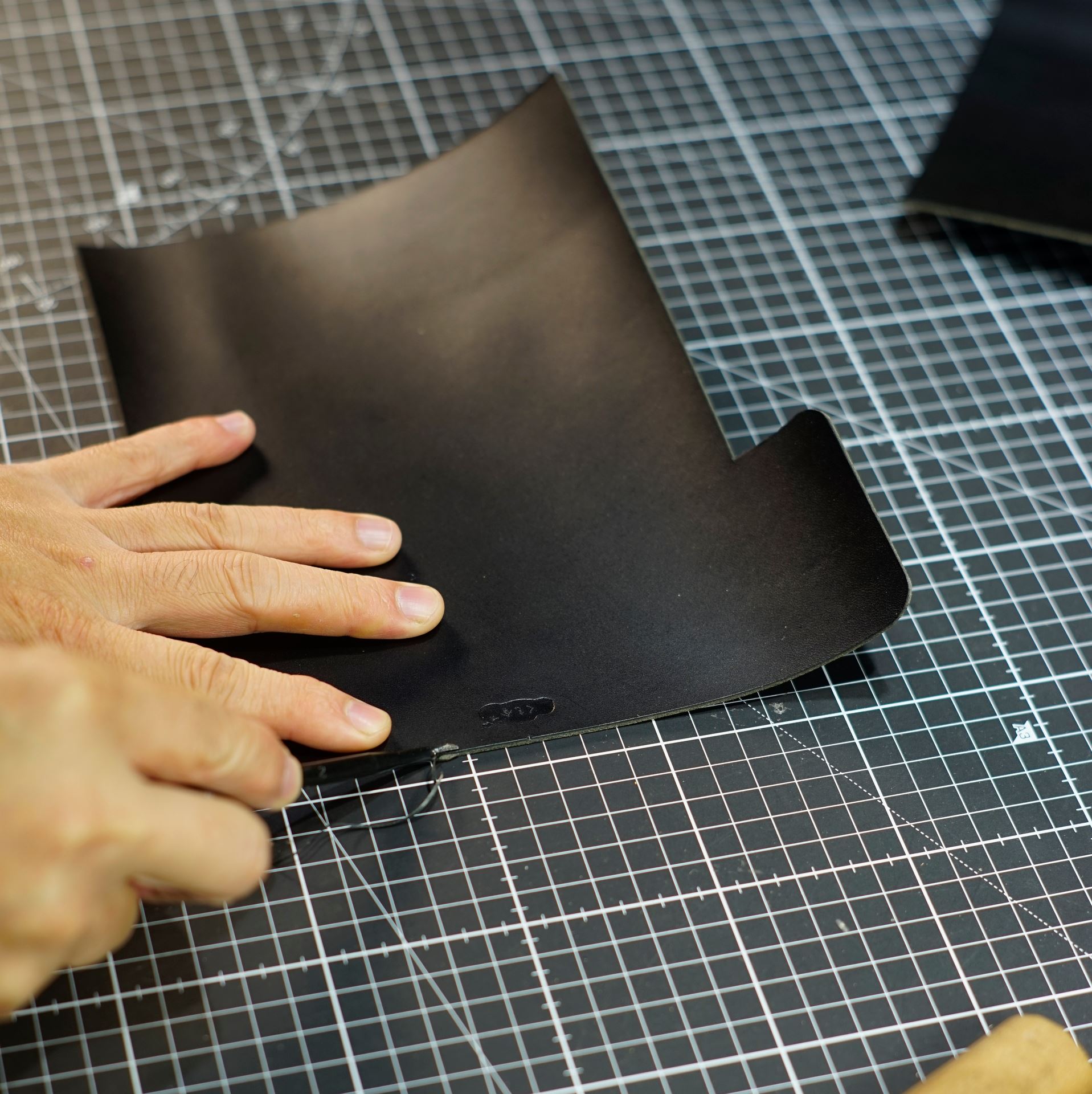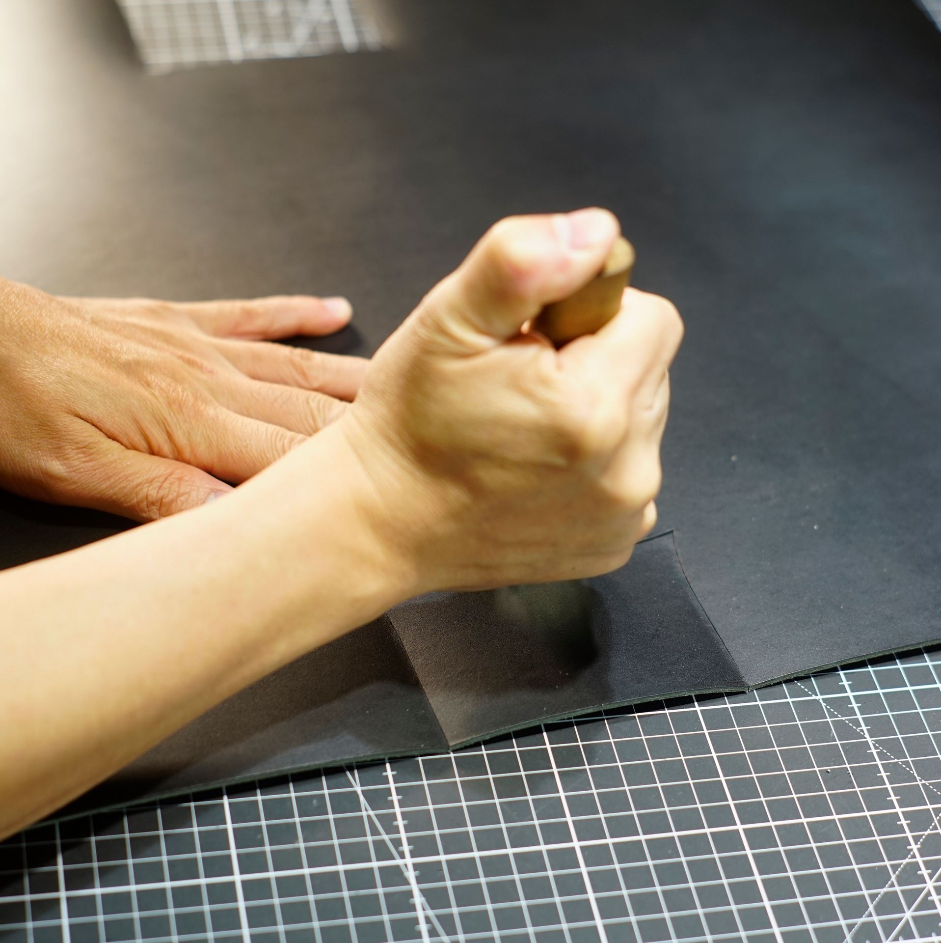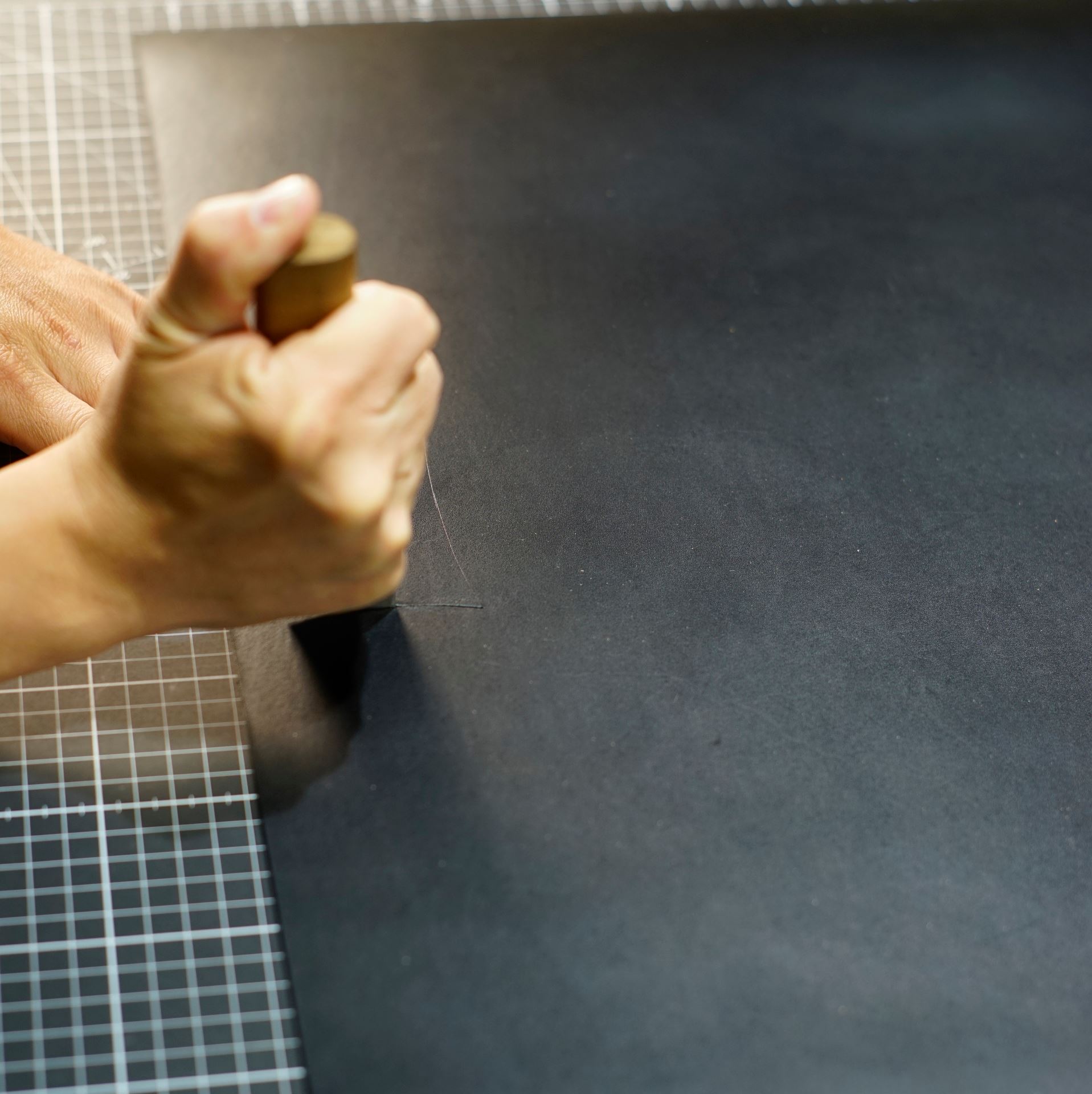 トートバッグ本体の制作に取り掛かります。型紙に合わせてケガキ線を入れ、革包丁で切り出していきます。