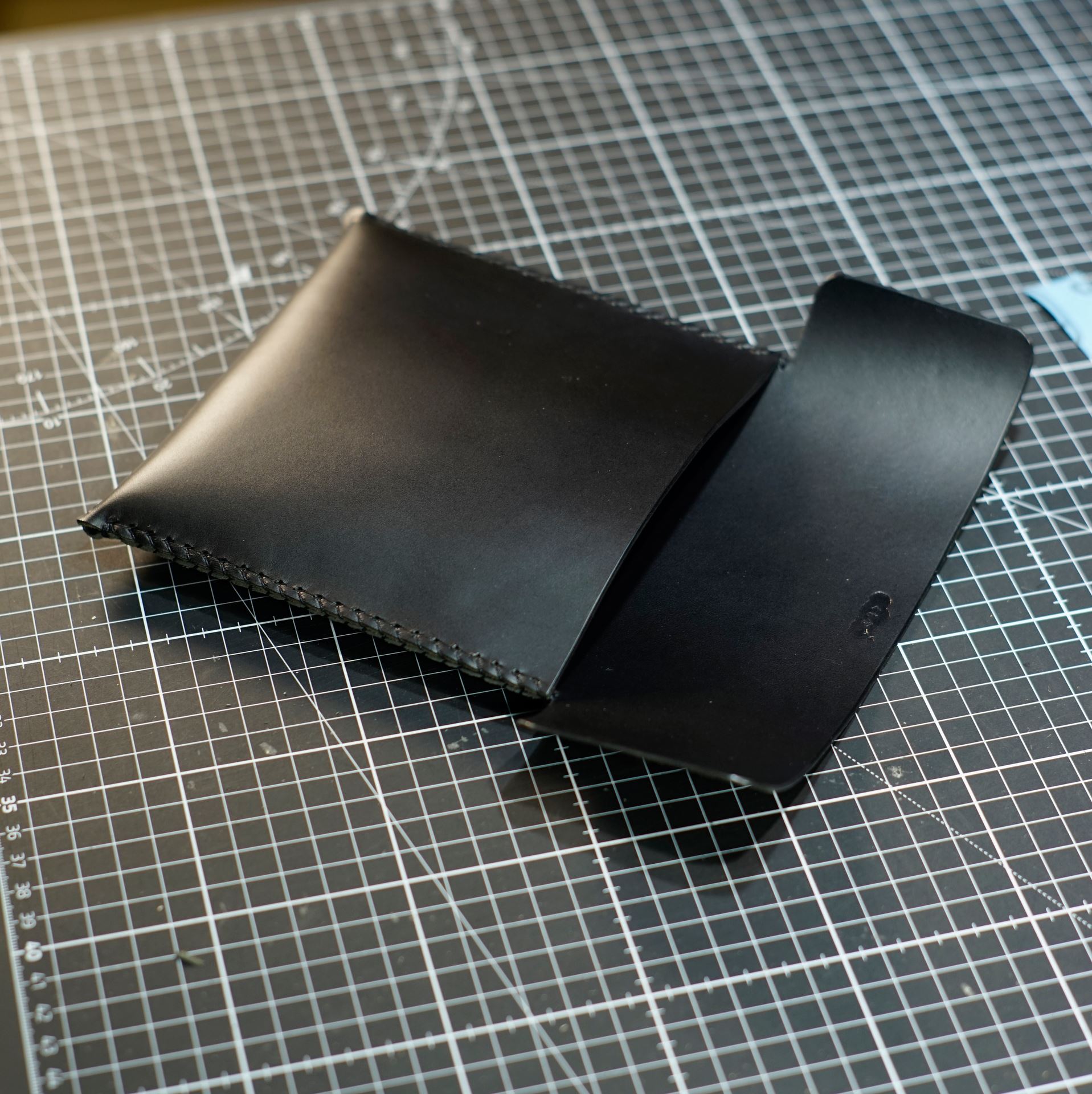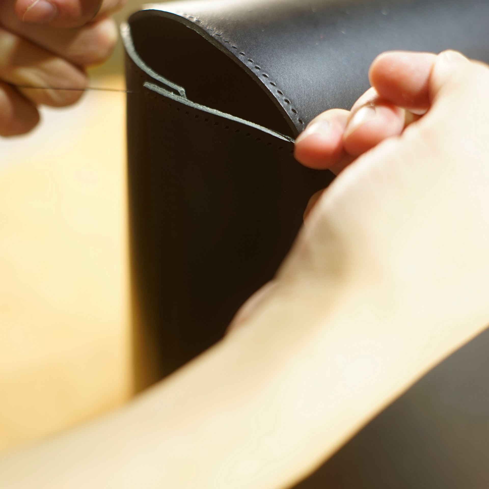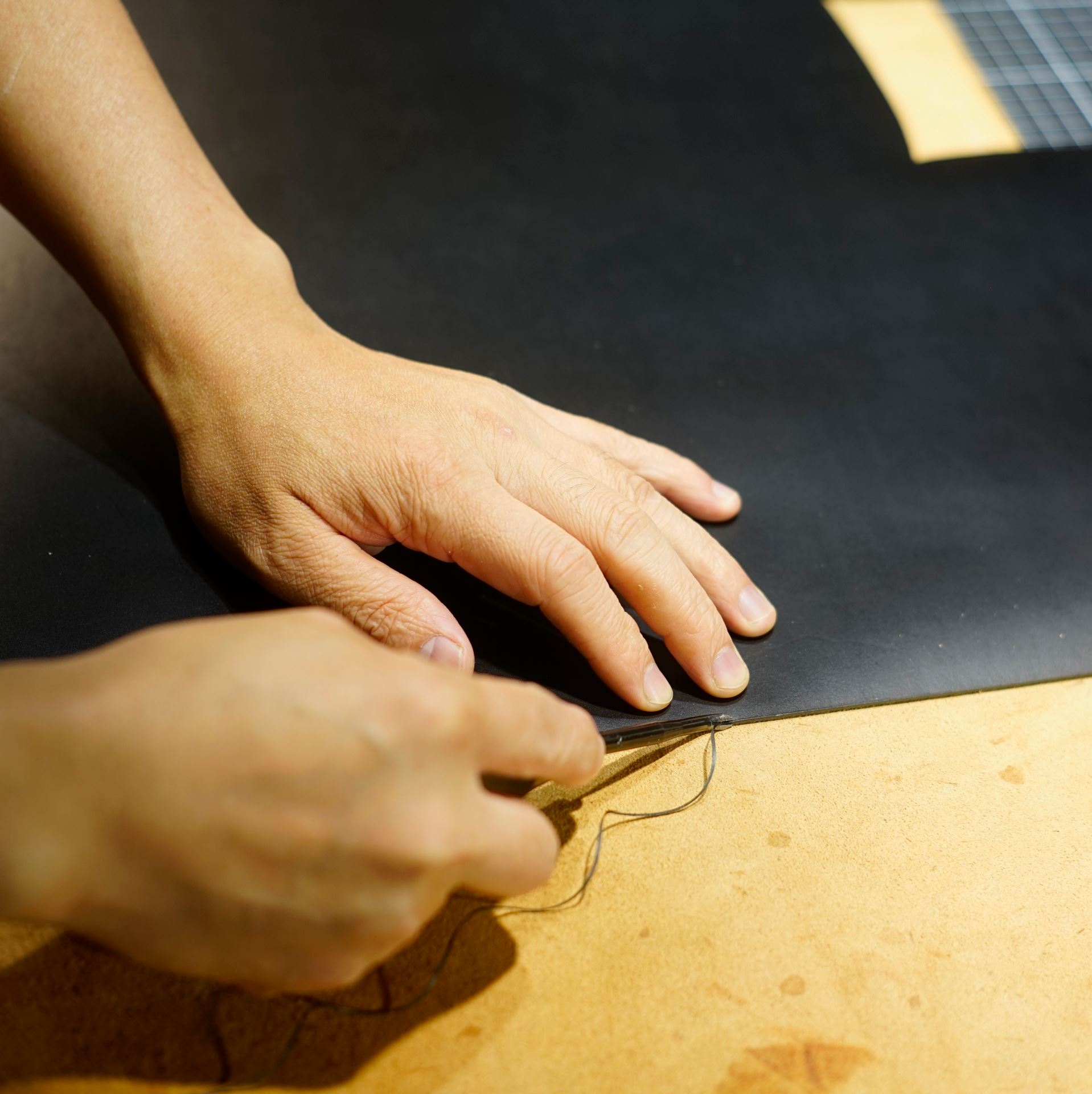 内ポケットの制作です。本体よりも少し薄く漉いた革でシングルポケットとなります。くも舎の刻印を打刻して手縫いで仕上げます。