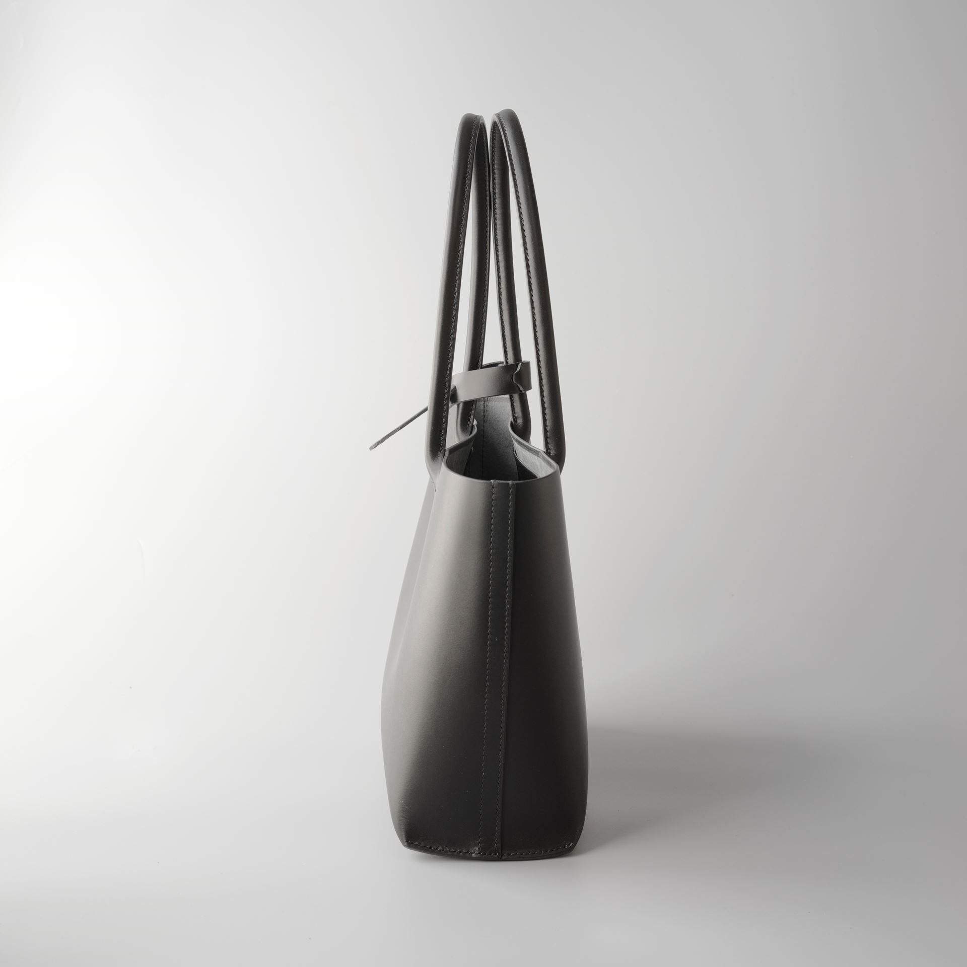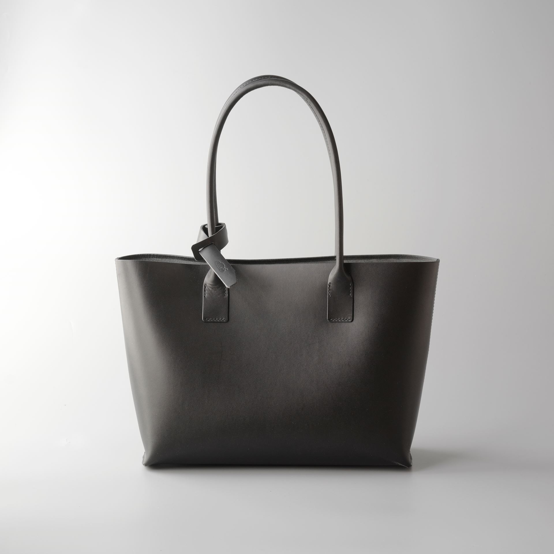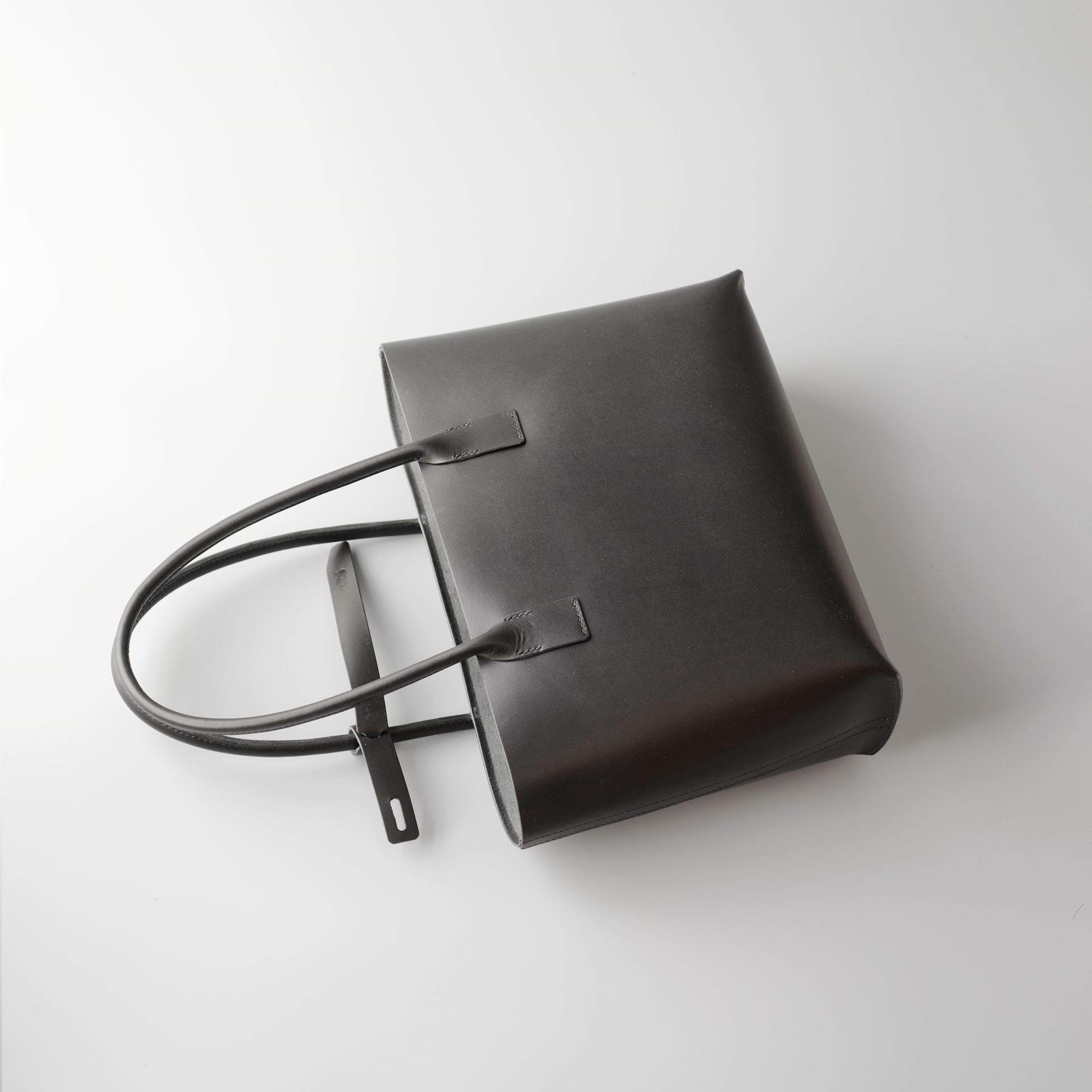 厚手の植物タンニン鞣し革一枚革と麻糸の手縫いでつくった、しっかりと自立するシンプルなトートバッグです。肩にもかけられる長さの持ち手は丸みを帯びた筒状にして手縫いしましたので、手に持った時の指へのアタリがソフトでしっかりした印象を与えてくれます。