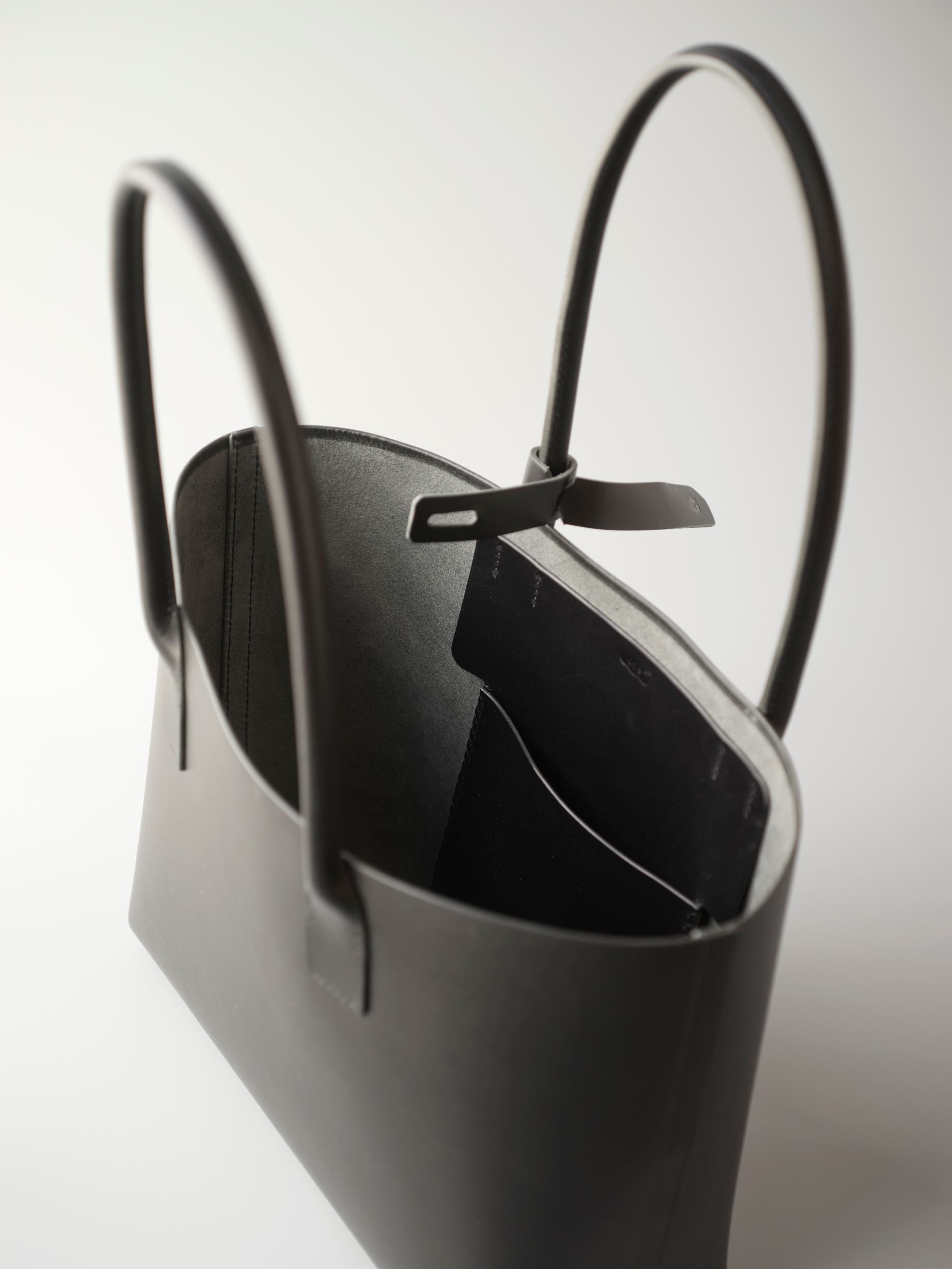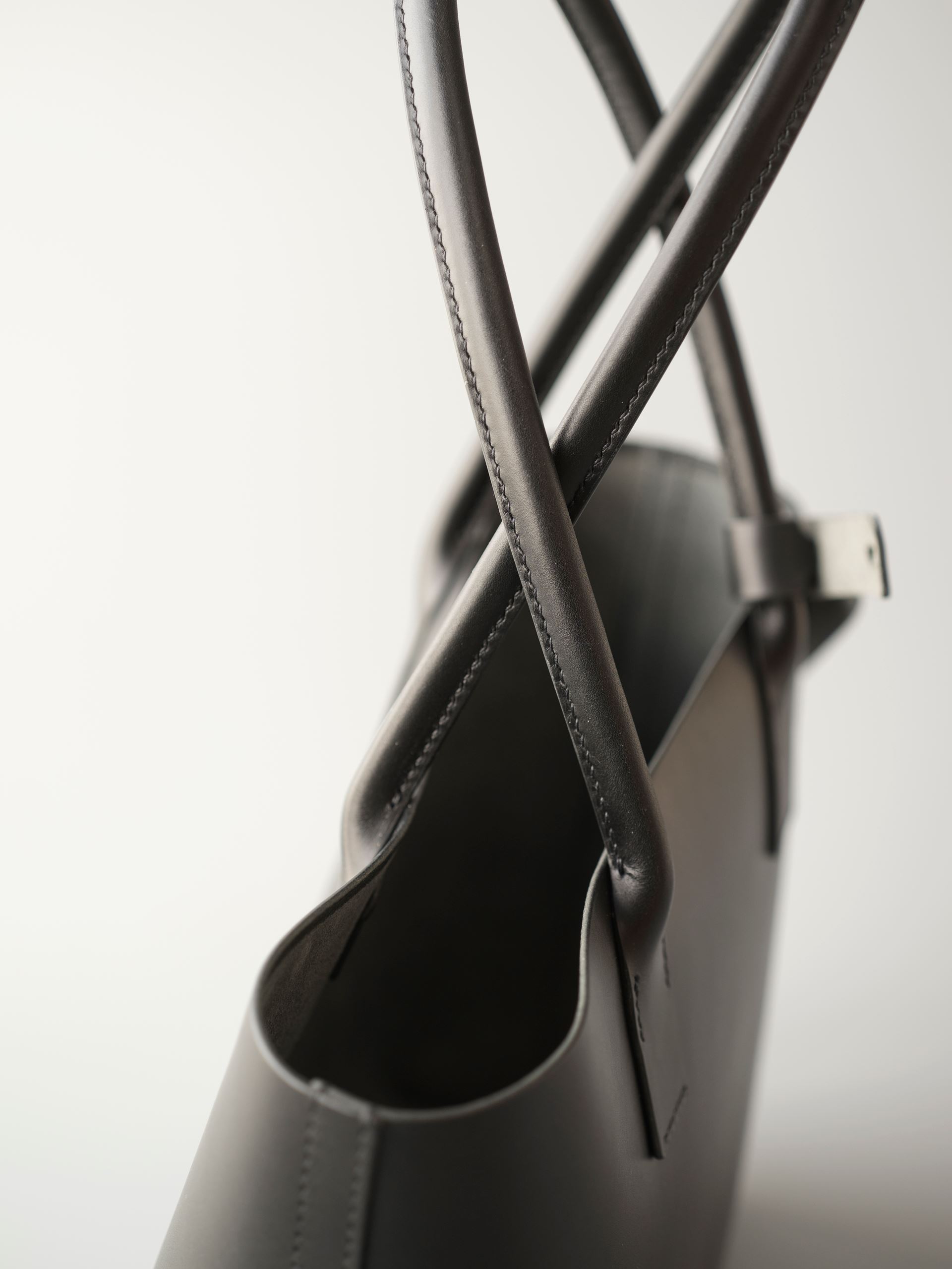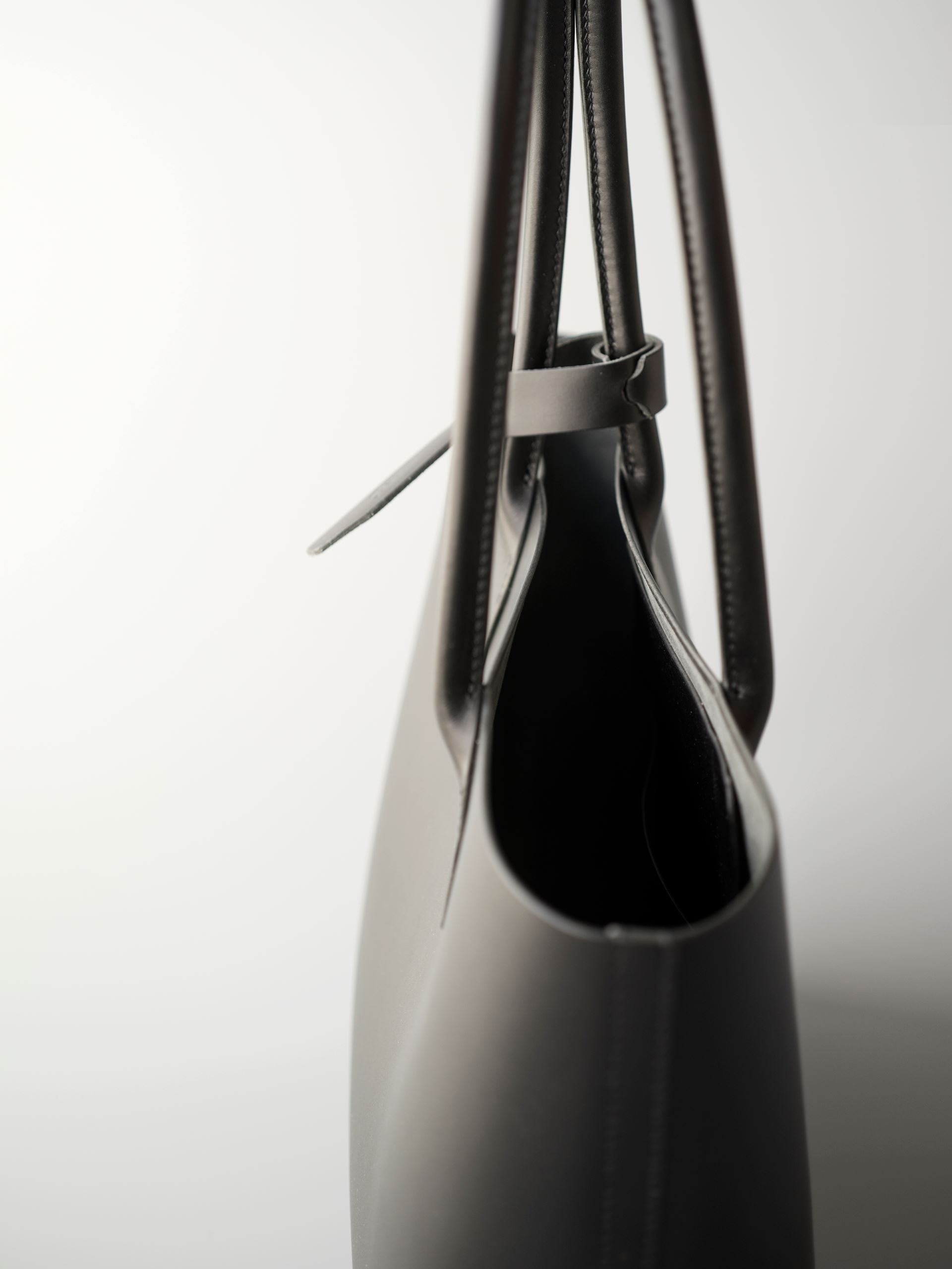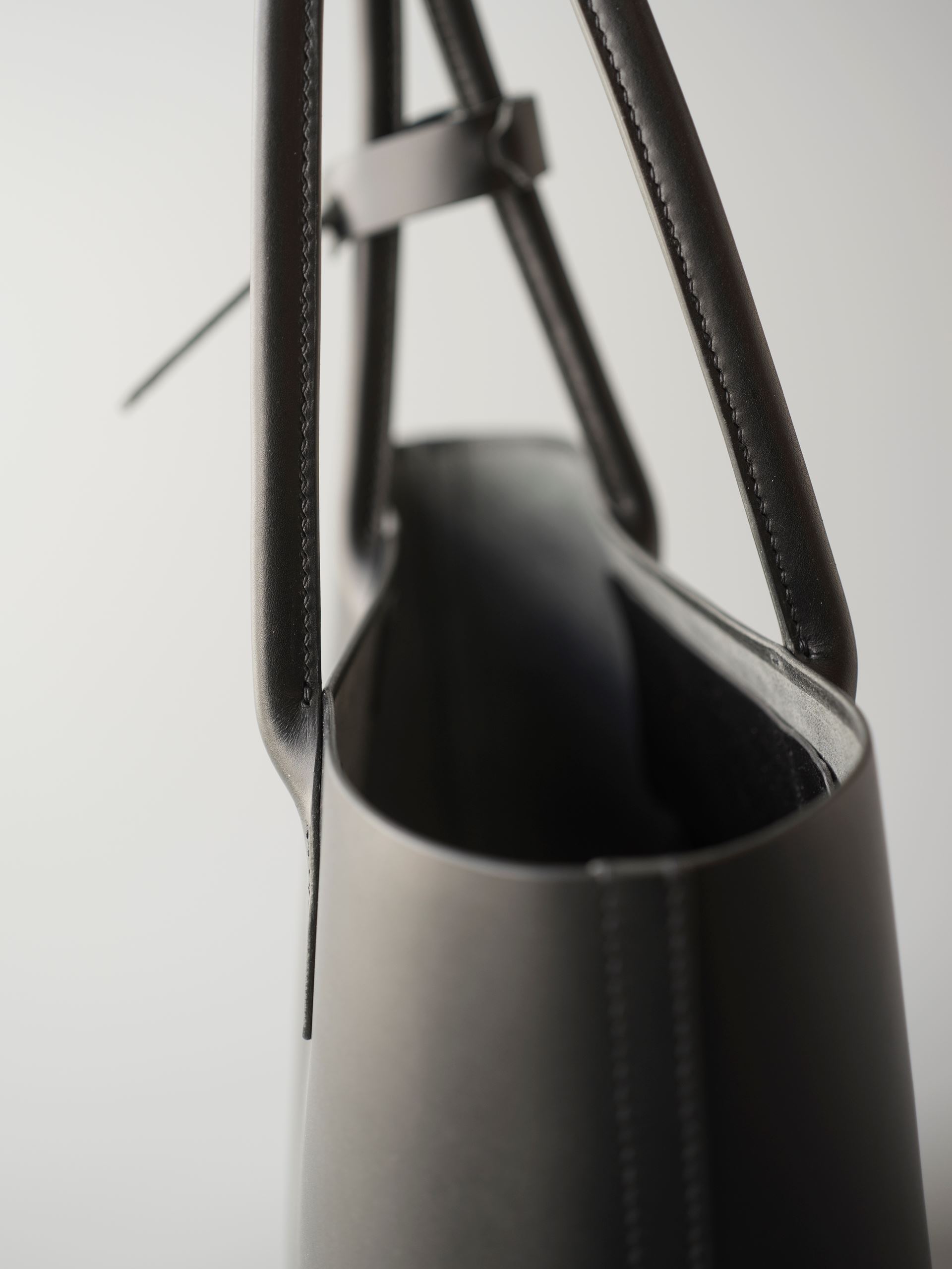 厚手の植物タンニン鞣し革一枚革と麻糸の手縫いでつくった、しっかりと自立するシンプルなトートバッグです。肩にもかけられる長さの持ち手は丸みを帯びた筒状にして手縫いしましたので、手に持った時の指へのアタリがソフトでしっかりした印象を与えてくれます。