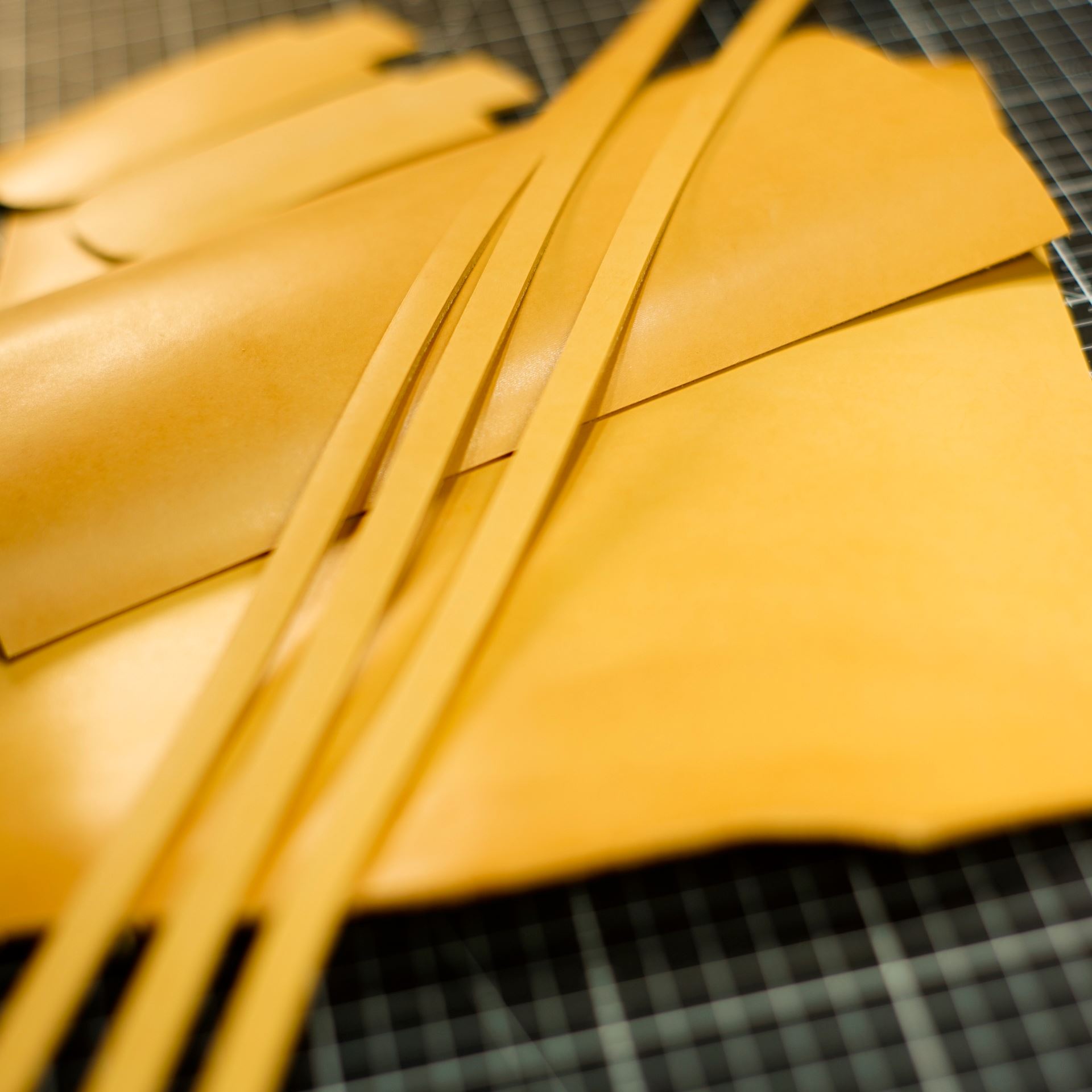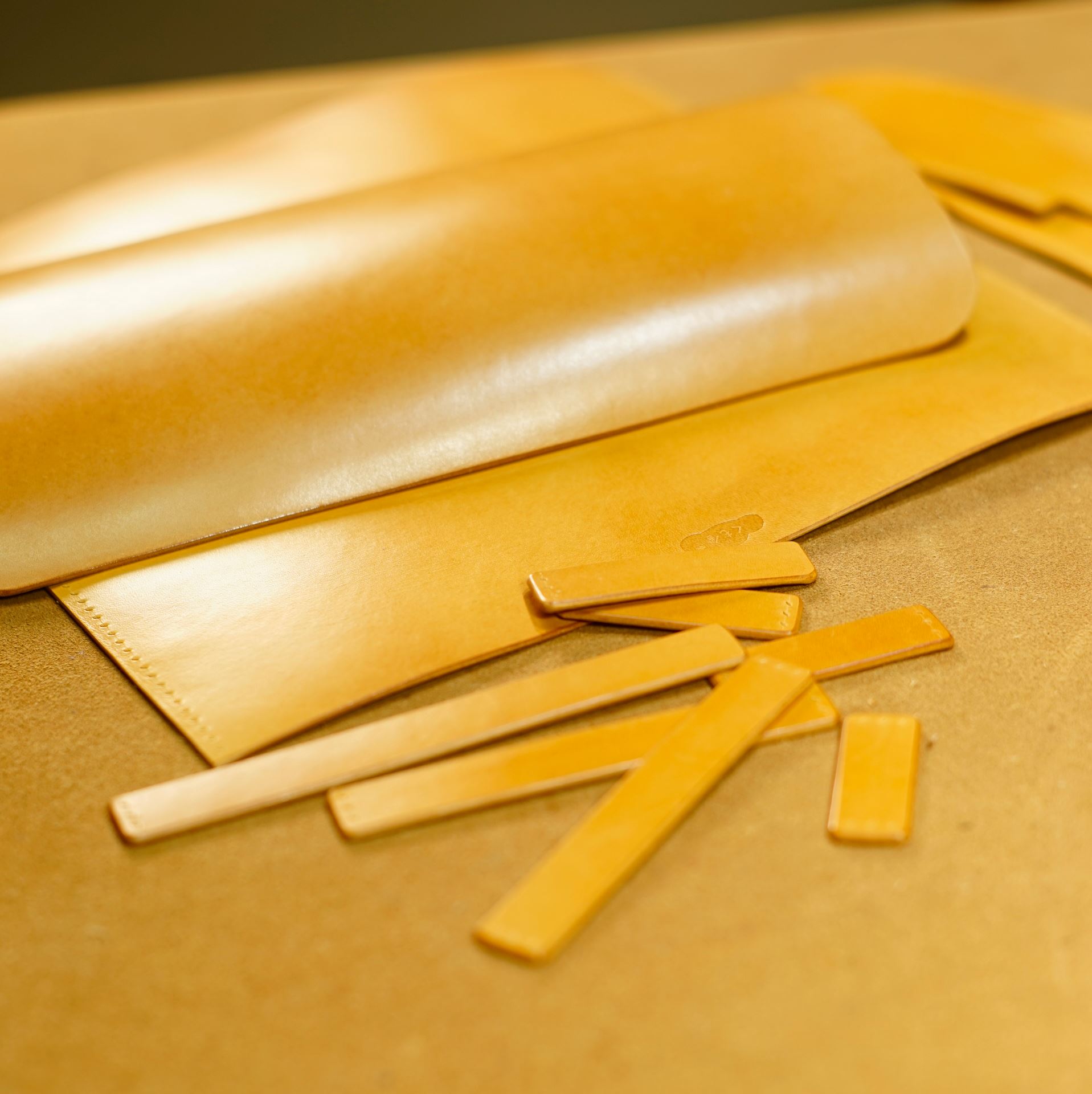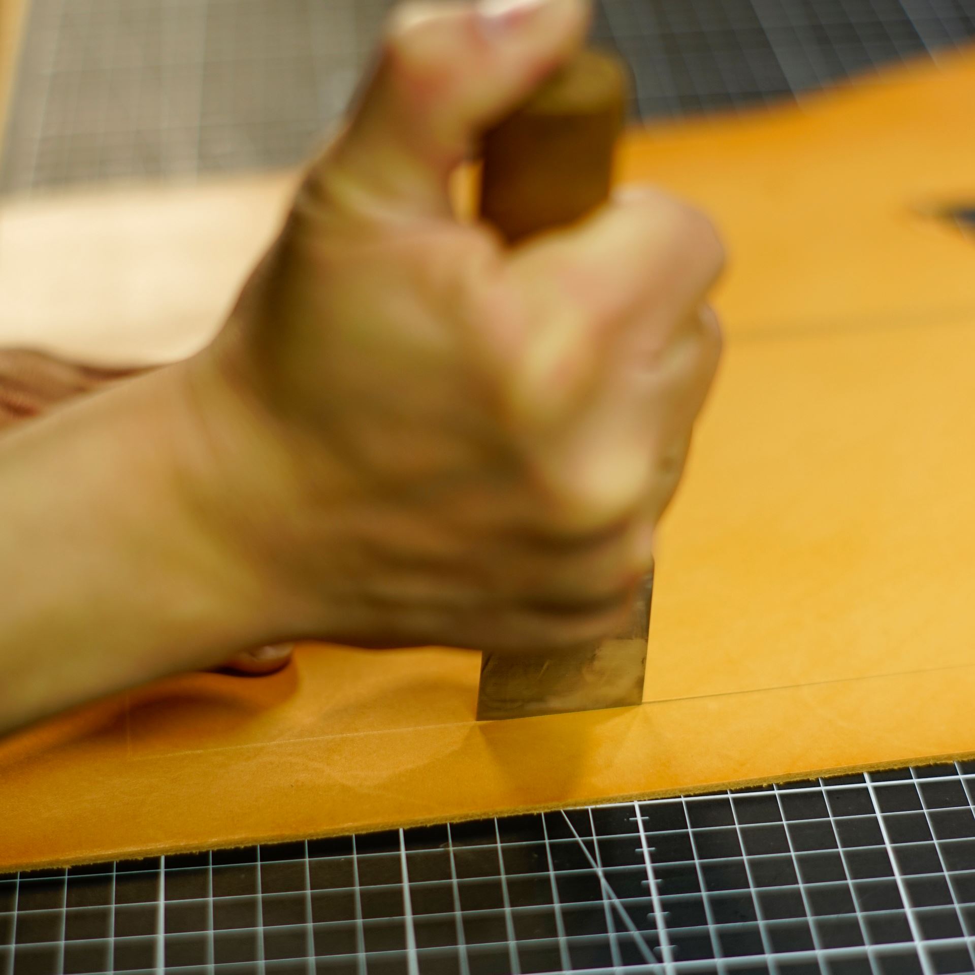 型紙からケガキ線を入れ、革包丁でパーツを切り出します。