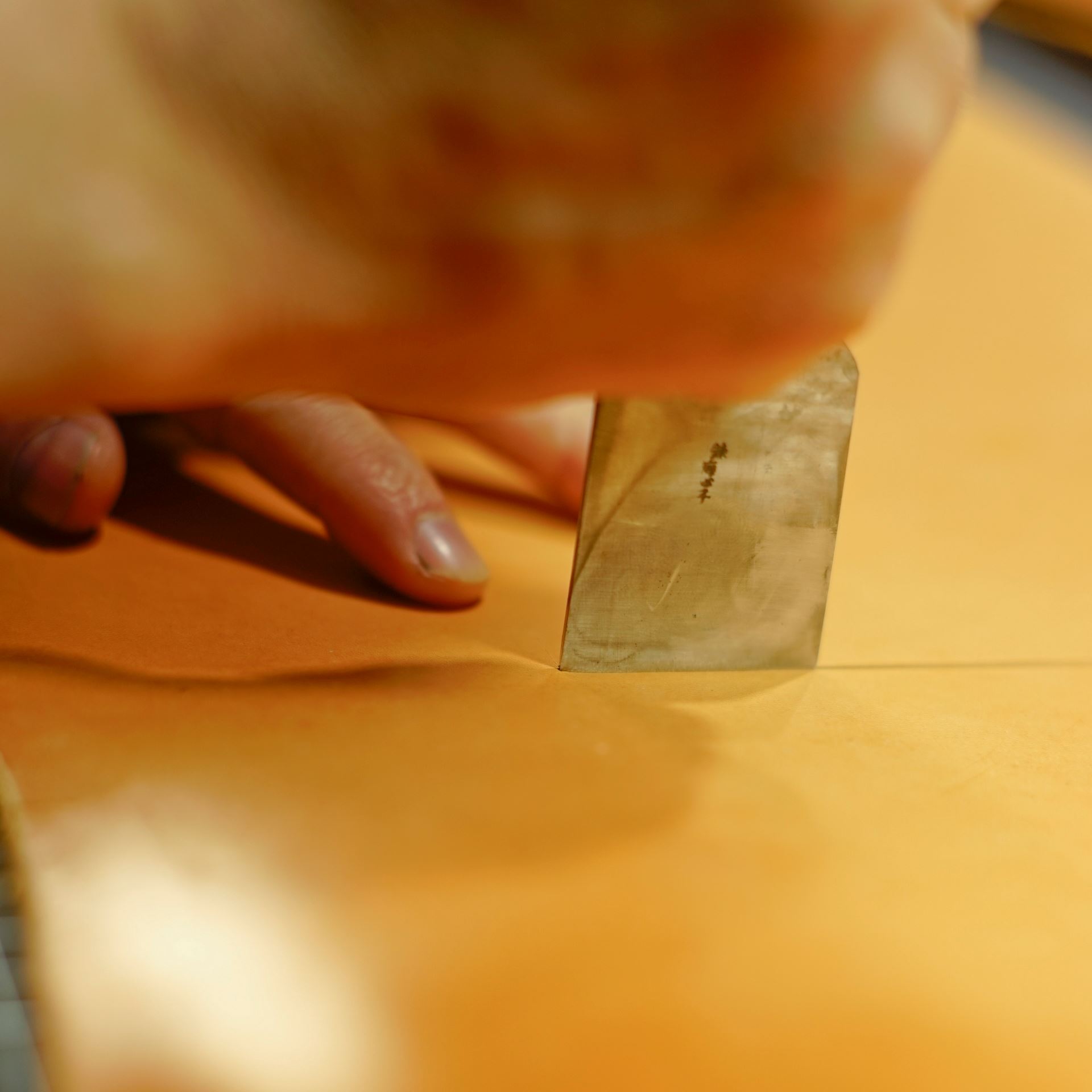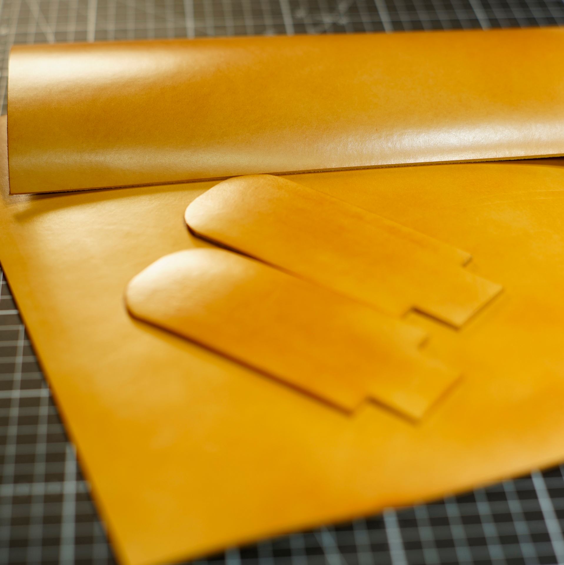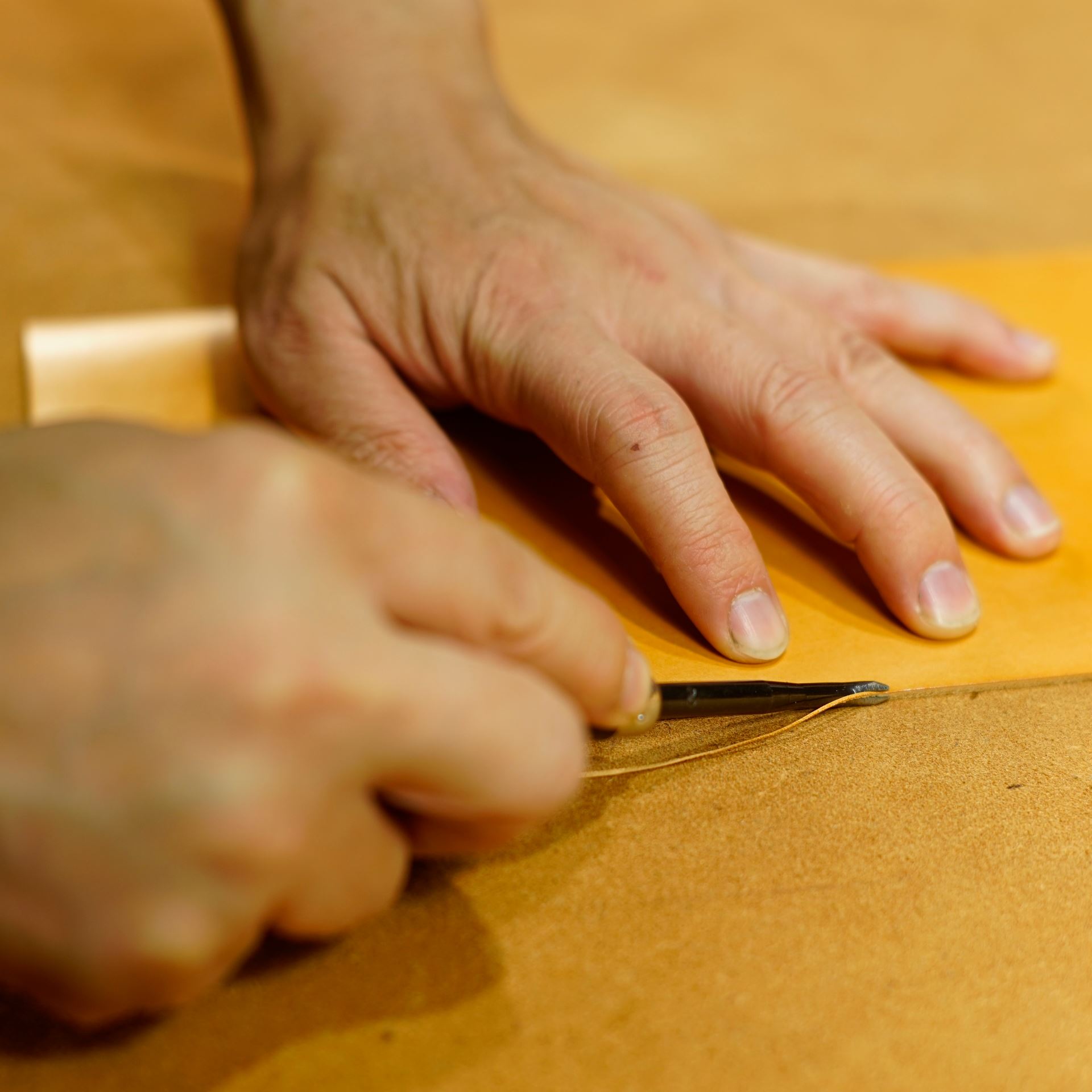 型紙からケガキ線を入れ、革包丁でパーツを切り出します。