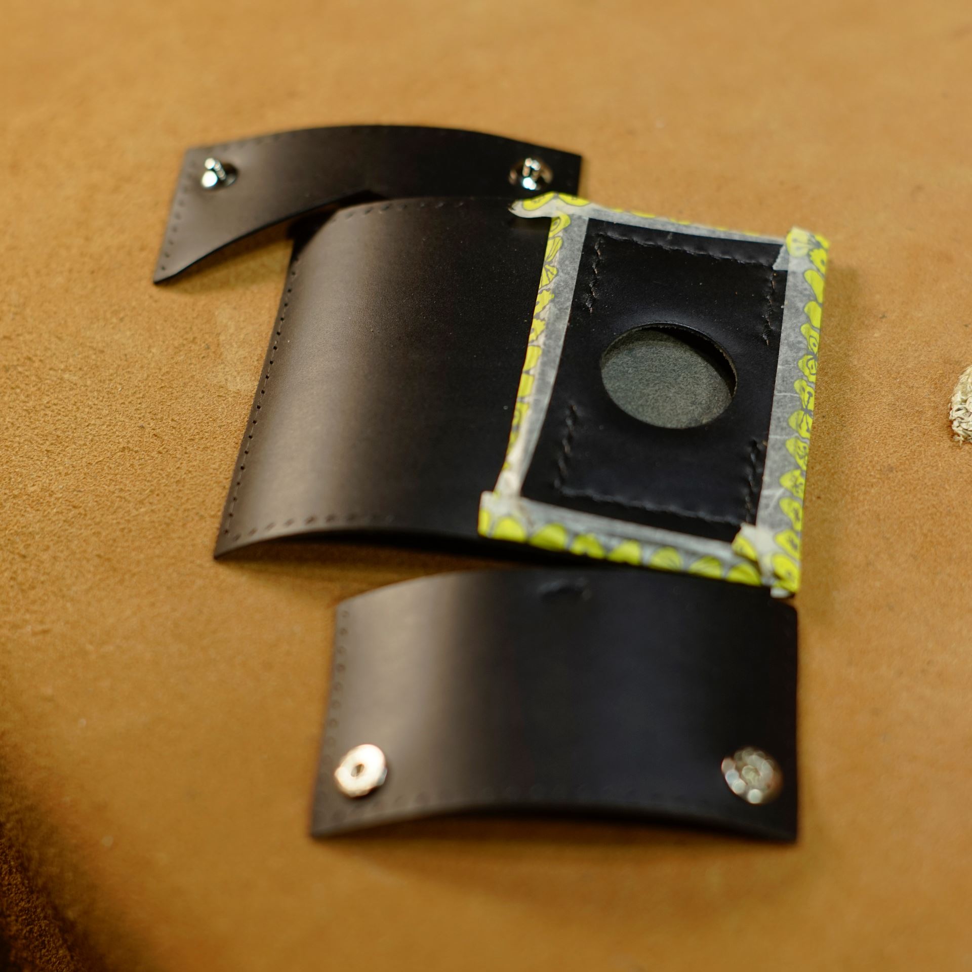 AirTagポケット部分を最初に縫います。位置決めが大事な作業です。ポケットを一体化したらマスキングテープでプラスチックカード部を保護しておきます。Airtagが入るかチェックして問題ありませんでした。