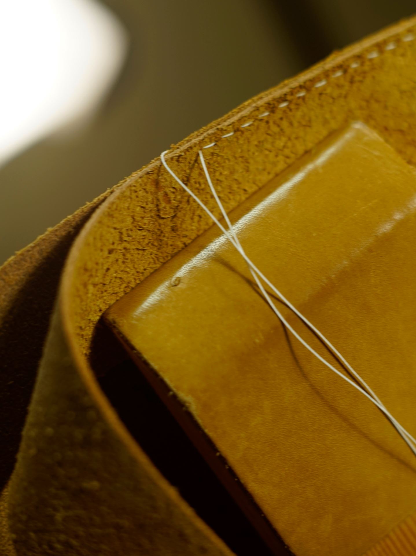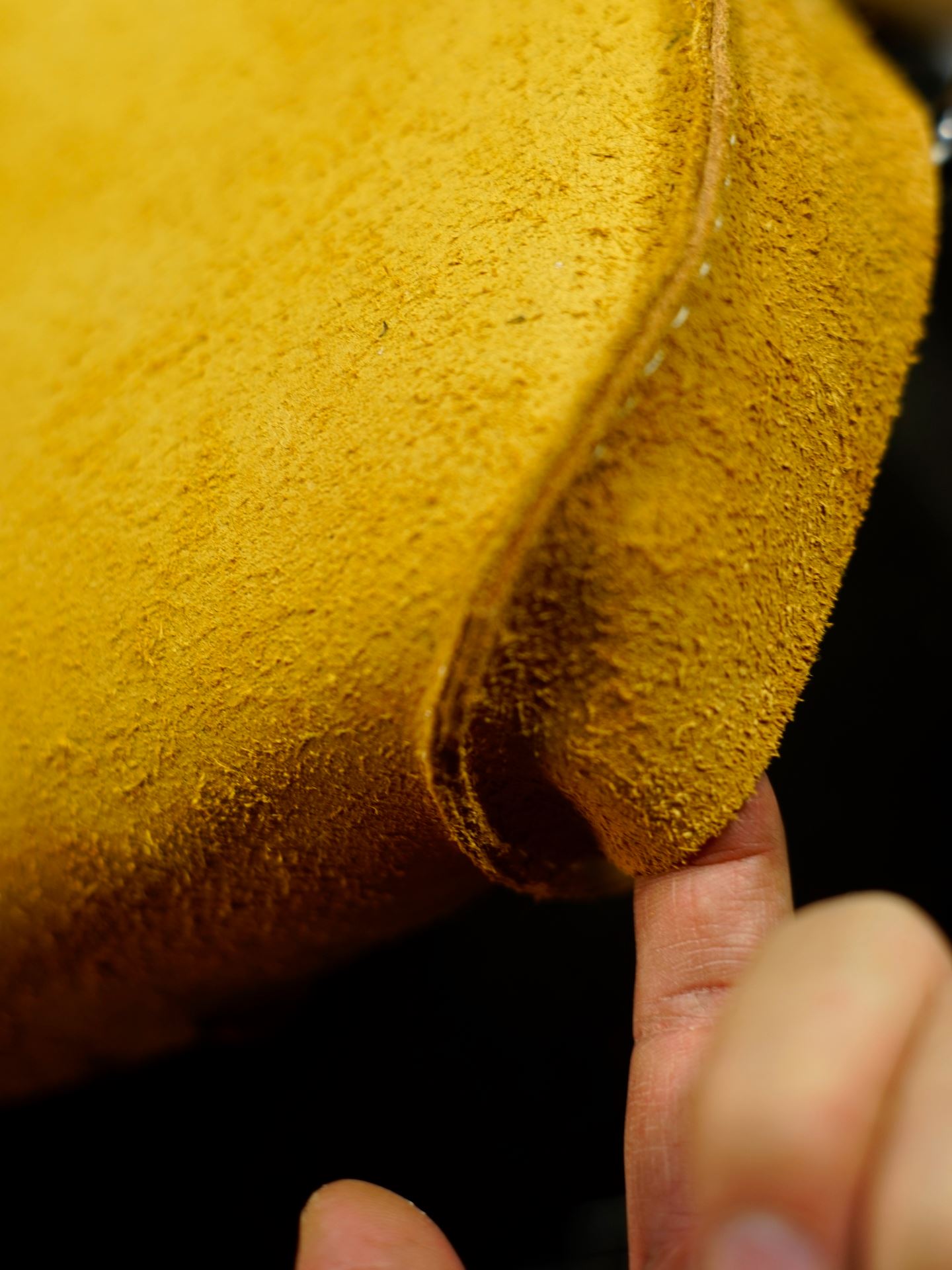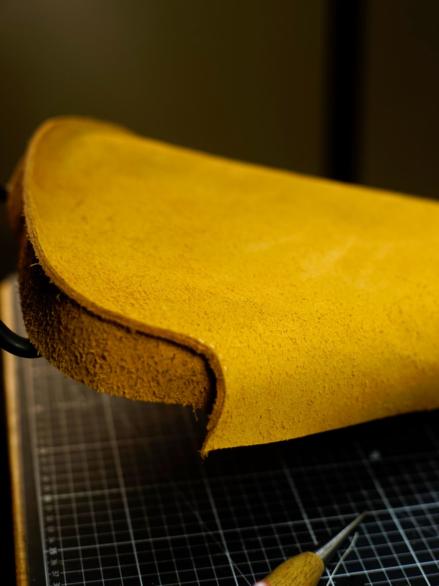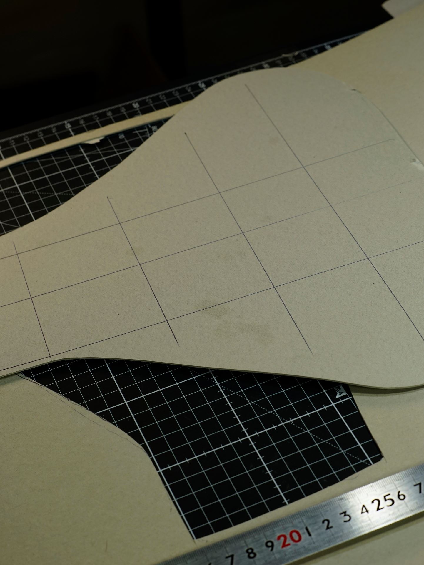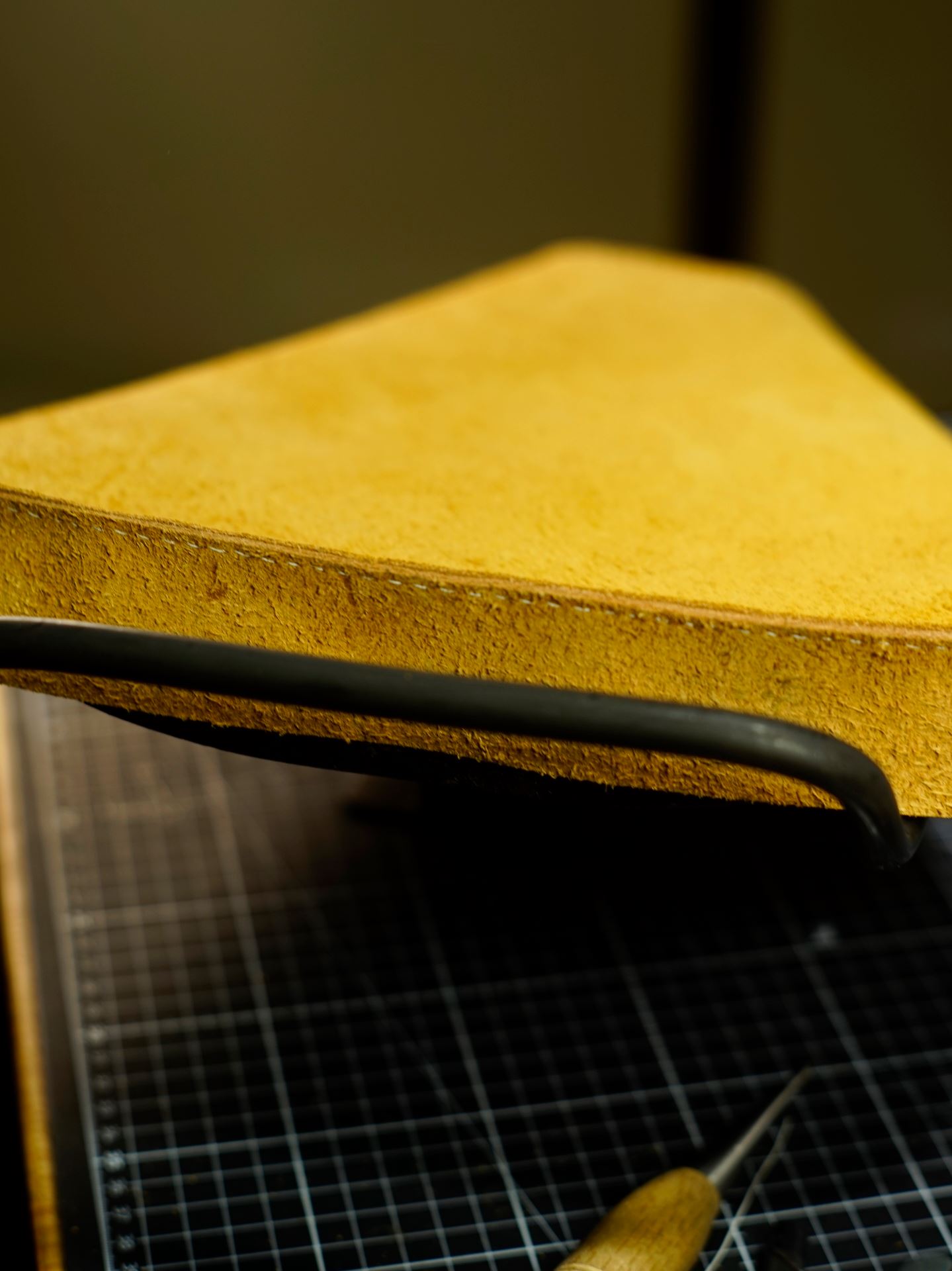 取り外したシートベースから大まかな型紙を作り、そこから立体的な展開図を作って床革で試作します。最終的にはクローム鞣しのフレンチシボ革で上品に仕上げたいと思いますが、大まかな仕上がりを確認するためには外縫いでかぶせてみるのが早くて良いです。