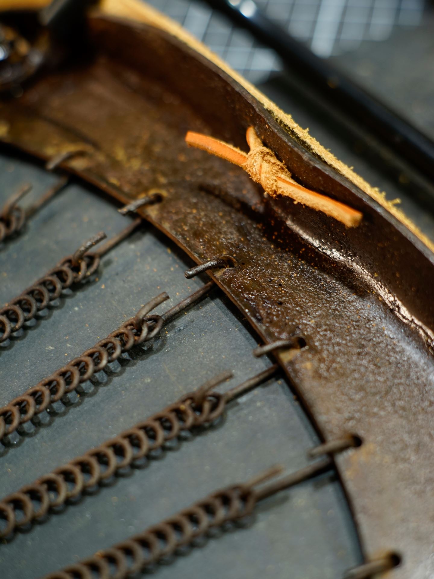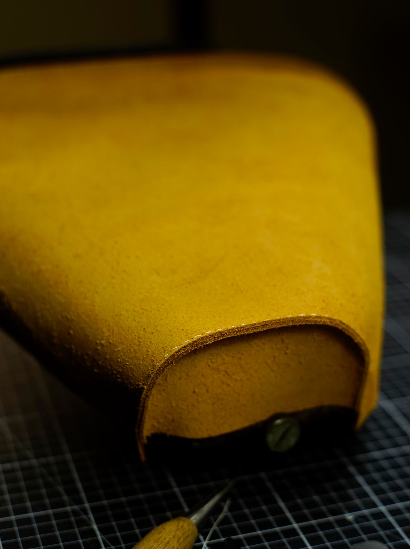 本来であればシート固定のクリップや板金を曲げてサドルに固定するんですが、サイズ感の確認程度なので革ひもで張りを出して確認します。後ろ側がすこし弛みがあるようなので、型紙を修正します。