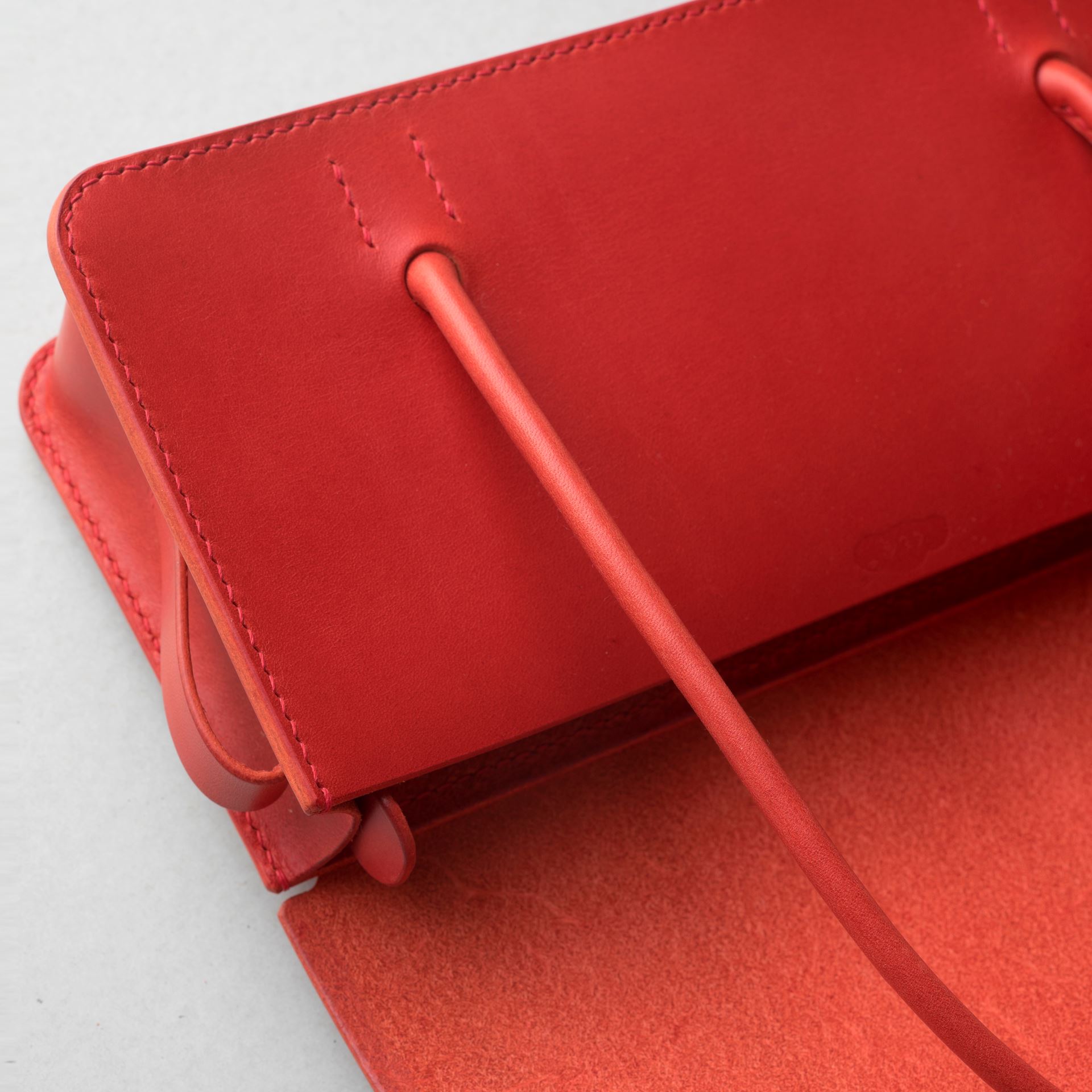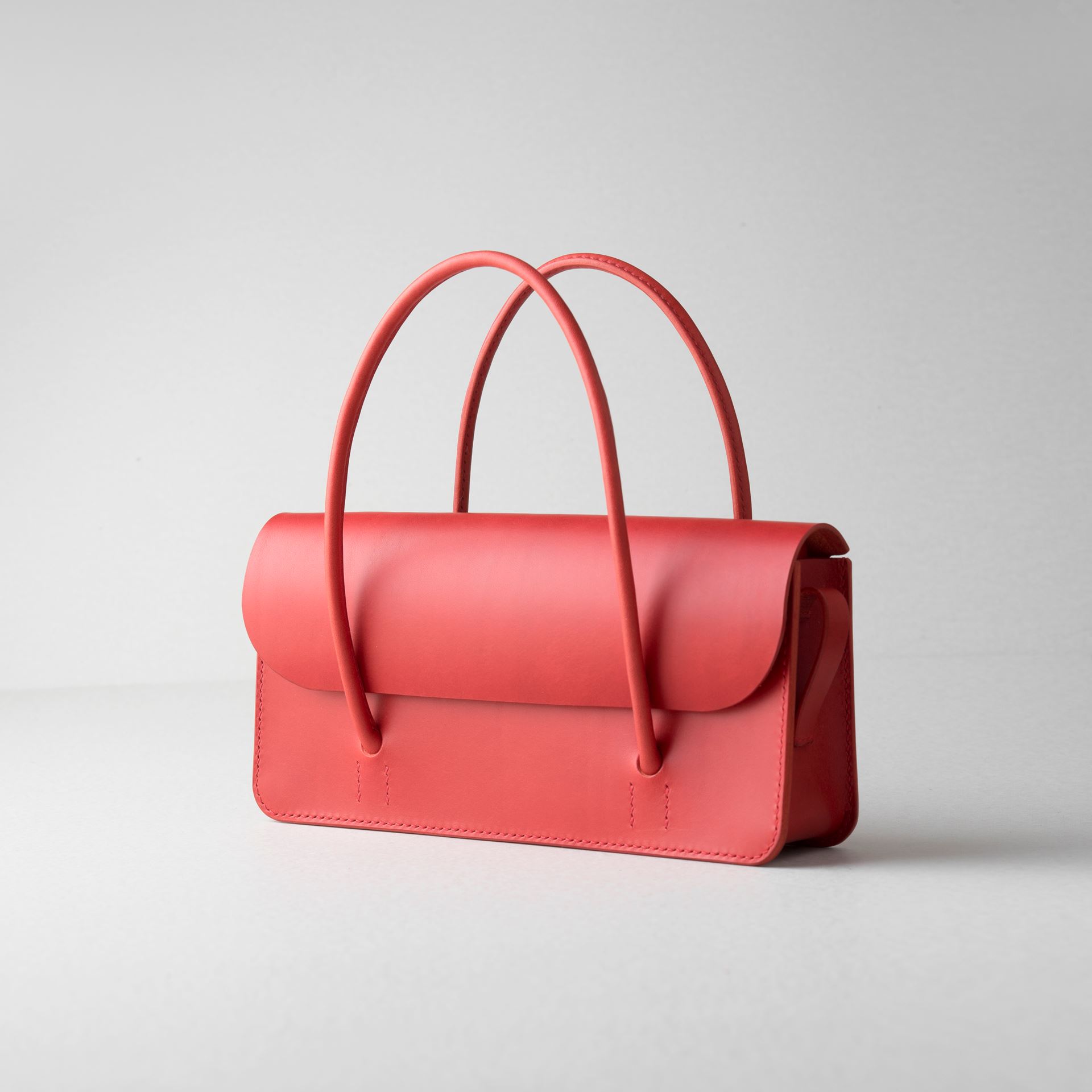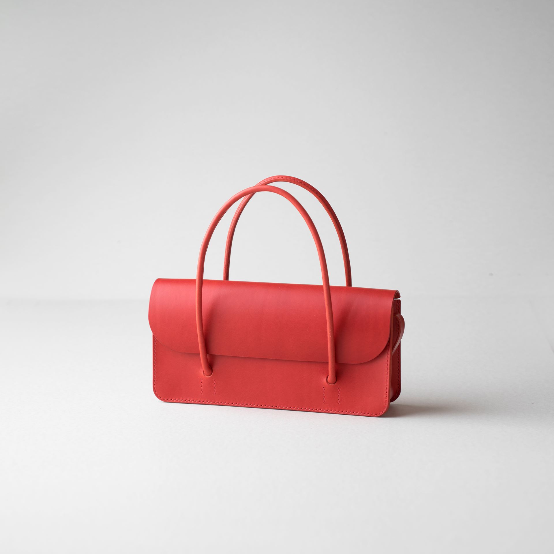 厚手の植物タンニン鞣し革と麻糸の手縫いでつくった、横長の小さな手さげカバンです。サイズは一般的な長財布や文庫本、携帯電話などが入る大きさです。
