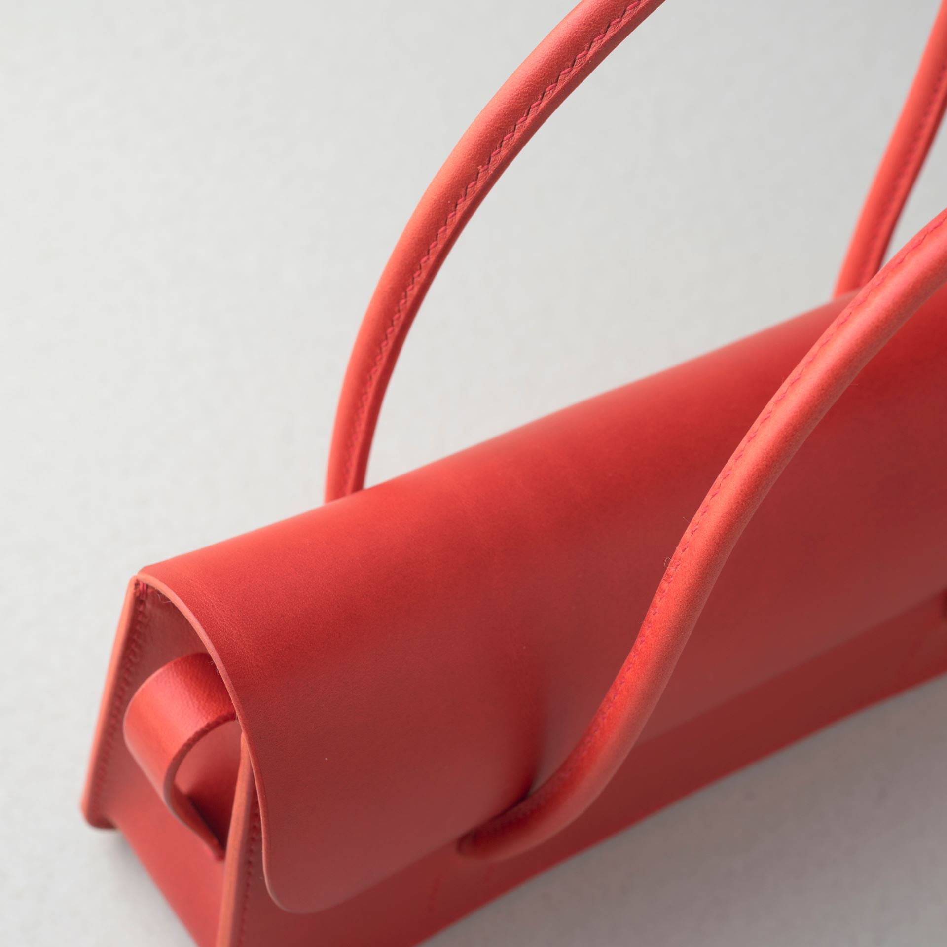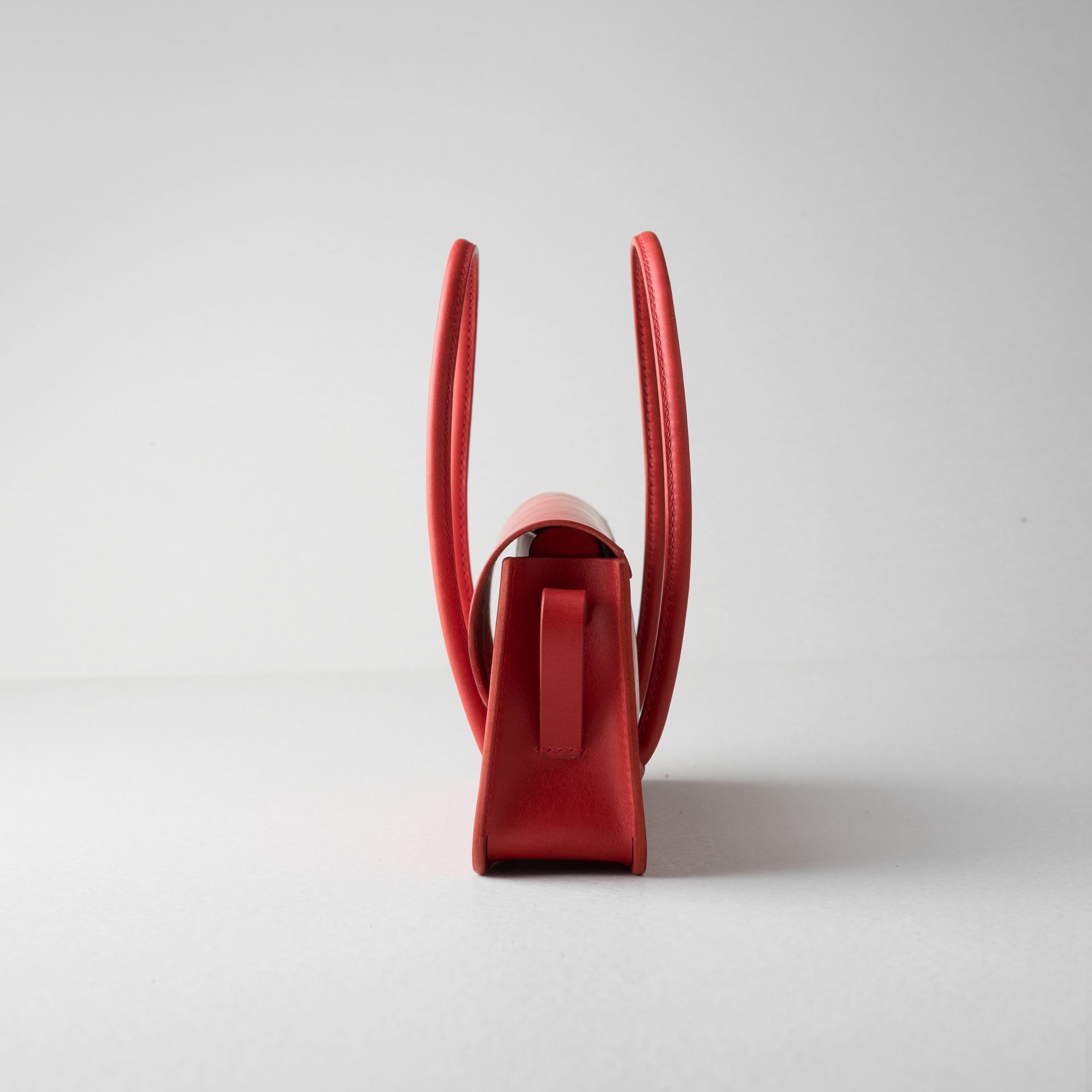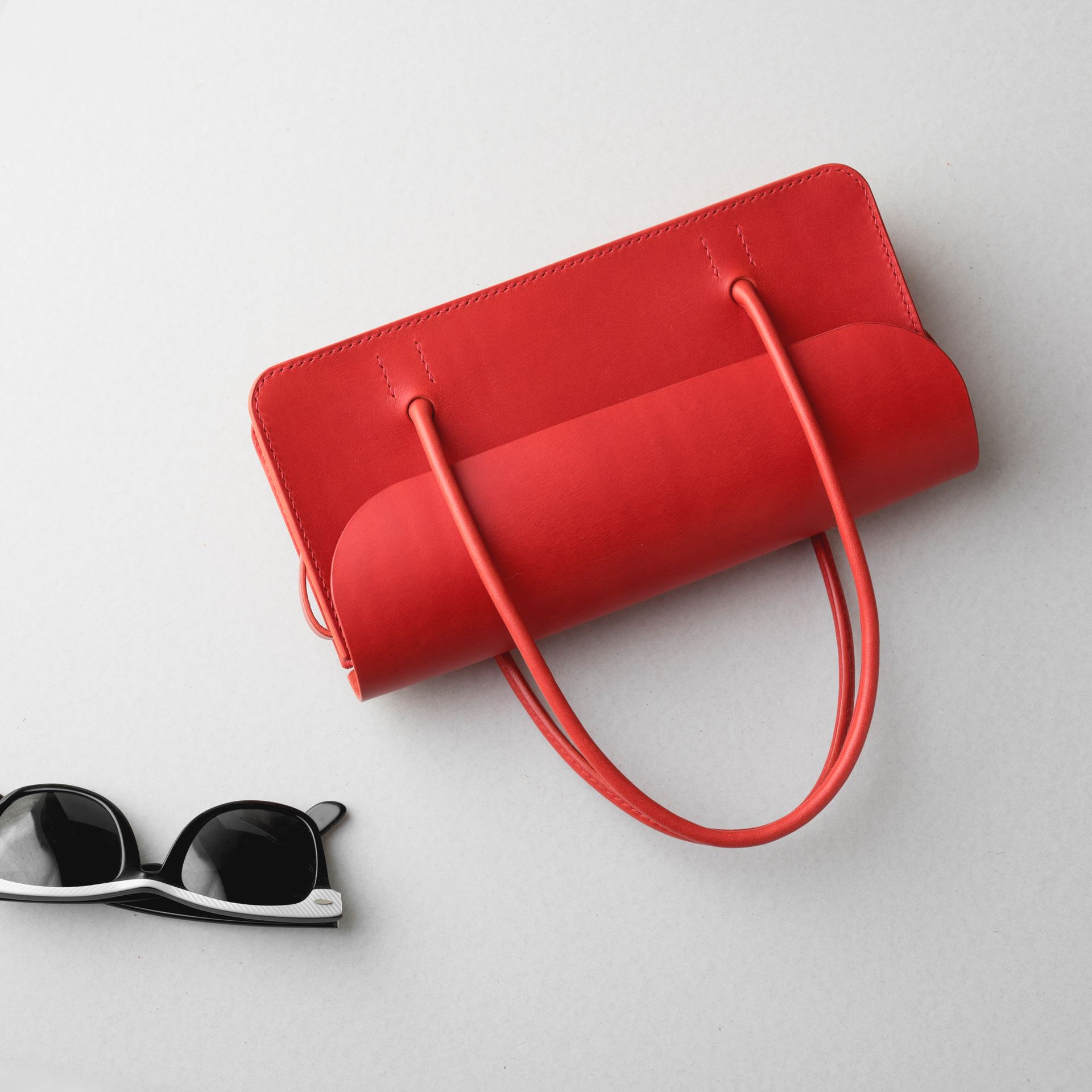 厚手の植物タンニン鞣し革と麻糸の手縫いでつくった、横長の小さな手さげカバンです。サイズは一般的な長財布や文庫本、携帯電話などが入る大きさです。