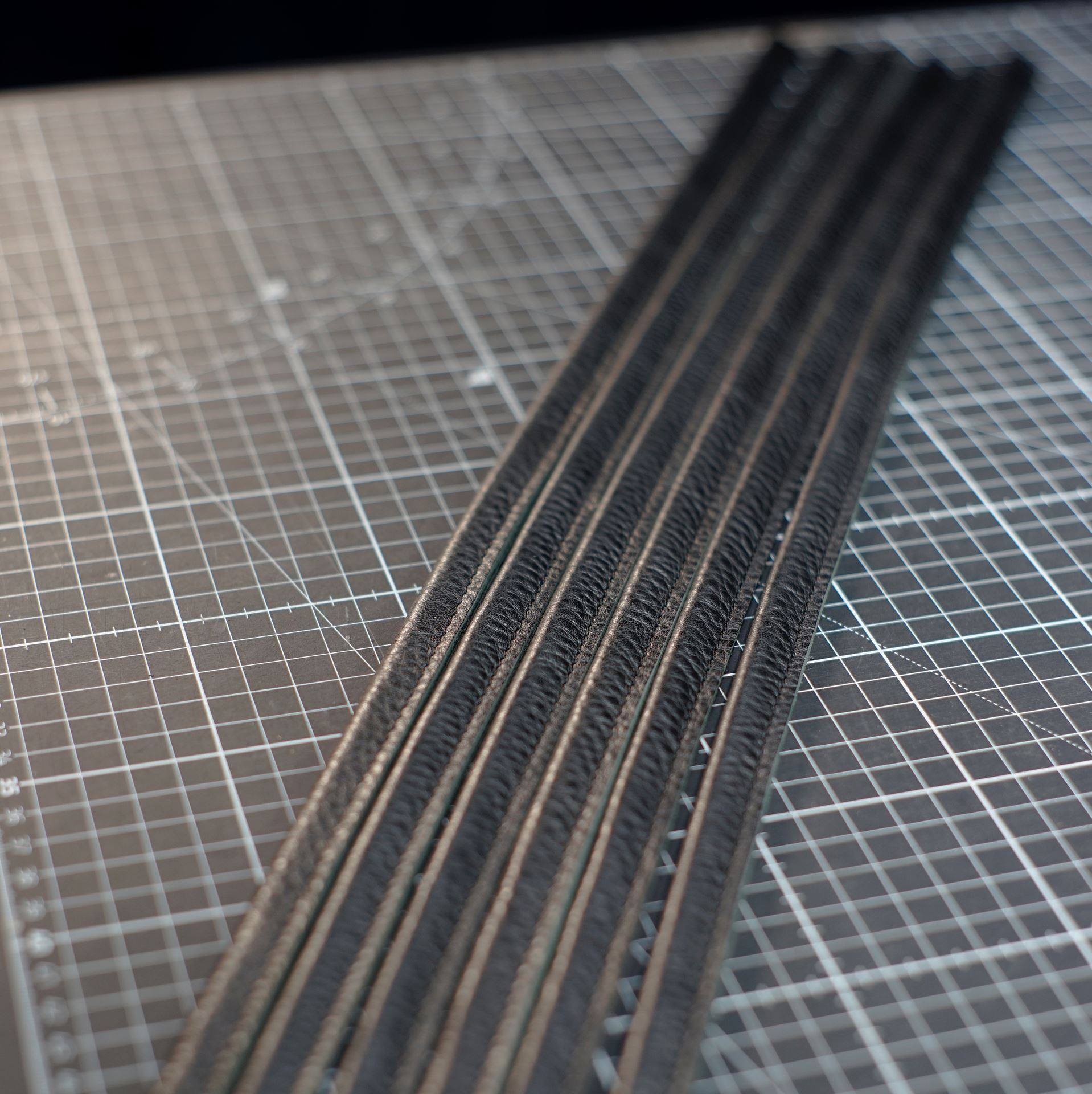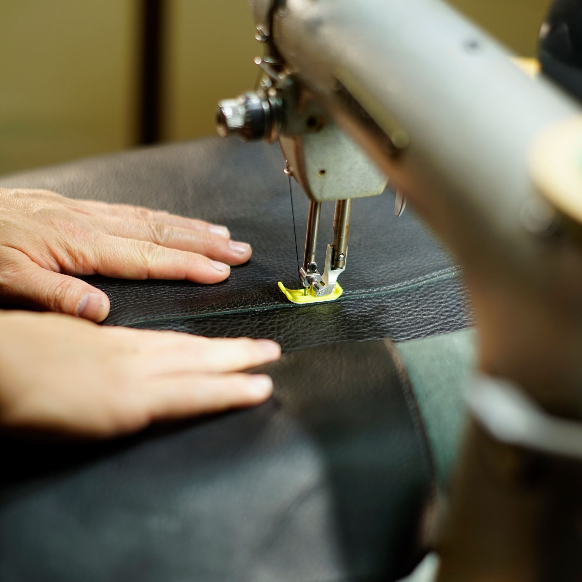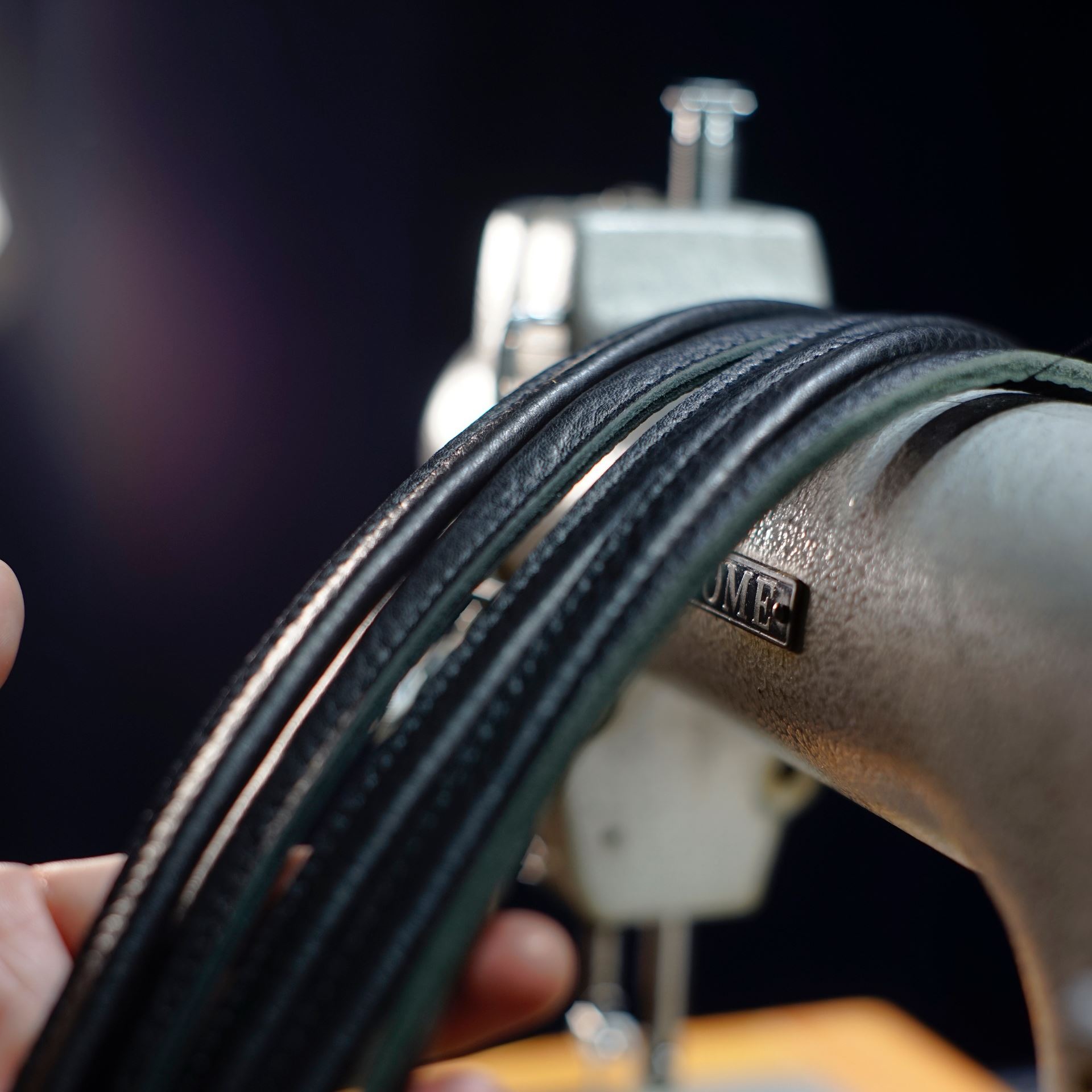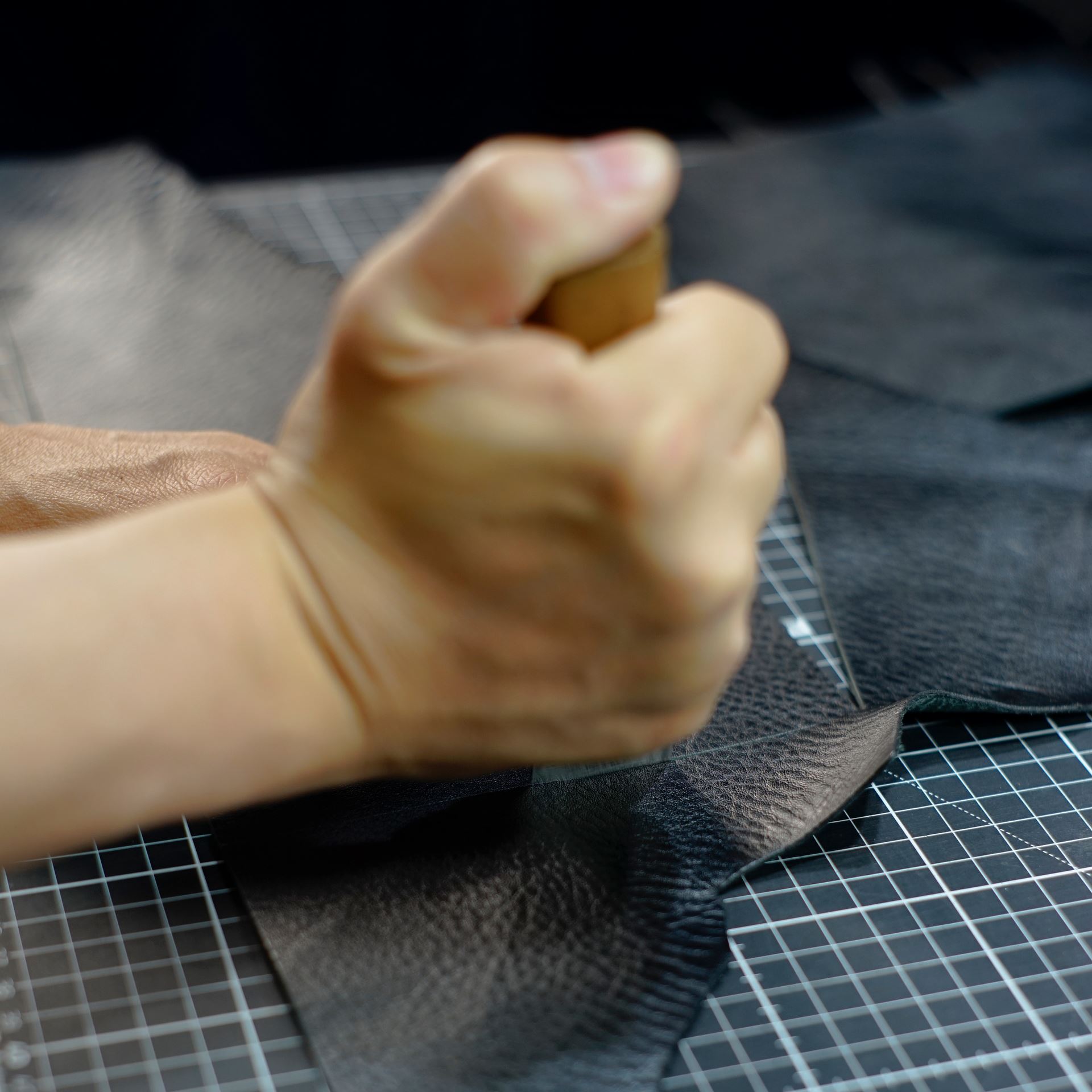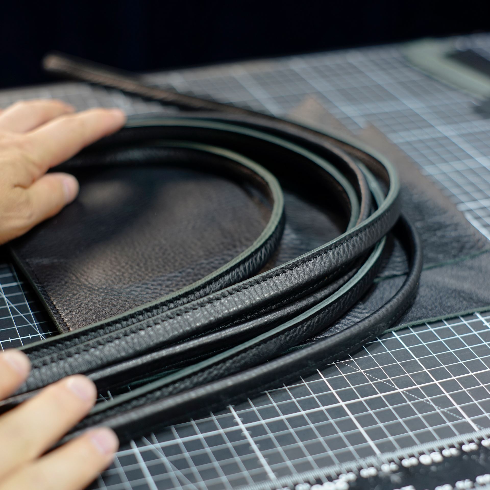 モチモチした黒いシボ革をカットして持手やカバン本体、内ポケットなどのパーツを作っていきます。2つのトートバッグ業務型のご依頼がありますので一気に2つ分、4本の持ち手を制作します。業務型は一部分を除いて古いジャノメのミシンで縫っております。
