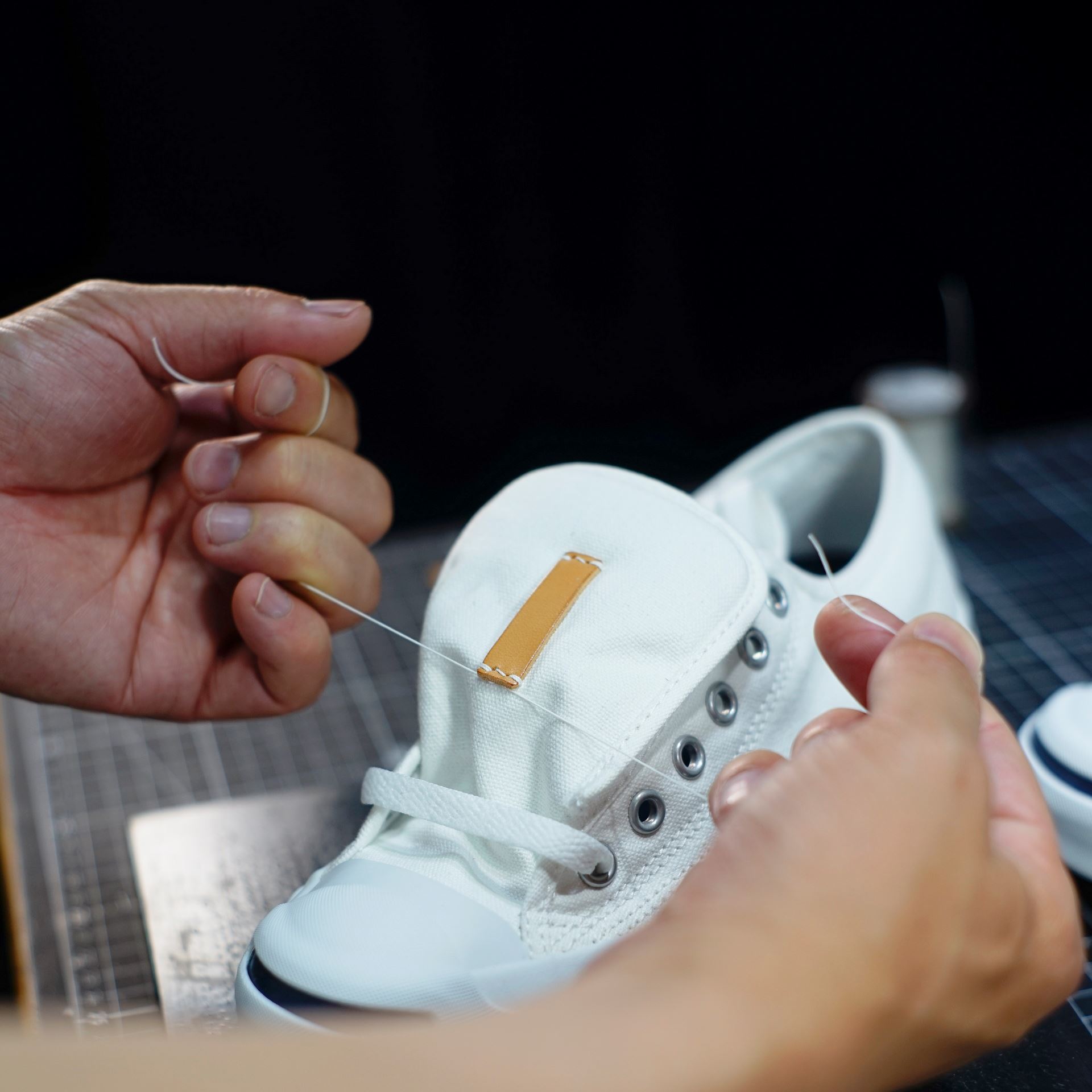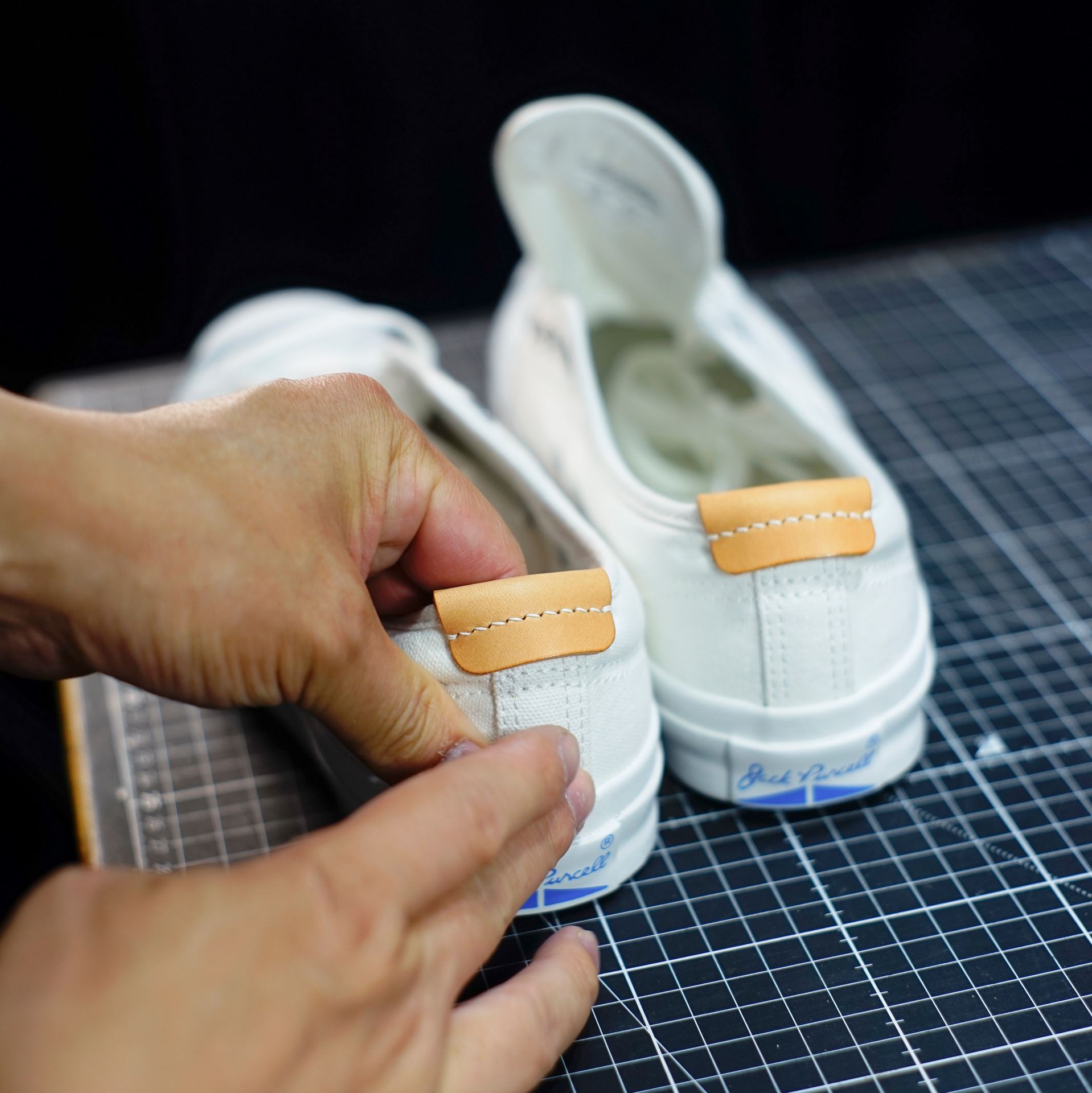 ベロに付けるベルトループを縫い付けて、かかとパーツを縫い上げれば完成となります。仕様糸は六花リネン糸の白になります。すべて手縫いで縫い付けます。