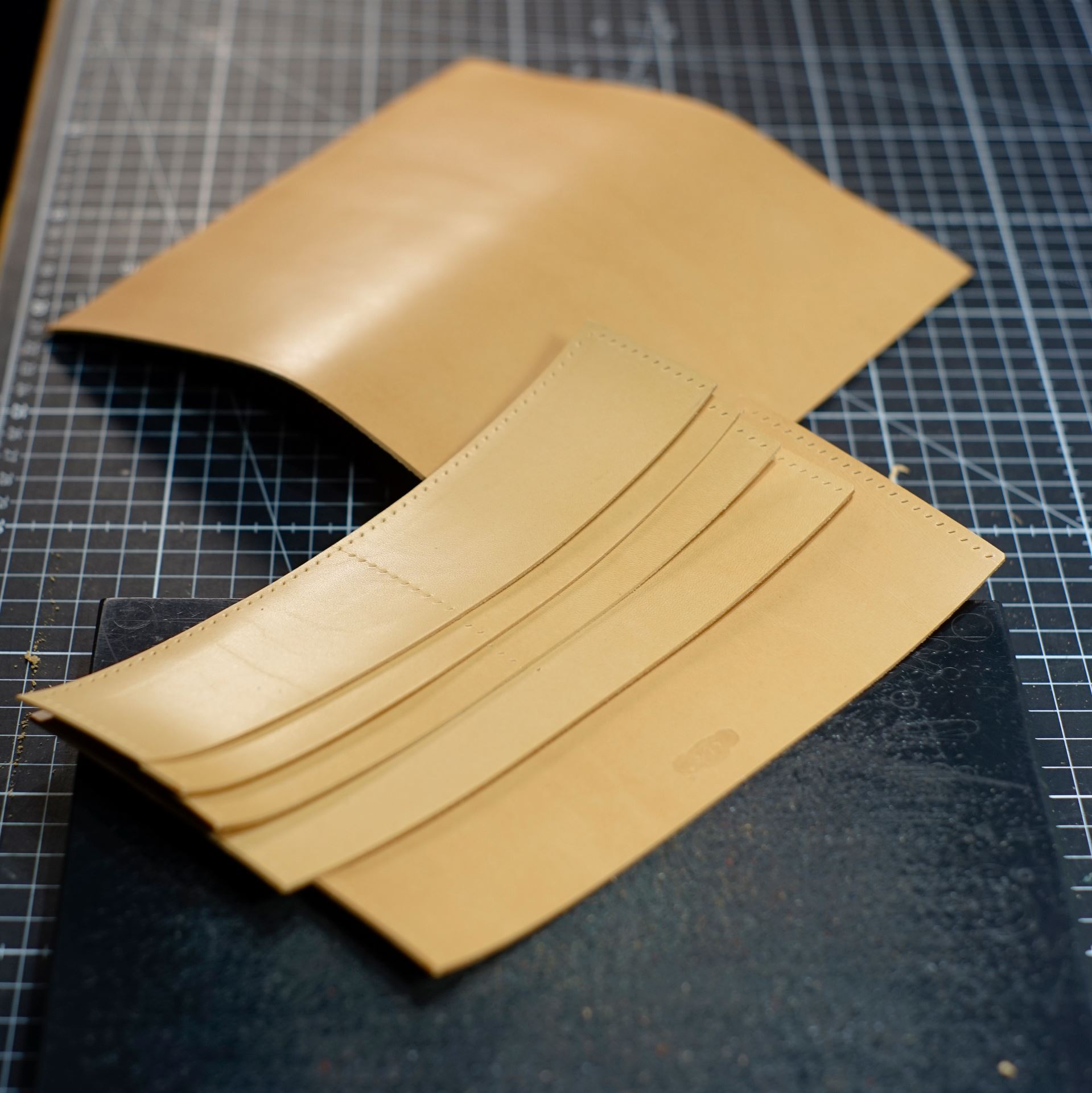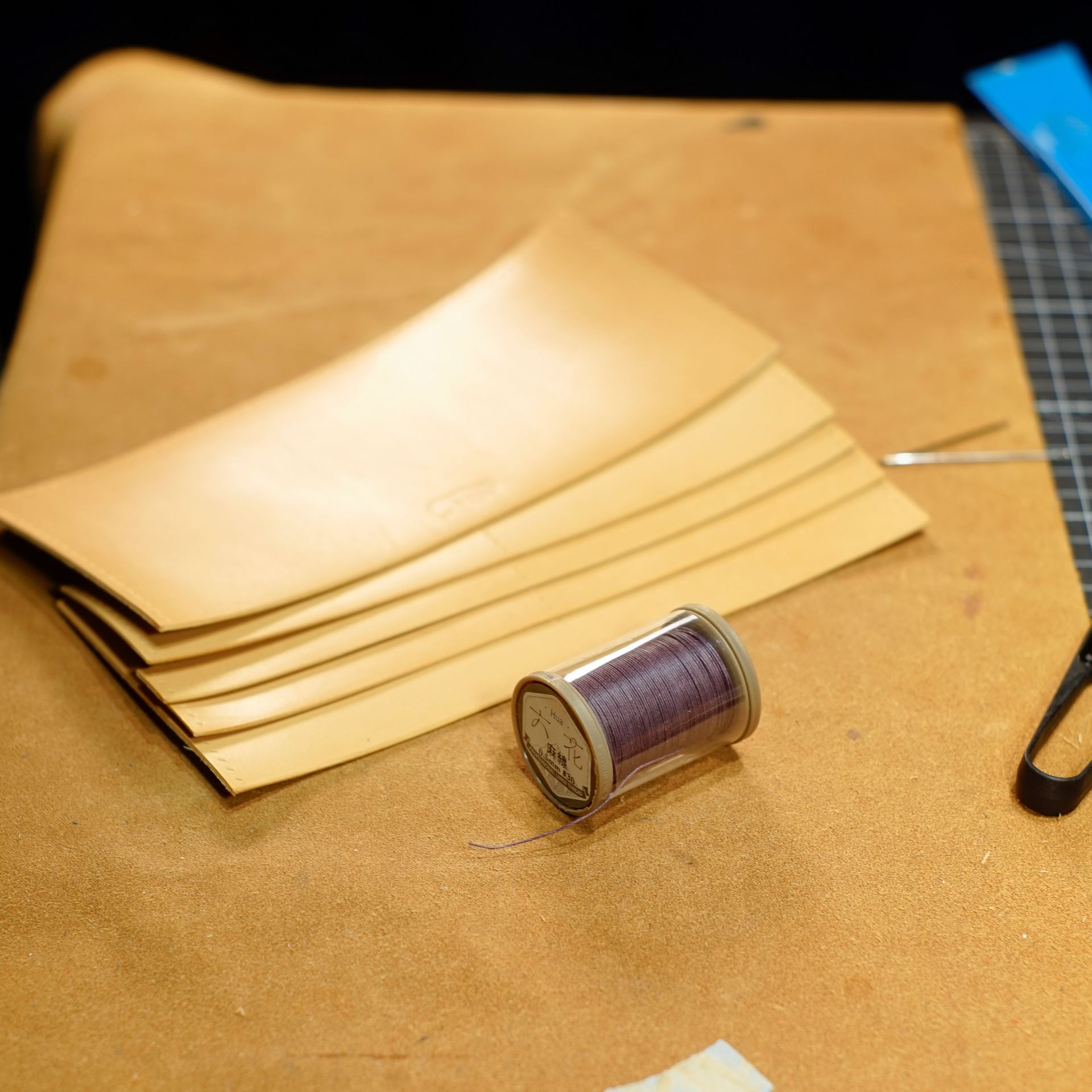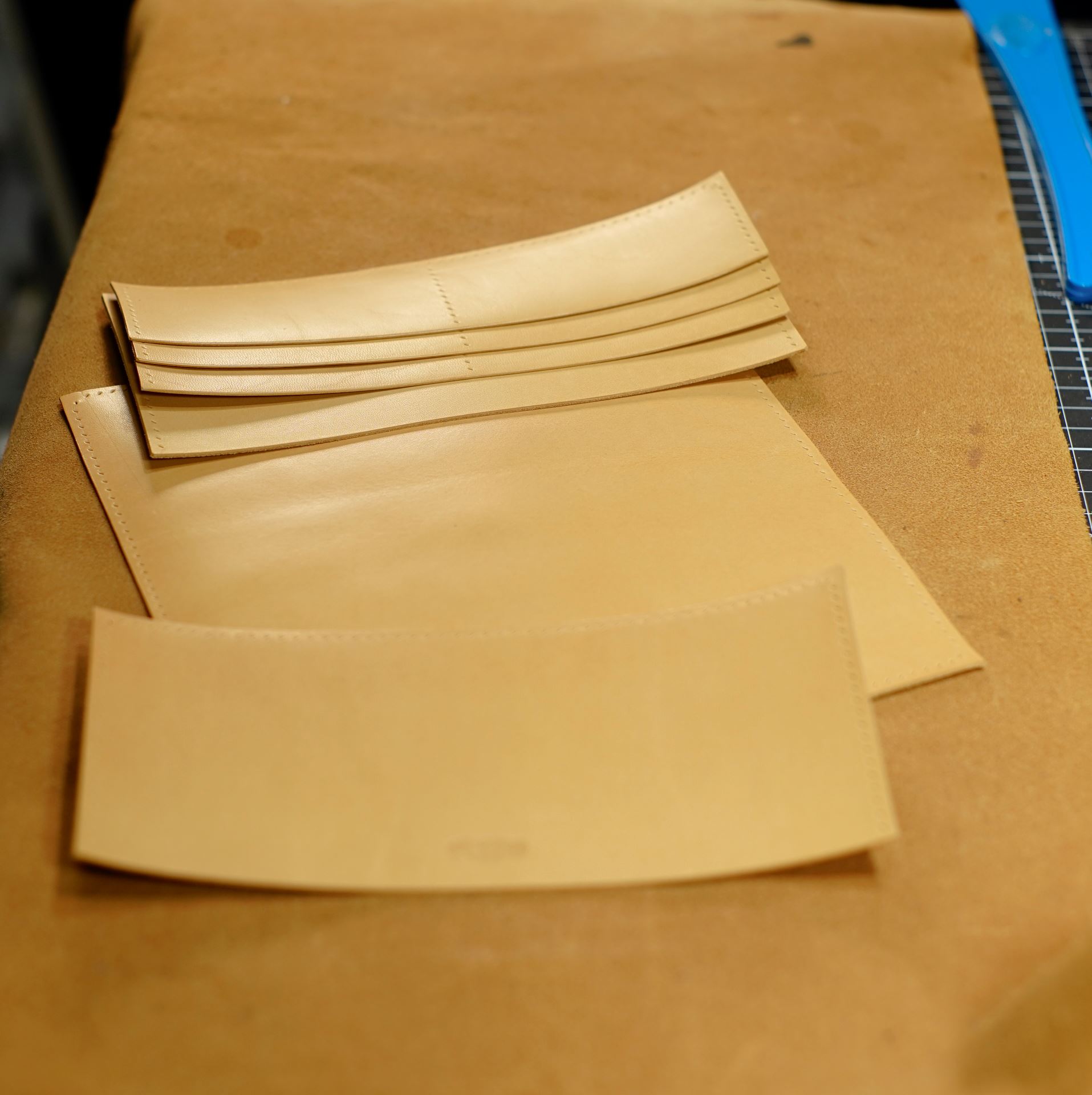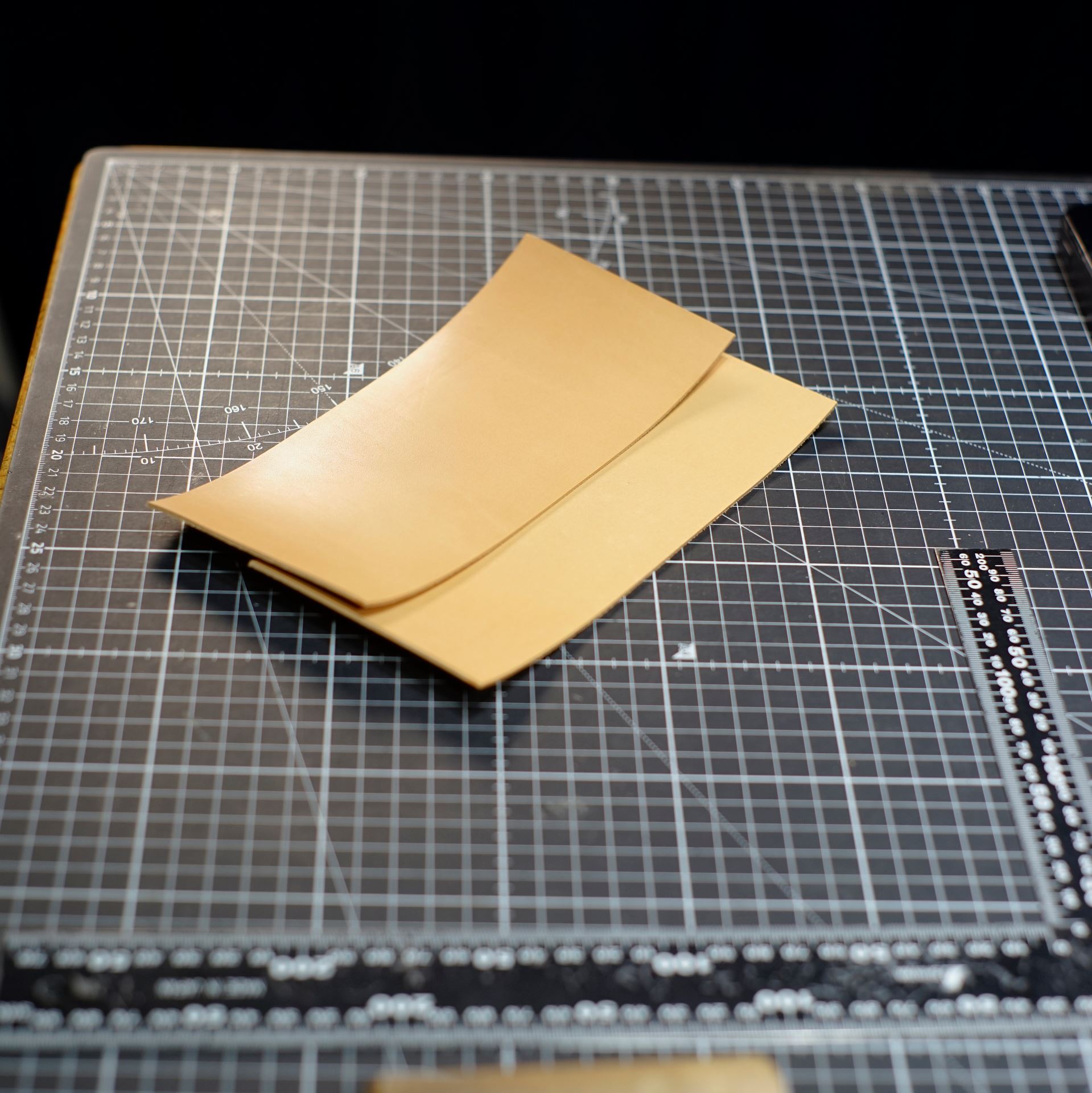 イタリアンハードの生成り革をカットしてパーツを作ります。